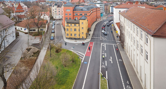 Ulm, Münchner Straße: Nach dem Umbau der Münchner Straße besteht für den KfZ-Verkehr nun eine Spur je Fahrtrichtung. Durch 2,5 Meter breite Radfahrstreifen auf beiden Seiten wurde eine sichere Streckenführung für den Radverkehr erreicht. Es wurde auch eine eigene Linksabbiegespur für den Radverkehr geschaffen, in der Mitte der Fahrbahn, für direktes und sicheres Abbiegen. Mit dieser Maßnahme wurde auch im Hauptroutennetz eine Lücke geschlossen. Die Fertigstellung erfolgt noch 2025. Die Gesamtkosten belaufen sich auf 1,4 Millionen Euro.