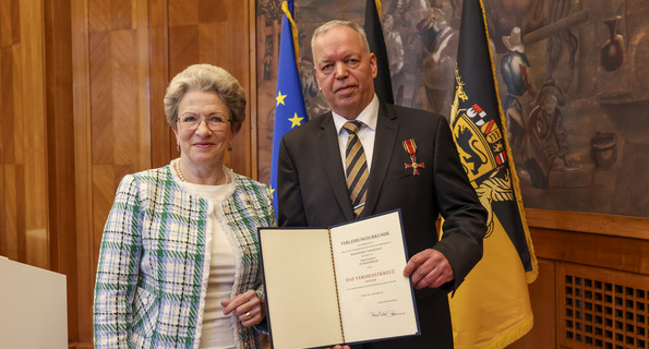 Staatsrätin Barbara Bosch hat Prof. Dr. Bernd Kühlmuß das Bundesverdienstkreuz überreicht und sein herausragendes Engagement gewürdigt.