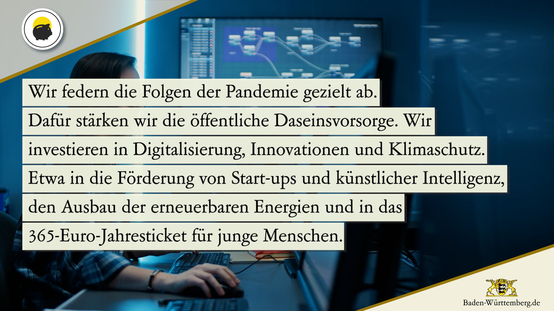 Der vom Ministerrat beschlossene Haushaltsentwurf 2022 legt ein solides Fundament, um robust aus der Corona-Krise zu kommen. Das Land wird keine neuen Kredite aufnehmen und Corona-Schulden abbauen. Daneben sind gezielte Investitionen in Digitalisierung, Innovationen und Klimaschutz vorgesehen.