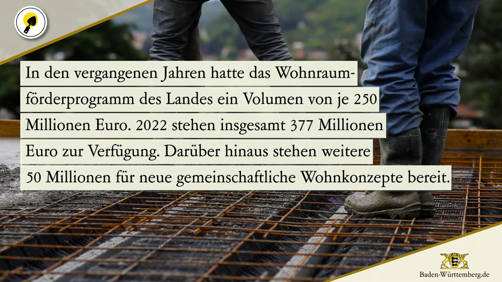 Mit einer erweiterten und effektiveren Förderung für sozialen Wohnungsbau wollen wir mehr bezahlbaren Wohnraum in Baden-Württemberg schaffen. Dafür stehen 2022 mehr Mittel und neue Förderinstrumente zur Verfügung.