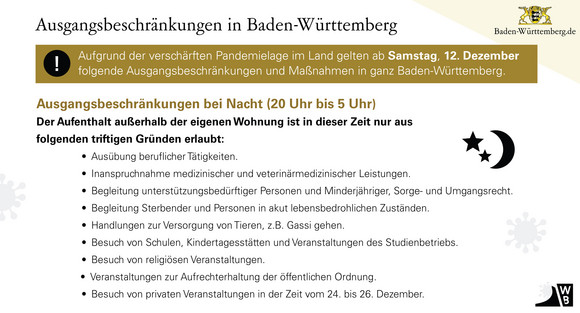 Ab Samstag, 12. Dezember 2020 ist daher der Aufenthalt außerhalb der eigenen Wohnung in der Zeit von 20 bis 5 Uhr nur aus triftigen Gründen erlaubt.
