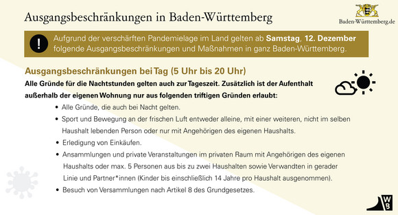 Auch tagsüber wird es ab dem 12. Dezember Ausgangsbeschränkungen geben. Der Aufenthalt außerhalb der eigenen Wohnung ist in der Zeit von 5 bis 20 Uhr ebenfalls nur aus triftigen Gründen erlaubt. Zu den oben genannten Gründen für die Nachtstunden, die auch am Tag gelten, kommen hinzu: