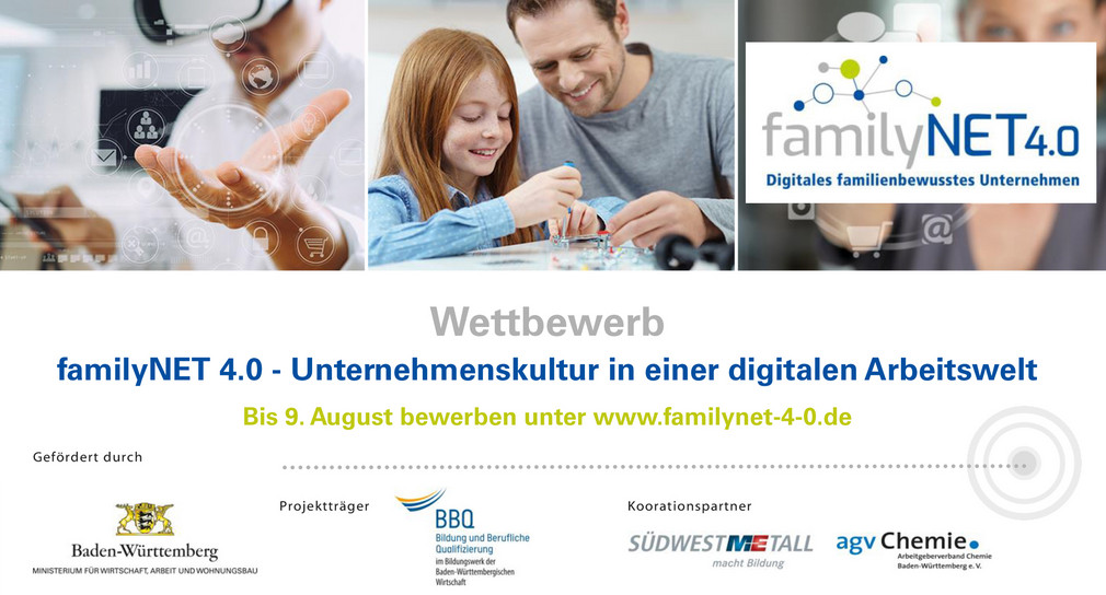 Wir laden Sie herzlich ein, beim ersten landesweiten Wettbewerb „familyNET 4.0 – Unternehmenskultur in einer digitalen Arbeitswelt“ im Rahmen des Modellprojekts familyNET 4.0 mitzumachen. Bewerbungsfrist ist der 8. August.