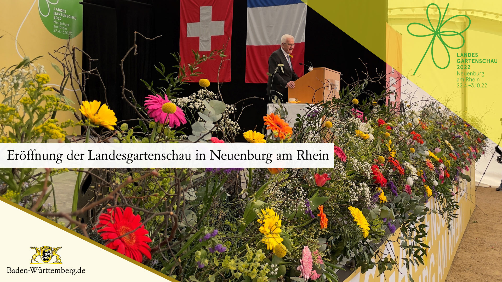 Bei bestem Wetter und in einem bunten Blütenmeer ist die Landesgartenschau in Neuenburg am Rhein (Kreis Breisgau-Hochschwarzwald) am Freitag, 22. April 2022, feierlich eröffnet worden. „Für mich sind die Landesgartenschauen Teil der Erfolgsgeschichte Baden-Württembergs“, sagte Ministerpräsident Winfried Kretschmann. „Sie sind nicht nur schön anzuschauen, sondern bieten auch eine einzigartige Chance, die Natur zurück in die Stadt zu holen.“ Die 29. baden-württembergische Landesgartenschau steht unter dem Motto „Stadt-Land-Fluss: Weil es uns zusammenbringt“.