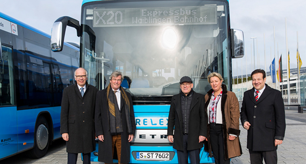 Auf der Piazza der Messe Stuttgart haben der Verband Region Stuttgart und die Firma Schlienz-Tours GmbH und Co. KG die dreizehn nagelneuen RELEX Expressbusse vorgestellt.