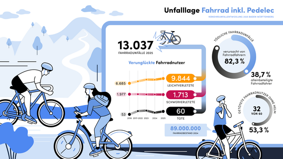 Bei 13.073 Unfällen waren im letzten Jahr Fahrräder und Pedelecs beteiligt. Damit hat die Polizei im Vergleich zum Vorjahr 5,9 Prozent mehr Unfälle registriert (2024: 12.343). 64,3 Prozent der Fahrradunfälle mit Personenschaden haben die Radfahrerinnen und Radfahrer selbst verursacht. Von den 60 tödlich verunglückten Radlerinnen und Radlern (2024: 57) waren fast zwei Drittel mit einem Pedelec unterwegs. Über die Hälfte trug keinen Fahrradhelm. Eine positive Entwicklung zeigte sich bei den schwerverletzten Fahrradfahrerinnen und -fahrern. Hier gab es 5,8 Prozent weniger Schwerverletzte als im Jahr 2024 (2024: 1.818; 2025: 1.713).