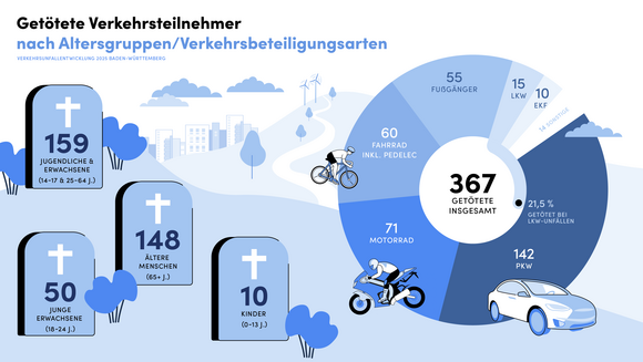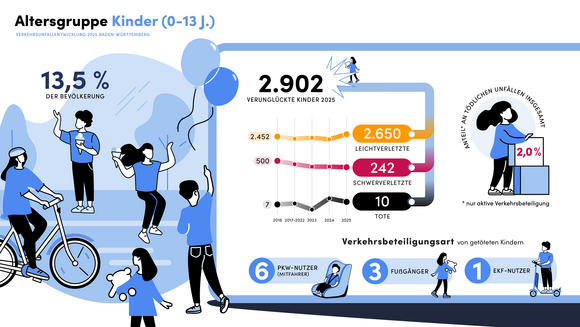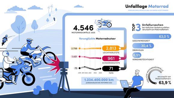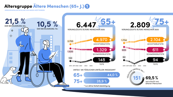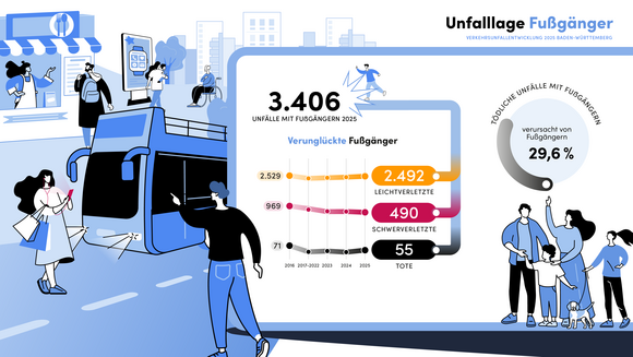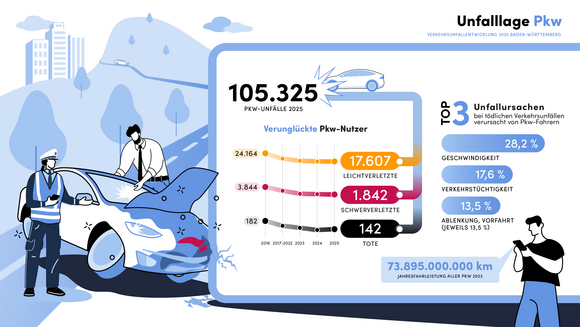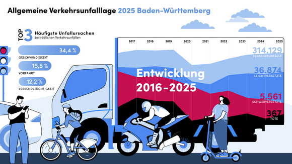 Im Jahr 2025 ereigneten sich in Baden-Württemberg insgesamt 314.129 Verkehrsunfälle (2024: 312.105; plus 0,6 Prozent). Bei neun von zehn Unfällen blieb es bei Sachschäden. Insgesamt 42.802 Personen wurden bei Verkehrsunfällen verletzt (plus 1,6 Prozent). 367 Personen verstarben bei einem Verkehrsunfall, 7,9 Prozent mehr als 2024 (340). Gleichzeitig sinkt mit 5.561 die Anzahl der Schwerverletzten erneut auf einen historischen Tiefstand (2024: 5.950; minus 6,5 Prozent). Im Vergleich zum Zehnjahreshöchststand von 2017 hat sich die Anzahl der Verkehrstoten um 20 Prozent (2017: 458, 2025: 367) und die Anzahl der Schwerverletzten um rund 40 Prozent (2016: 8.992, 2025: 5.561) reduziert.