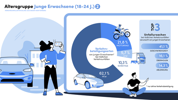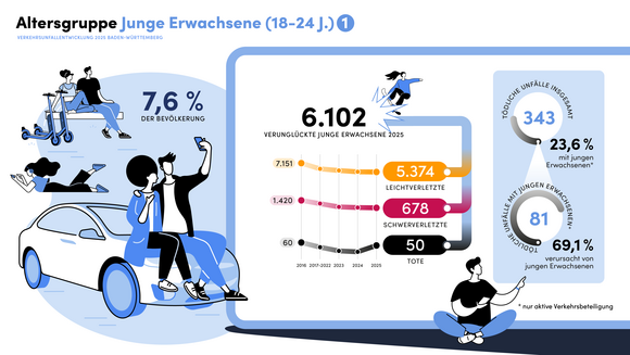 Das Unfallaufkommen von jungen Fahrerinnen und Fahrern (18 bis 24 Jahre) lag 2025 mit 21.284 Verkehrsunfällen in etwa auf dem Vorjahresniveau. Das sind in den letzten zehn Jahren rund 23 Prozent weniger Unfälle (2016: 27.623). Der deutliche Rückgang zeigt sich auch bei den Unfallfolgen: So gab es rund 25 Prozent weniger Leichtverletzte (2016: 7.151; 2025: 5.374) und 52 Prozent weniger schwerverletzte junge Erwachsene (2016: 1.420; 2025: 678). Mit 50 jungen Erwachsenen verunglückten auf den Straßen in Baden-Württemberg 19 mehr als im Jahr 2024 tödlich. Vier von zehn tödlichen Verkehrsunfällen sind auf zu schnelles Fahren zurückzuführen. Bei weiteren 14 Prozent der tödlichen Verkehrsunfälle spielte Ablenkung eine Rolle. „Rasen kann das Leben kosten. Jeder Stundenkilometer zu schnell, jede Unachtsamkeit kann über Leben oder Tod entscheiden. Dafür müssen wir besonders junge Menschen sensibilisieren. Und das tun wir mit gezielten Präventionsveranstaltungen an Schulen und Hochschulen“, führte Minister Thomas Strobl aus.