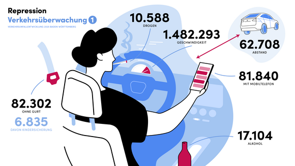 Rund 1,5 Millionen Geschwindigkeitsverstöße hat die Polizei im vergangenen Jahr erfasst. Fast 28.000 Fahrten unter Alkohol-, Drogen- oder Medikamenteneinfluss hat die Polizei verfolgt. Zudem stellte die Polizei rund 82.000 Handyverstöße, mehr als 82.000 Verstöße gegen die Gurt- und Kindersicherungspflicht sowie knapp 63.000 Abstandsverstöße fest. „Die polizeiliche Verkehrsüberwachung setzt an der Wurzel an – dort, wo es nötig ist: bei den Ursachen schwerer Verkehrsunfälle. Das ist kein Selbstzweck, sondern dient der Sicherheit aller“, erläuterte der Minister.