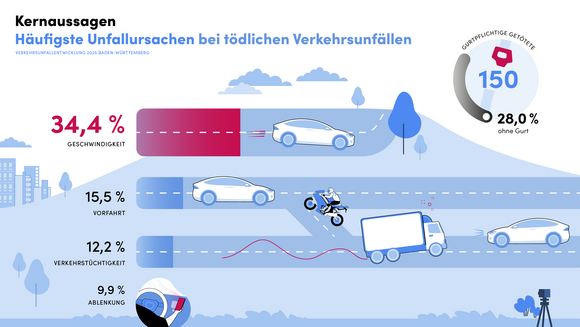 Rund jeder dritte tödliche Verkehrsunfall ist auf zu schnelles Fahren zurückzuführen. Damit bleibt überhöhte oder nicht angepasste Geschwindigkeit die Unfallursache Nummer 1 für tödliche Verkehrsunfälle auf den Straßen in Baden-Württemberg. Im vergangenen Jahr starben 129 Menschen bei Unfällen aufgrund zu hoher Geschwindigkeit. 55 Menschen starben in Folge einer Vorfahrts- beziehungsweise Vorrangsverletzung. Mangelnde Verkehrstüchtigkeit führte zu 46 Verkehrstoten, 36 Menschen verloren ihr Leben aufgrund von Ablenkung, zum Beispiel durch ein Handy. 42 von 150 gurtpflichtigen Getöteten waren zum Unfallzeitpunkt nicht oder nicht richtig angeschnallt. „Meistens sind es ganz einfache Verhaltensweisen, die uns im Straßenverkehr besser schützen. Deshalb gilt: Schnallen Sie sich an! Fahren Sie nicht zu schnell! Finger weg vom Handy! Bleiben Sie nüchtern und klar! Und tragen Sie einen Helm! Damit können Sie Leben retten, sogar Ihr eigenes“, betonte Innenminister Thomas Strobl.