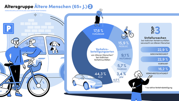 Bei der Betrachtung der tödlichen Verkehrsunfälle zeigt sich eine Zunahme im Bereich der Seniorinnen und Senioren. Im Vergleich zum Vorjahr kamen 21 Seniorinnen und Senioren mehr bei Verkehrsunfällen ums Leben (2024: 127; 2025: 148; plus 16,5 Prozent). Dabei verunglückten 25 Prozent der getöteten Seniorinnen und Senioren beim Führen eines Fahrrads oder Pedelecs – nahezu die Hälfte davon war ohne Helm unterwegs. Die Anzahl der Schwerverletzten befindet sich mit 1.329 auf dem Vorjahresniveau (2024: 1.326). „Mit der Kampagne ‚SICHER fit UNTERWEGS‘ unterstützen wir unsere Seniorinnen und Senioren dabei, möglichst lange mobil zu bleiben und sich vor Unfällen zu schützen. So kann etwa jede und jeder mit dem Tragen eines Helms zum eigenen Schutz beitragen und schwere Unfallfolgen vermeiden“, erklärte Innenminister Thomas Strobl.