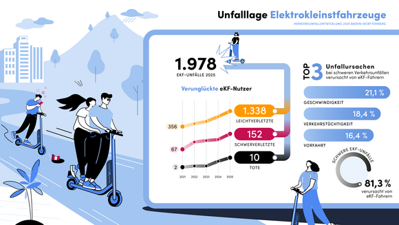 Die weiterhin steigende Beliebtheit von Elektro(E)-Scootern oder Segways, die die Polizei in der Statistik als Elektrokleinstfahrzeuge erfasst, macht sich auch in der Verkehrsunfallstatistik bemerkbar. Die Anzahl der Verkehrsunfälle mit Beteiligung eines E-Scooters oder Segways stieg um 35 Prozent auf 1.978 Fälle an. Das sind im Vergleich zum Vorjahr 513 Unfälle mehr (2024: 1.465). 70,1 Prozent der Verkehrsunfälle haben die Fahrerinnen und Fahrer selbst verursacht. Insgesamt verunglückten 34,2 Prozent mehr Menschen bei der Nutzung von Elektrokleinstfahrzeugen (2024: 1.118; 2025: 1.500), davon 1.338 leicht (2024: 990; plus 35,2 Prozent) und 152 schwer (2024: 121; plus 25,6 Prozent). Zehn Menschen, alle auf dem E-Scooter unterwegs, verloren ihr Leben (2024: 7). Neun der zehn Getöteten trugen keinen Helm. Bei rund 14,7 Prozent aller Unfälle mit E-Scootern oder Segways war eine mangelnde Verkehrstüchtigkeit unfallursächlich. „E-Scooter sind kein Spielzeug – das spiegelt sich leider auch in den Zahlen wider. Wer E-Scooter nutzt, trägt Verantwortung – für ein Kraftfahrzeug, für sich selbst und für andere. Das muss in die Köpfe rein. Deshalb geben Sie acht, auf sich und andere, und halten Sie sich an die Regeln. Nur so können Unfälle vermieden werden“, betonte Minister Thomas Strobl.