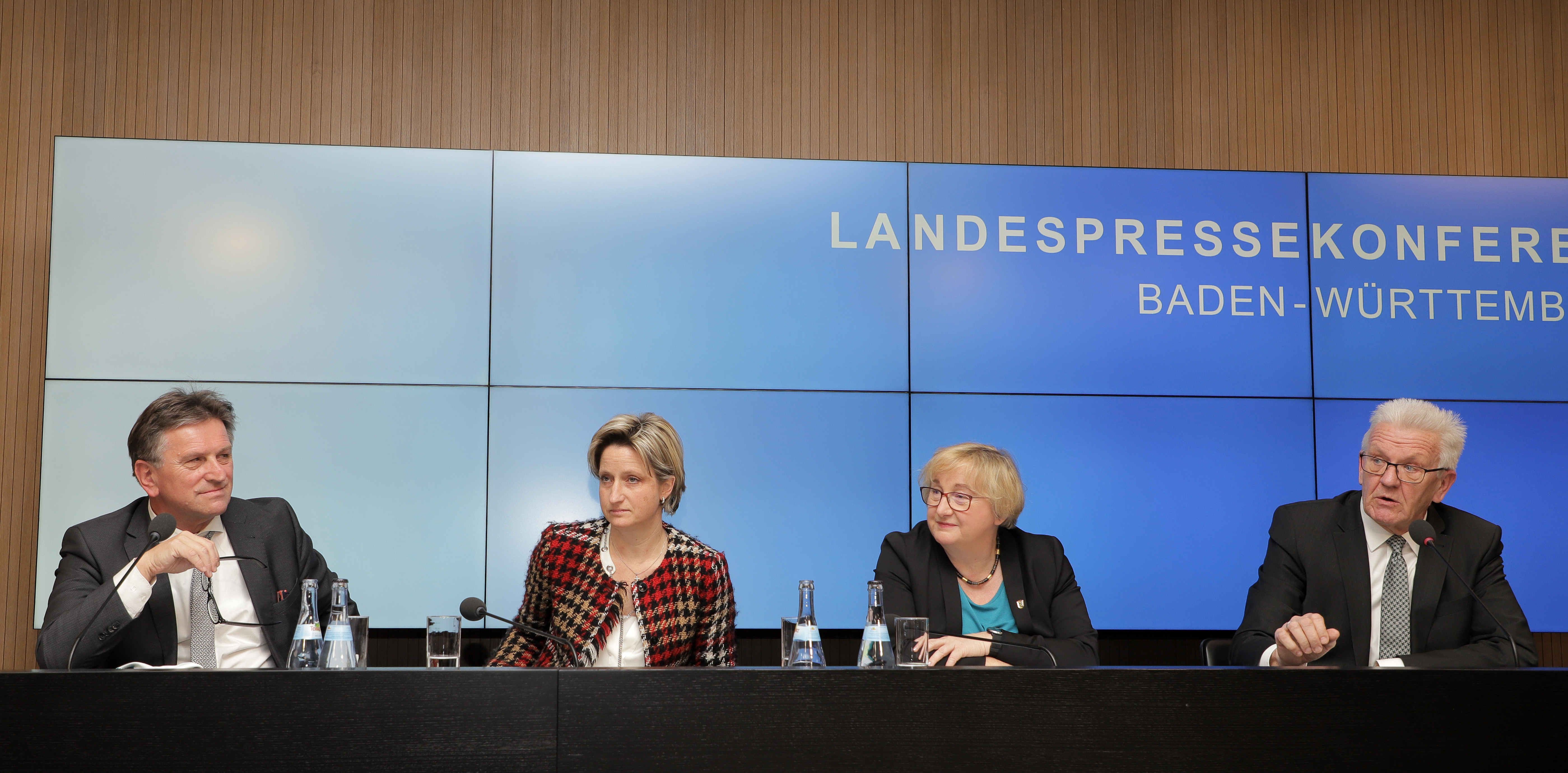 Ministerpräsident Winfried Kretschmann, Sozial- und Integrationsminister Manne Lucha, Wirtschaftsministerin Dr. Nicole Hoffmeister-Kraut und Wissenschaftsministerin Theresia Bauer haben in der Regierungspressekonferenz in Stuttgart über die Förderung von Projekten aus dem Forum Gesundheitsstandort gesprochen und Fragen der Journalisten beantwortet.