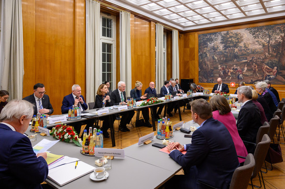Ministerpräsident Winfried Kretschmann, Staatssekretär Florian Hassler und weitere Mitglieder der Landesregierung haben sich am Dienstag, 28. November 2023, in der Villa Reitzenstein in Stuttgart mit Vertreterinnen und Vertretern der Regierungen der Schweizer Grenzkantone Basel-Stadt, Basel-Landschaft, Aargau, Schaffhausen, Thurgau, St. Gallen und Zürich ausgetauscht. In dem Gespräch ging es um politische Schwerpunktthemen, die in die Schweiz-Strategie des Landes einfließen sollen. Dabei standen die verstärkte Zusammenarbeit bei Technologien wie Künstliche Intelligenz und der Ausbau von Hochschulkooperationen im Fokus. Weitere Themen waren Energie, Klimaschutz und Wasserstoff, grenzüberschreitende Mobilität und Migration.