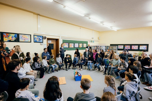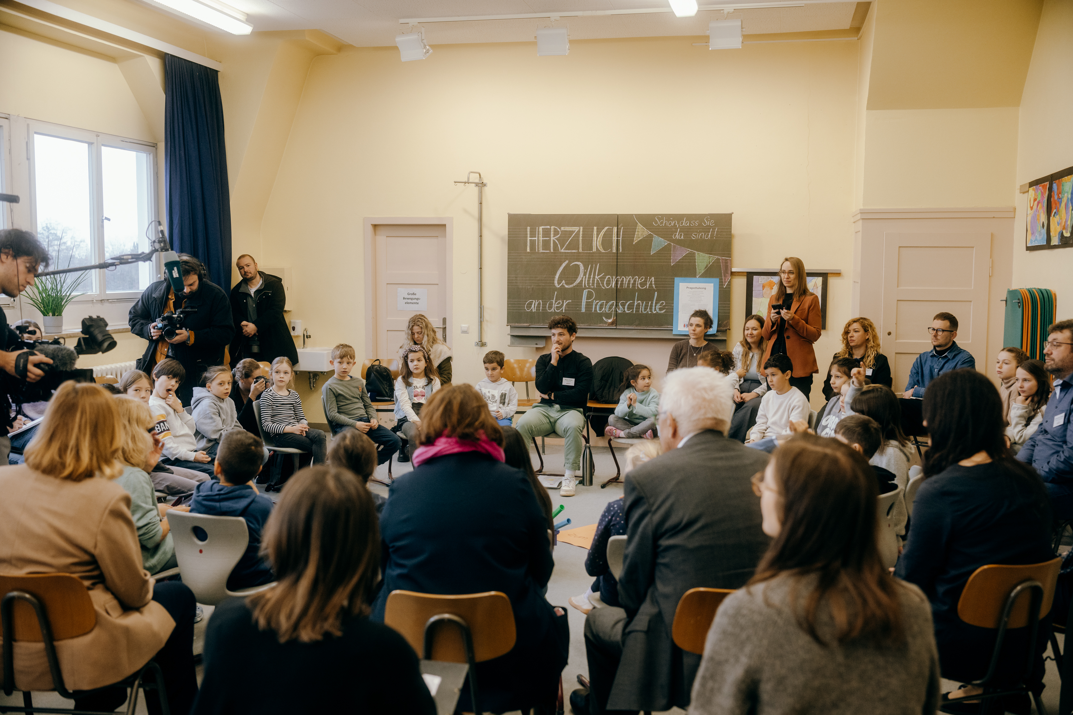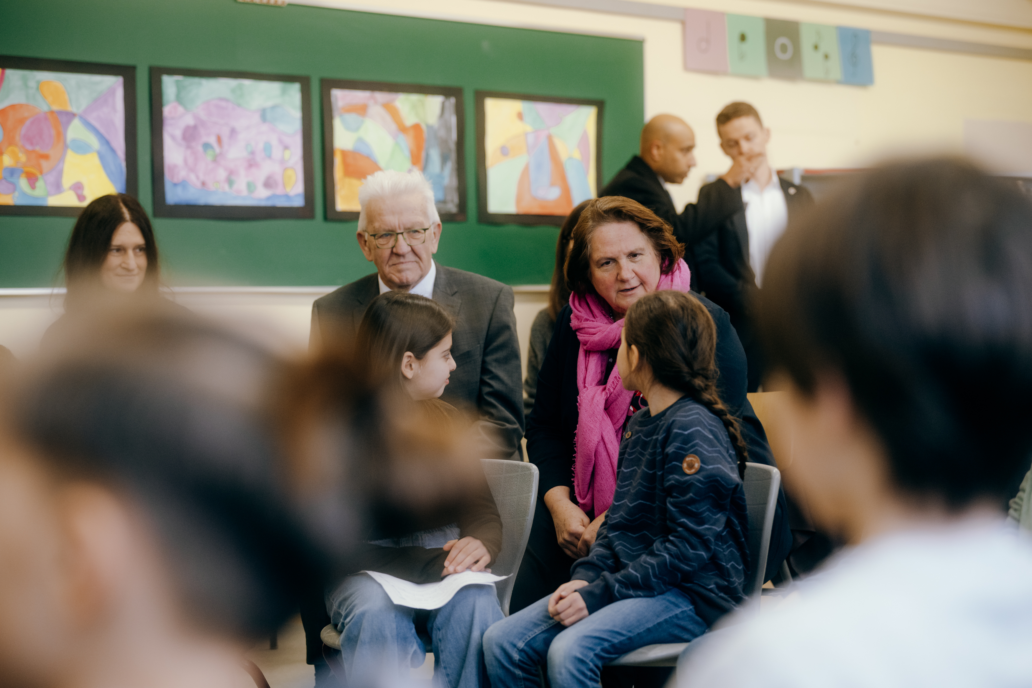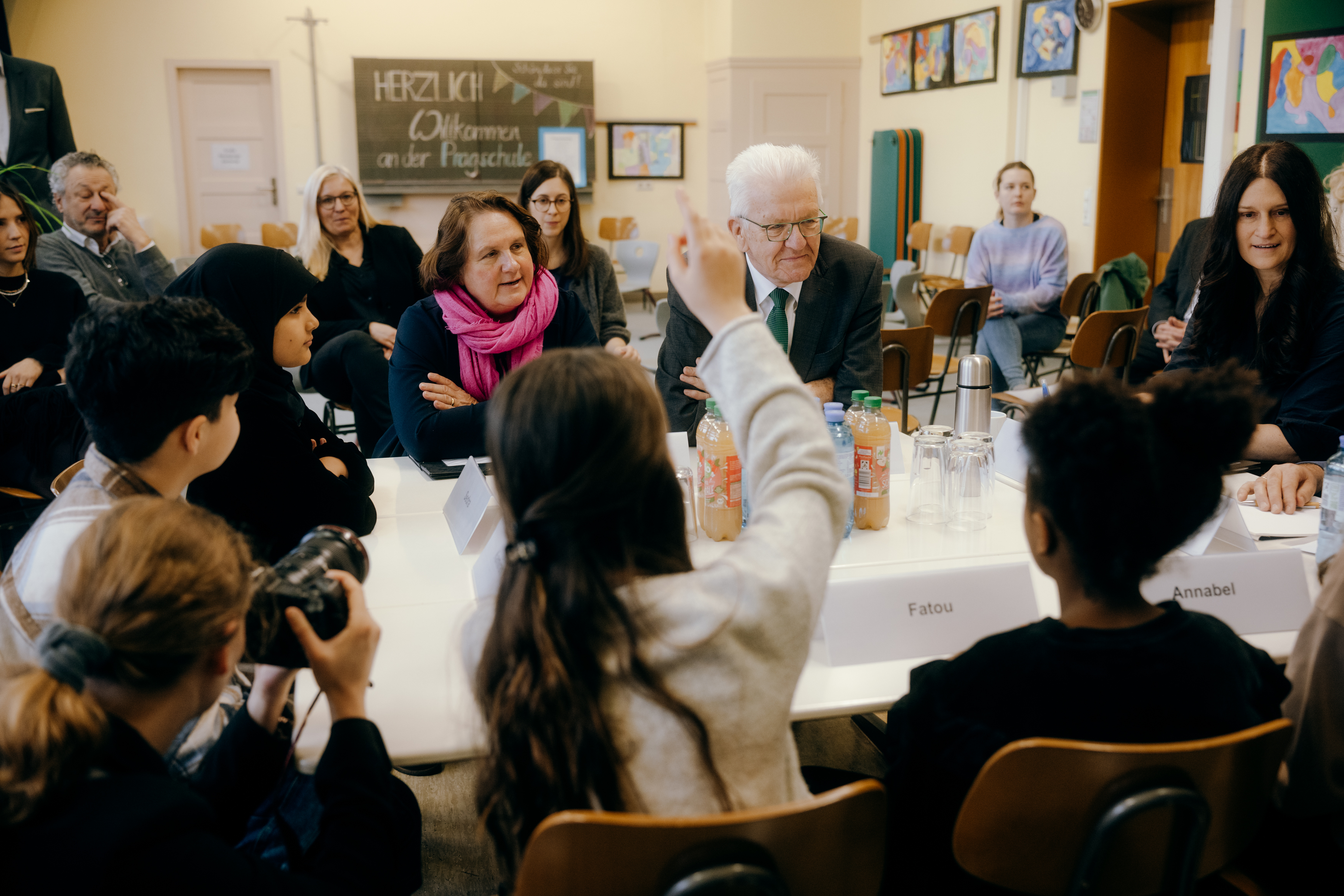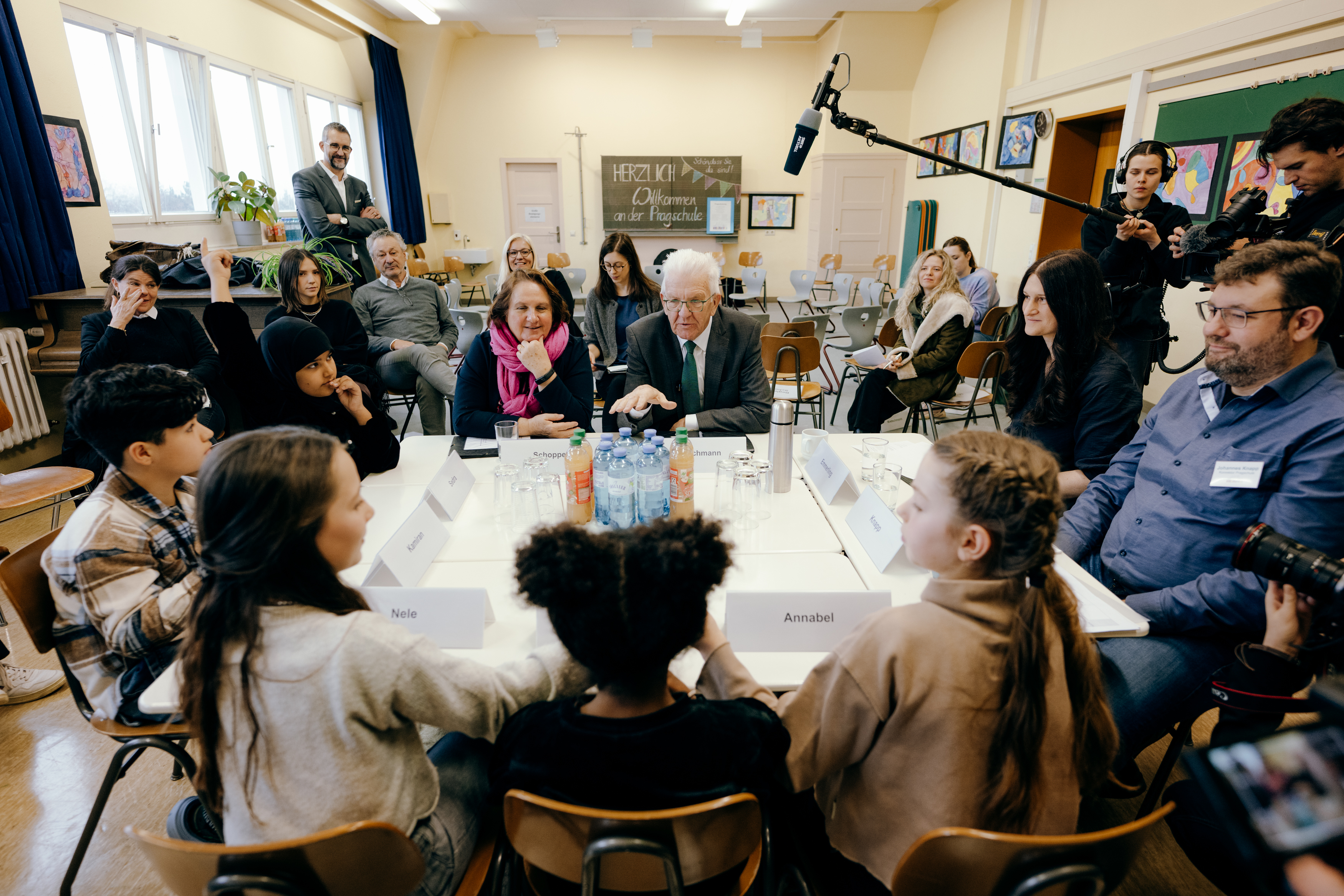 Ministerpräsident Winfried Kretschmann und Kultusministerin Theresa Schopper haben sich an der Pragschule in Stuttgart gemeinsam mit Schülerinnen und Schülern, Lehrkräften und Eltern zu den Bildungsreformen ausgetauscht. Schwerpunktthemen waren die Sprachförderung und die Demokratiebildung.
