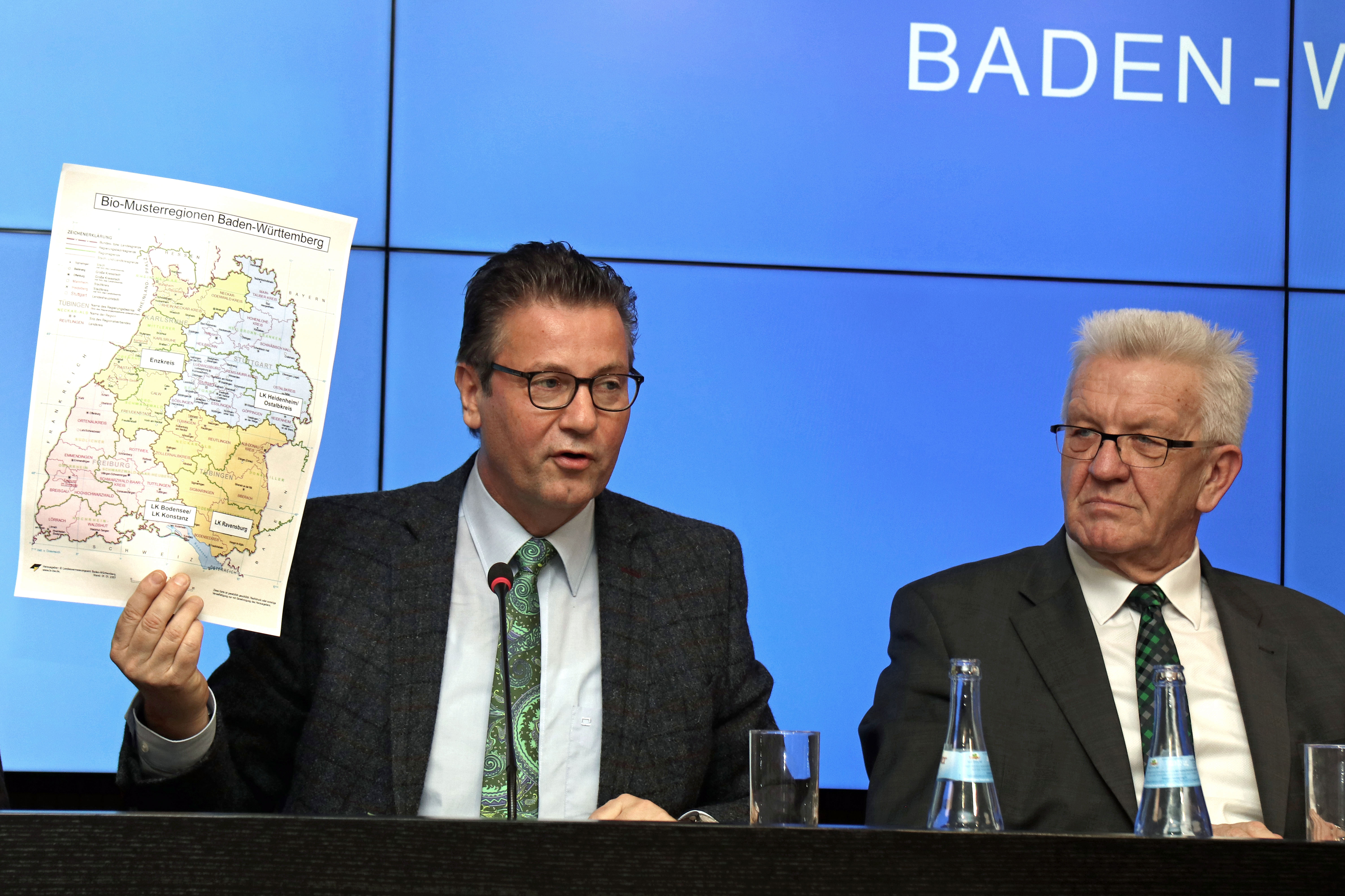 Ministerpräsident Winfried Kretschmann und Landwirtschaftsminister Peter Hauk haben in der Regierungspressekonferenz in Stuttgart die „Bio-Musterregionen Baden-Württemberg“ vorgestellt und Fragen der Journalisten beantwortet.