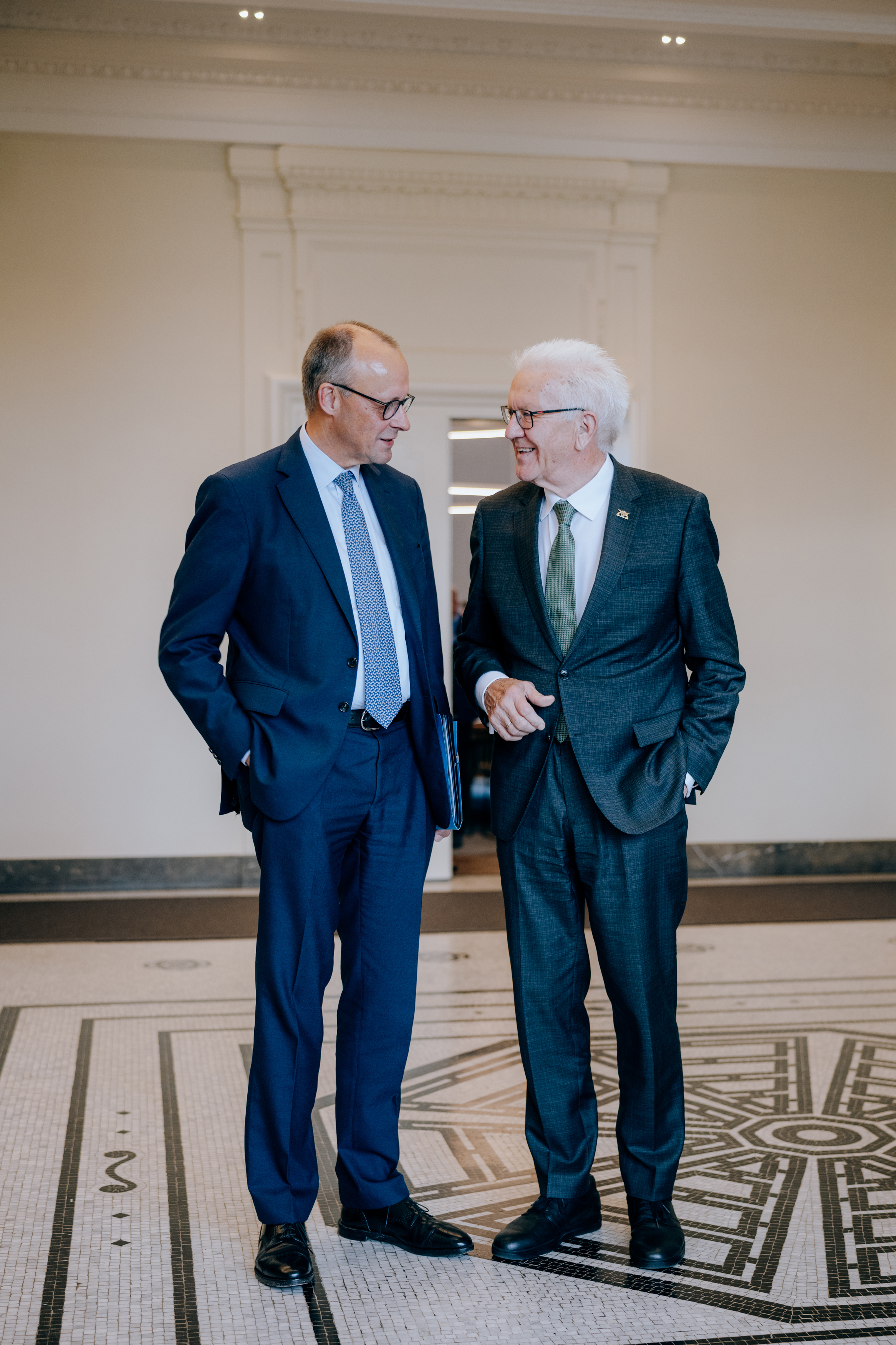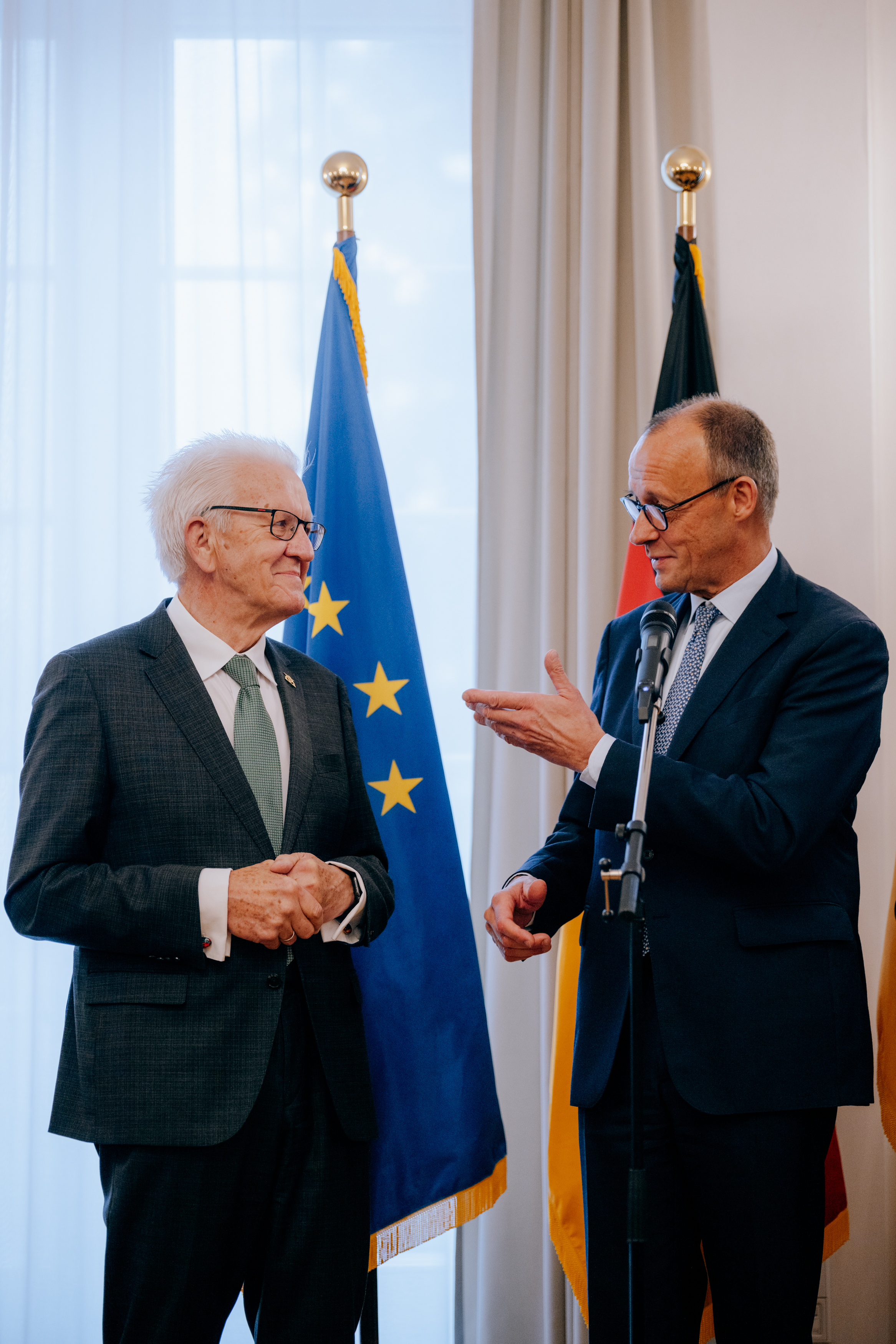 Ministerpräsident Winfried Kretschmann (links) und Bundeskanzler Friedrich Merz (rechts)
