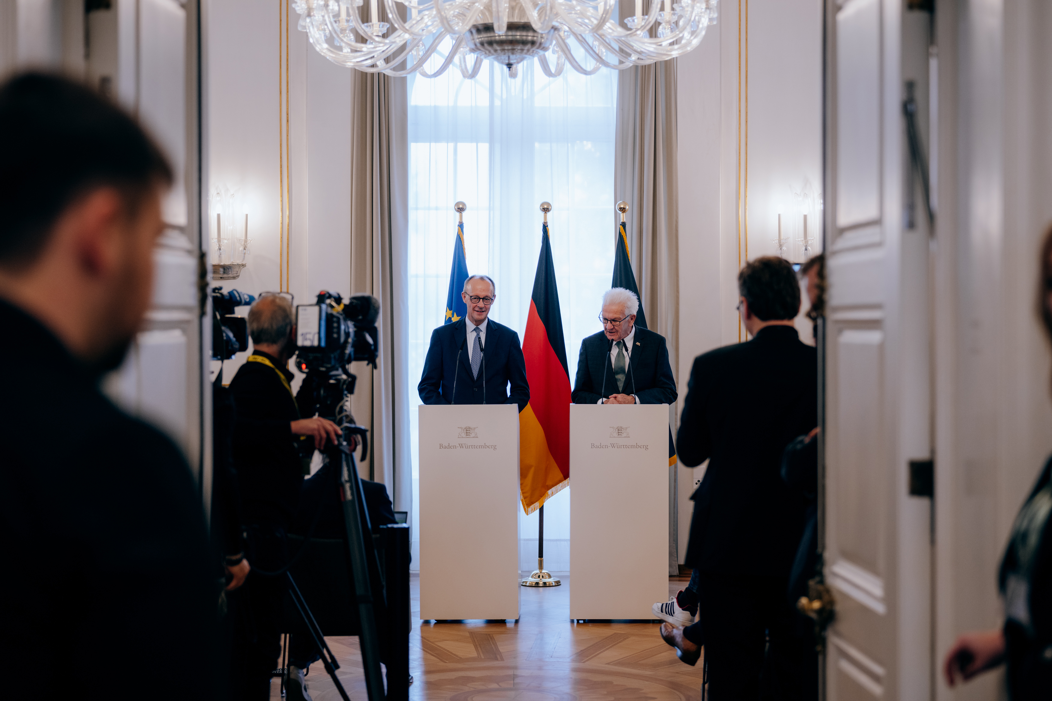 Presseerklärungen von Bundeskanzler Friedrich Merz (links) und Ministerpräsident Winfried Kretschmann (rechts)