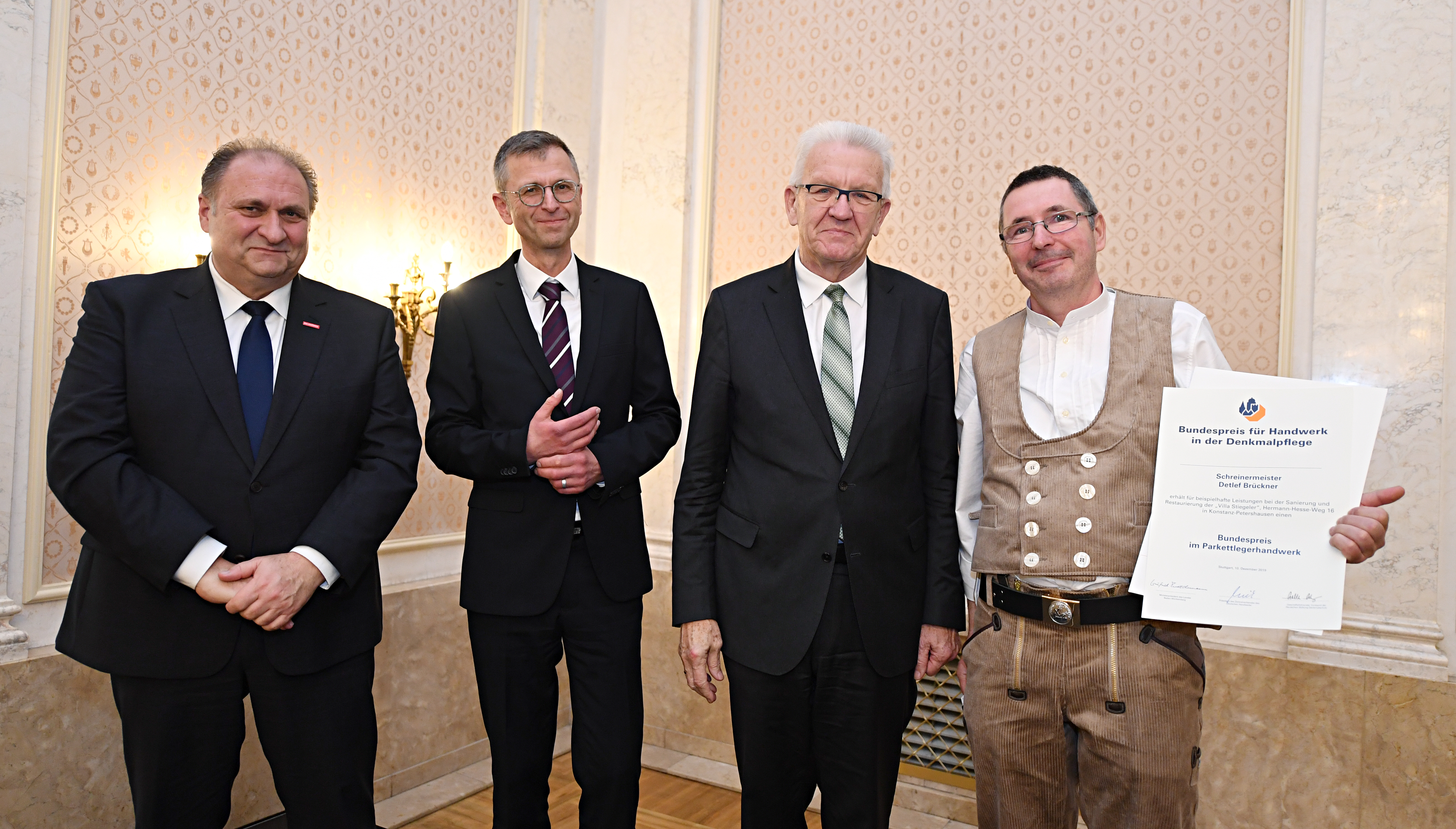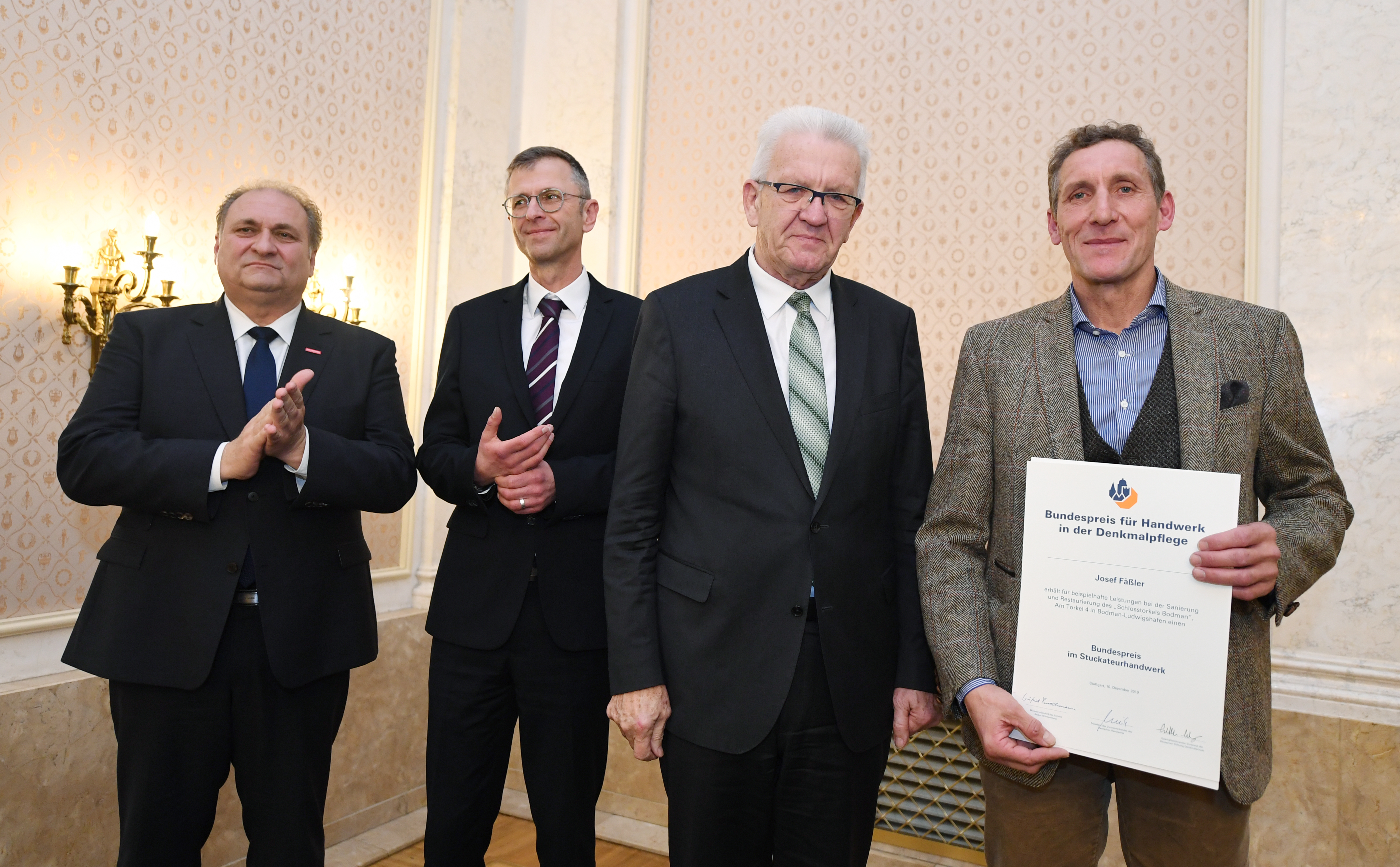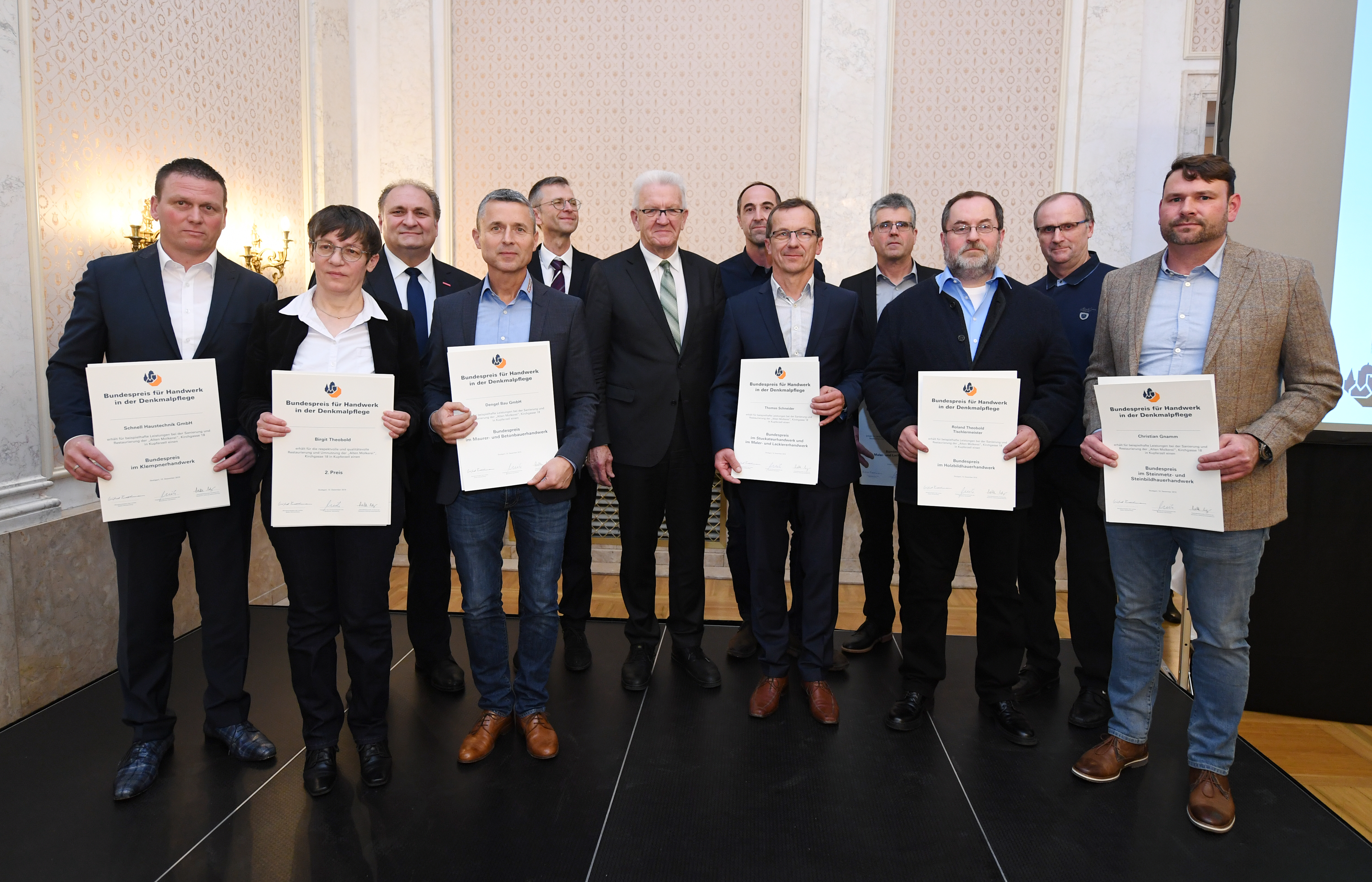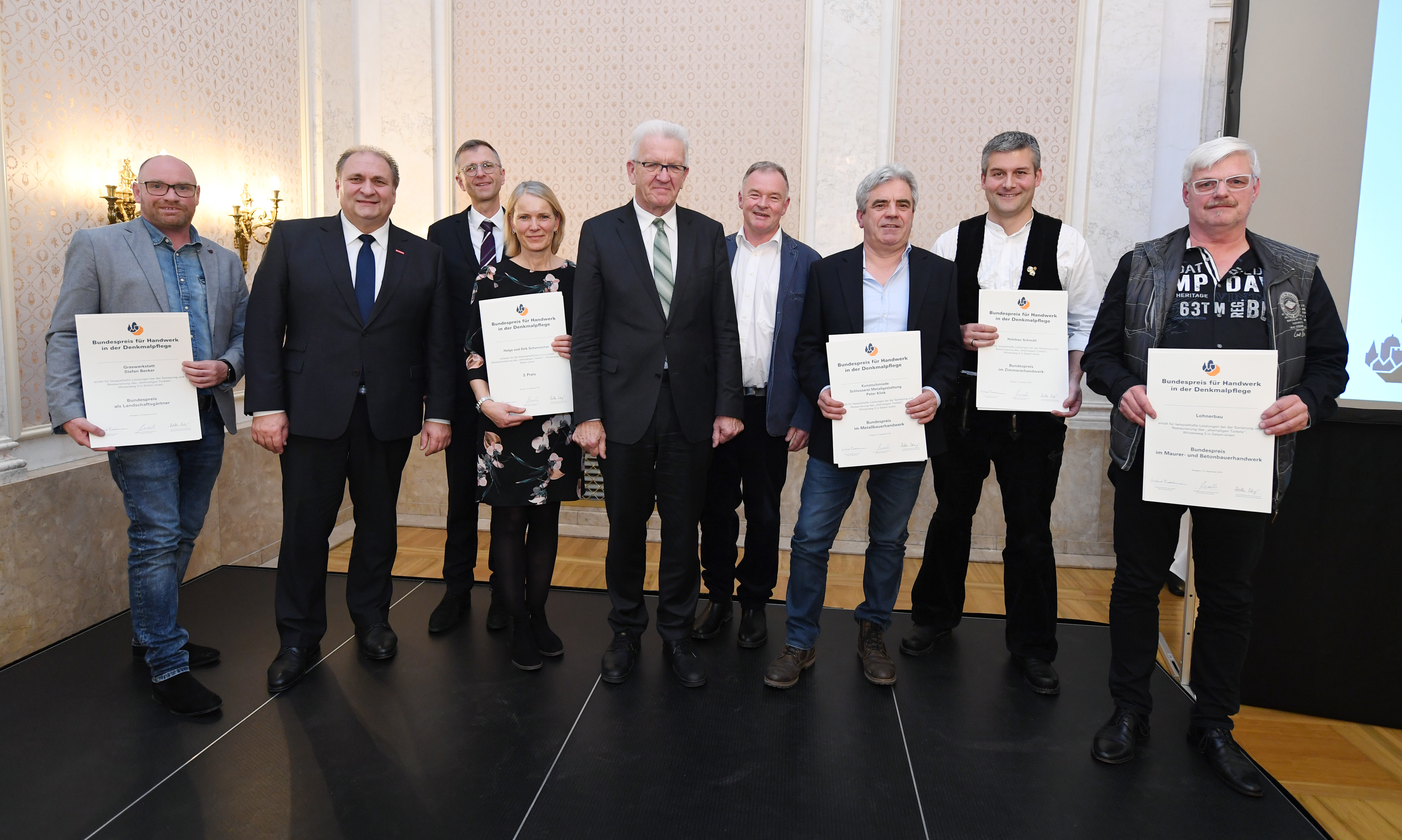 Ministerpräsident Winfried Kretschmann lud anlässlich der Verleihung des Bundespreises für Handwerk in der Denkmalpflege ins Neue Schloss in Stuttgart. Der Preis wird seit 1993 für beispielhafte Leistungen in der Baudenkmalpflege verliehen.