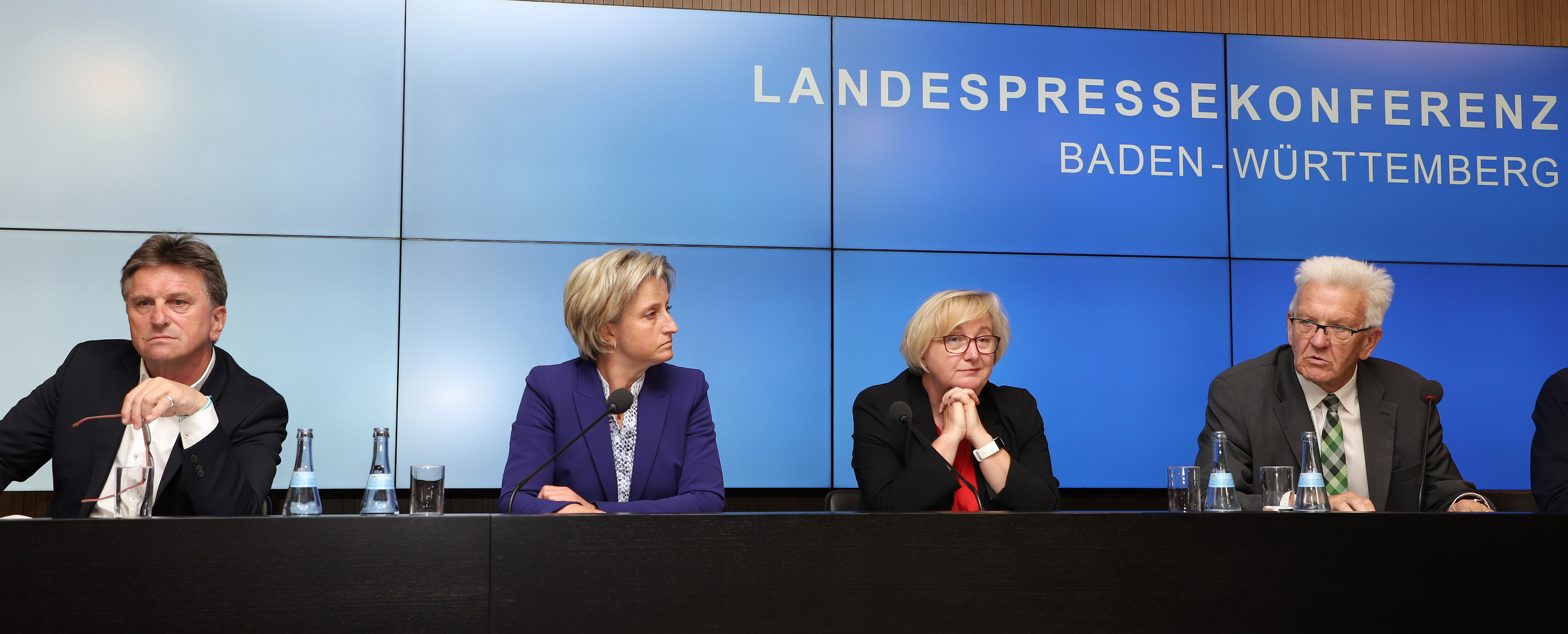 Ministerpräsident Winfried Kretschmann, Wissenschaftsministerin Theresia Bauer, Wirtschaftsministerin Nicole Hoffmeister-Kraut und Gesundheitsminister Manne Lucha haben in der Regierungspressekonferenz in Stuttgart über das Forum Gesundheitsstandort Baden-Württemberg berichtet und Fragen der Journalisten beantwortet.