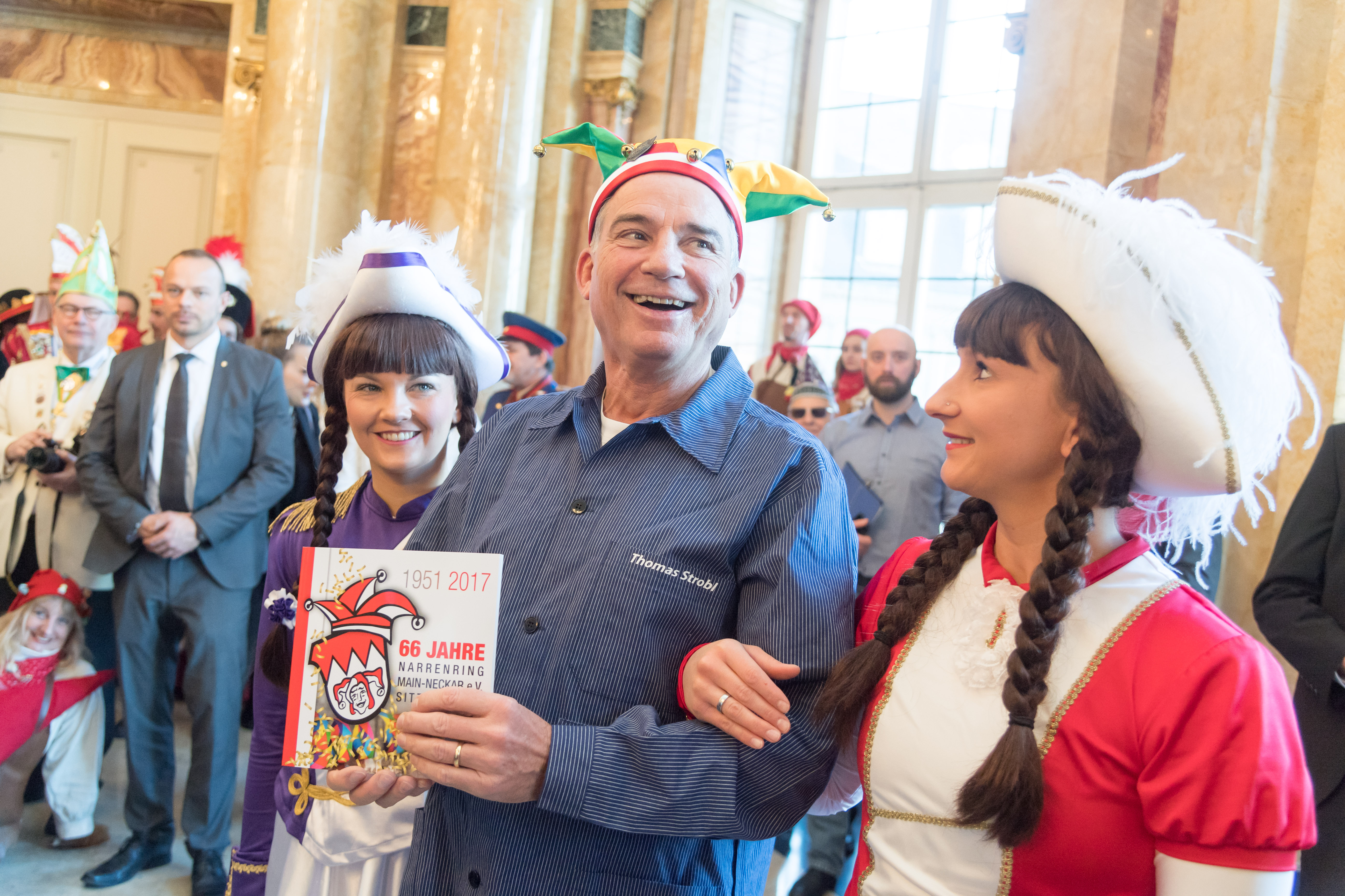 Innenminister Thomas Strobl hat, in Vertretung für Ministerpräsident Winfried Kretschmann, Karnevalisten des Landesverbands Württembergische Karnevalsvereine e. V., der Vereinigung Badisch-Pfälzischer Karnevalsvereine e. V. und des Narrenrings Main-Neckar e. V. im Neuen Schloss in Stuttgart empfangen.