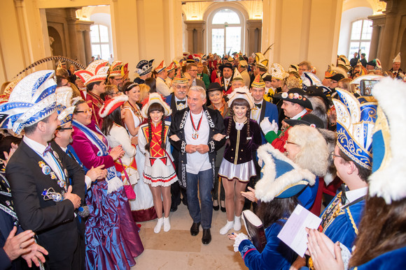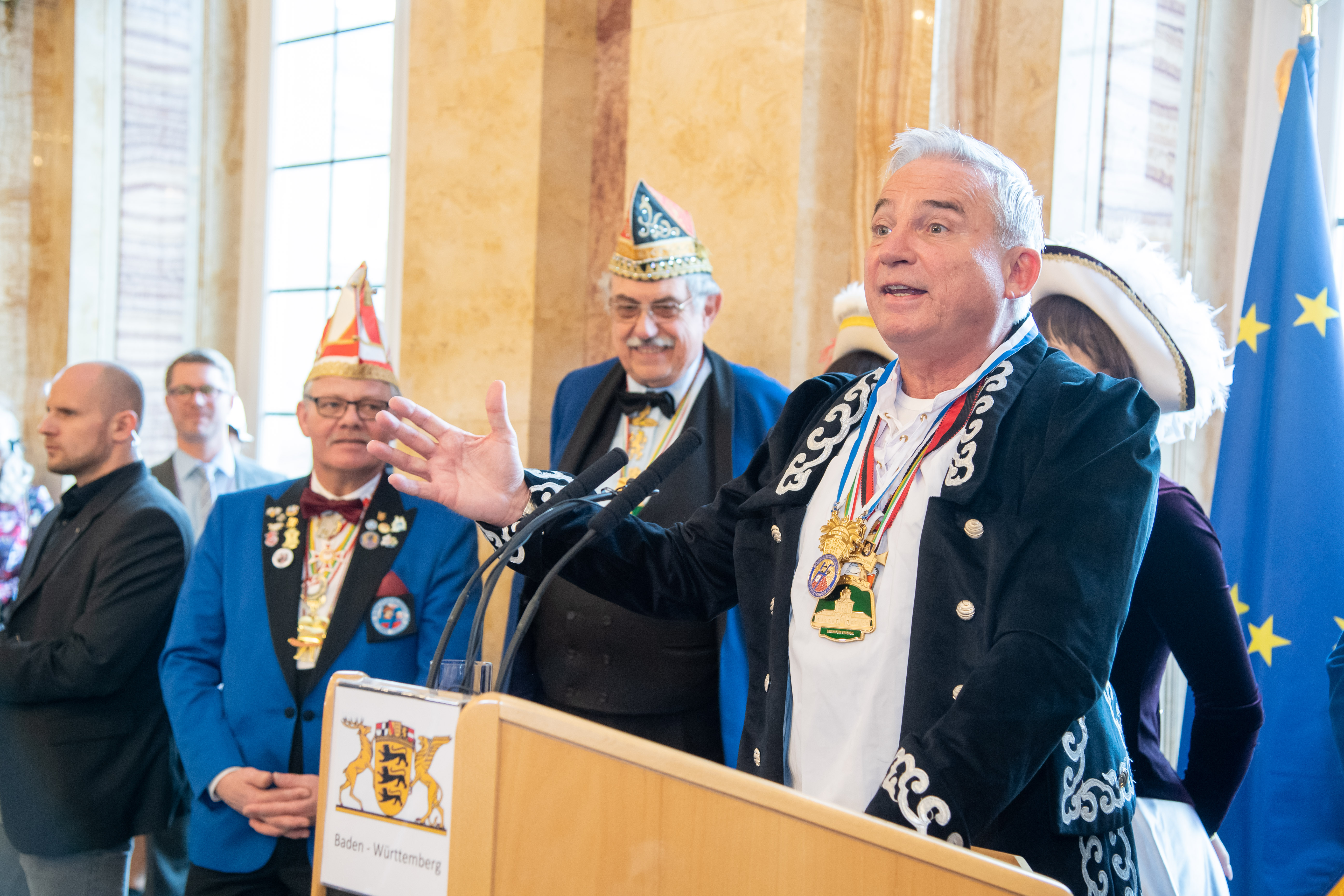 Innenminister Thomas Strobl hat in Vertretung von Ministerpräsident Winfried Kretschmann rund 600 Karnevalisten des Landesverbands Württembergische Karnevalsvereine e.V., der Vereinigung Badisch-Pfälzischer Karnevalsvereine e.V. sowie des Narrenrings Main-Neckar e.V. im Neuen Schloss in Stuttgart empfangen.