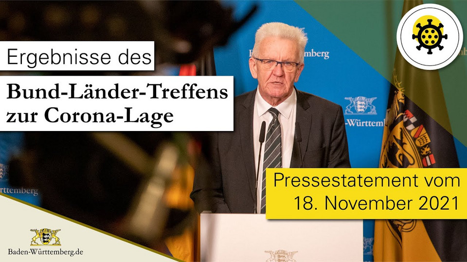 Ministerpräsident Winfried Kretschmann hat die Ergebnisse des Bund-Länder-Treffen und das weitere Vorgehen für Baden-Württemberg vorgestellt. Er ruft erneut dazu auf, sich impfen zu lassen. Baden-Württemberg wird zudem die Regeln in einigen Bereichen nochmal verschärfen. Der Bund führt 3G am Arbeitsplatz und im Nah- und Fernverkehr ein. Zudem führt der Bund wieder die Homeofficepflicht ein.