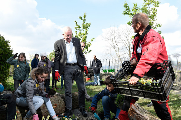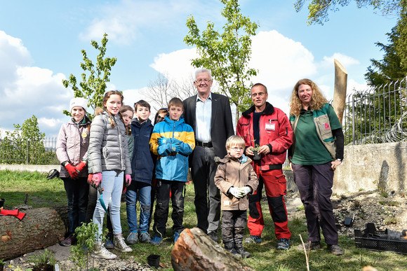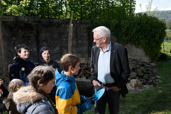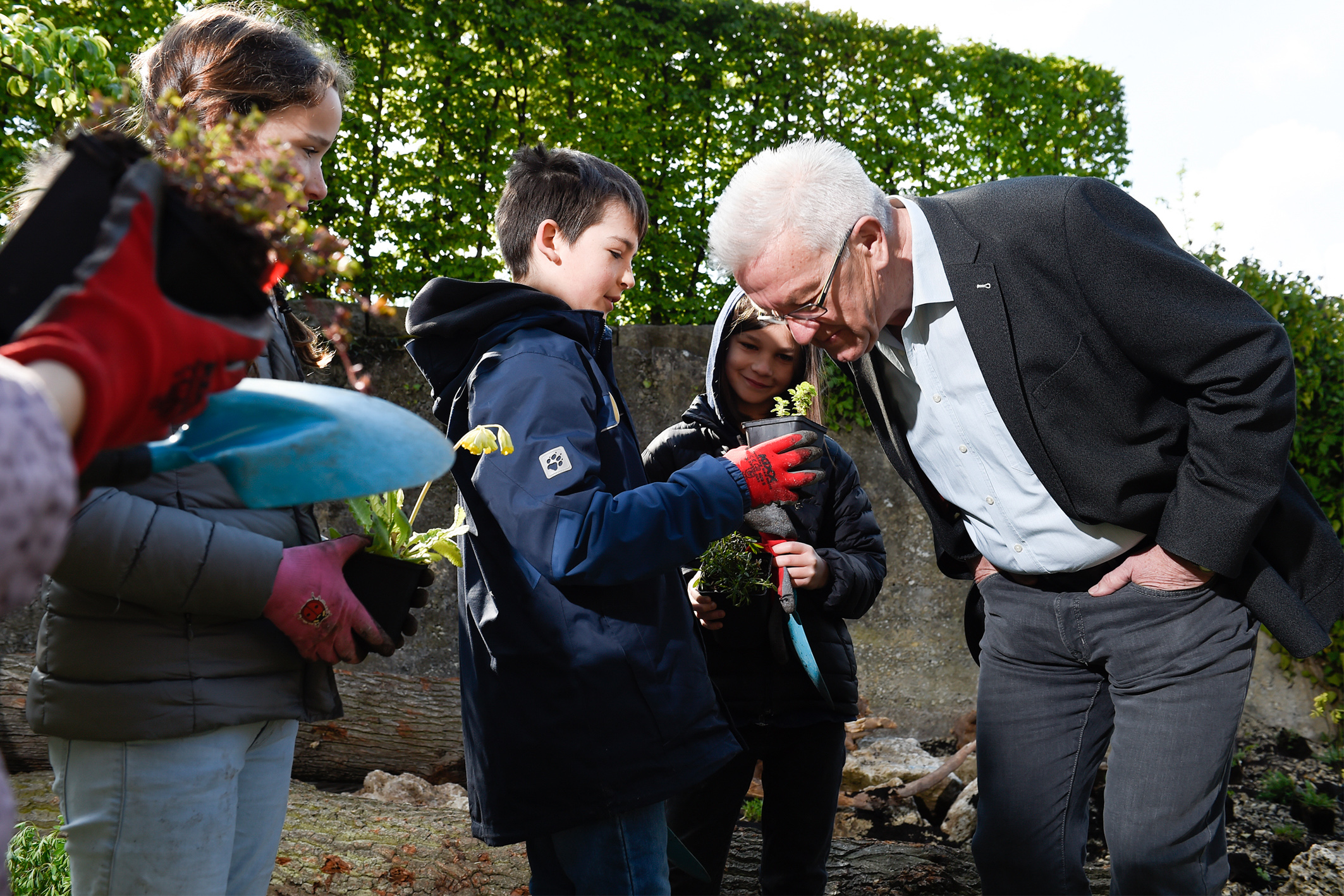 Im Garten des Clay-Hauses wird ein Artenschutzbereich geschaffen, der Insekten und Eidechsen Nahrungsquellen und Lebensräume bietet. Beim Einpflanzen von Wildstauden und Kleingehölzen helfen Kinder der Initiative „Europa Minigärtner“ tatkräftig mit. Ministerpräsident Winfried Kretschmann, Schirmherr der Initiative, hat die Kinder begrüßt und sich die Pflanzungen zeigen lassen.