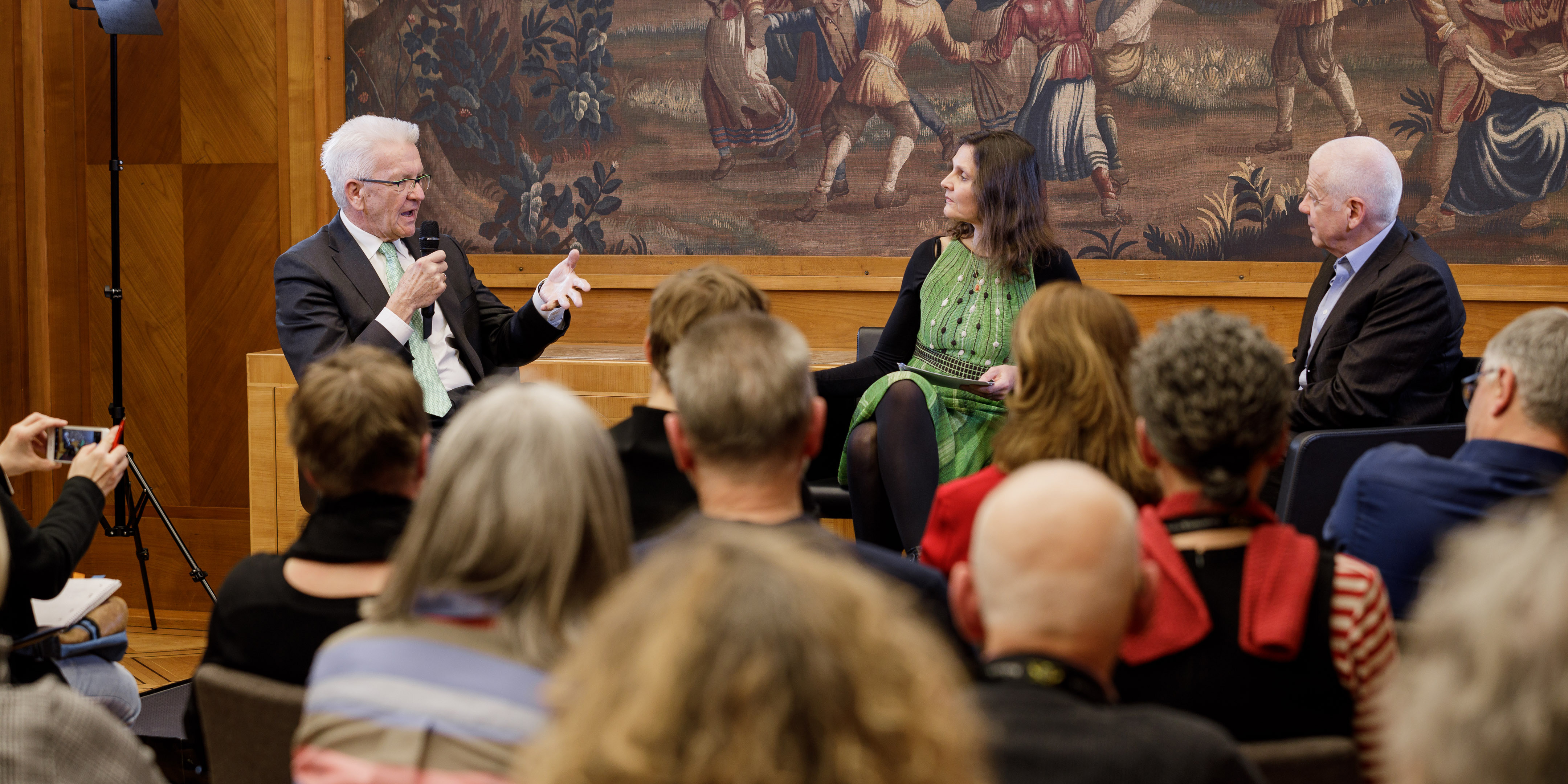 Beim Auftakt des neuen Formats „Kultur in der Villa“ trafen sich Ministerpräsident Winfried Kretschmann und der Schriftsteller Matthias Politycki zum gemeinsamen Gespräch über das Thema „Haltung finden“.