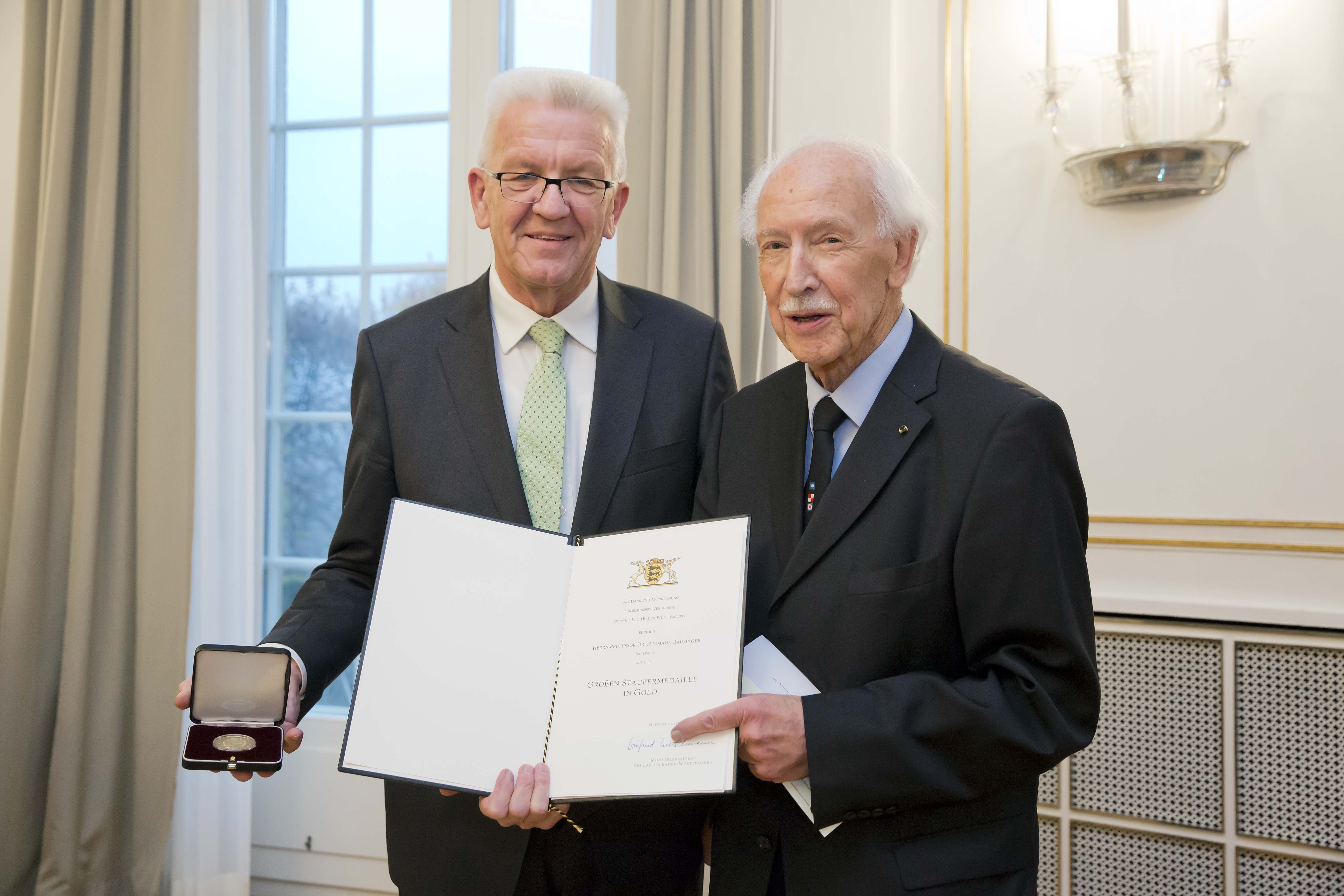 Ministerpräsident Winfried Kretschmann hat Professor Hermann Bausinger in der Villa Reitzenstein in Stuttgart die Große Staufermedaille in Gold des Landes Baden-Württemberg verliehen und ihn als „Vorbild eines schwäbischen Gelehrten mit nicht versiegender Schaffenskraft“ gewürdigt.