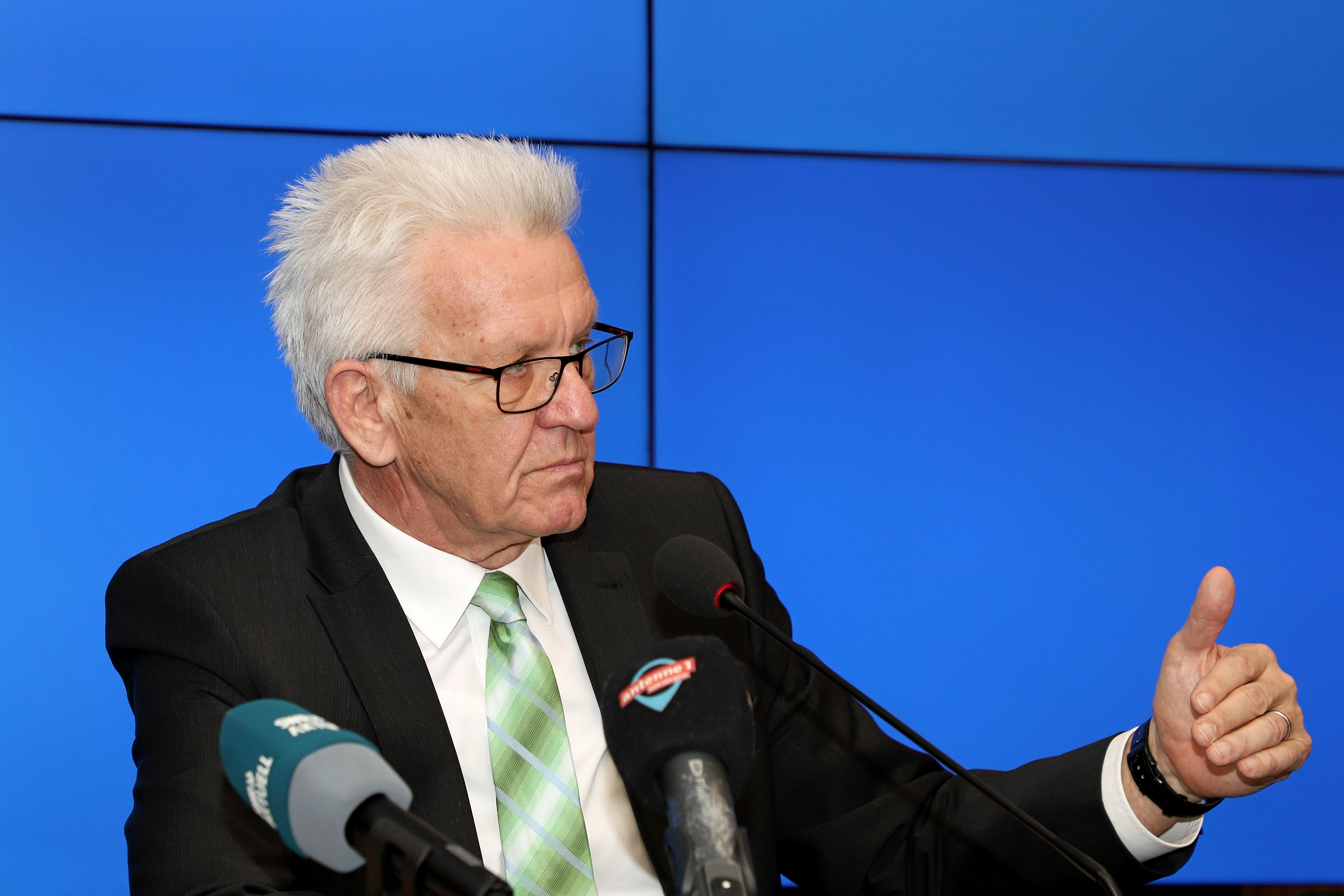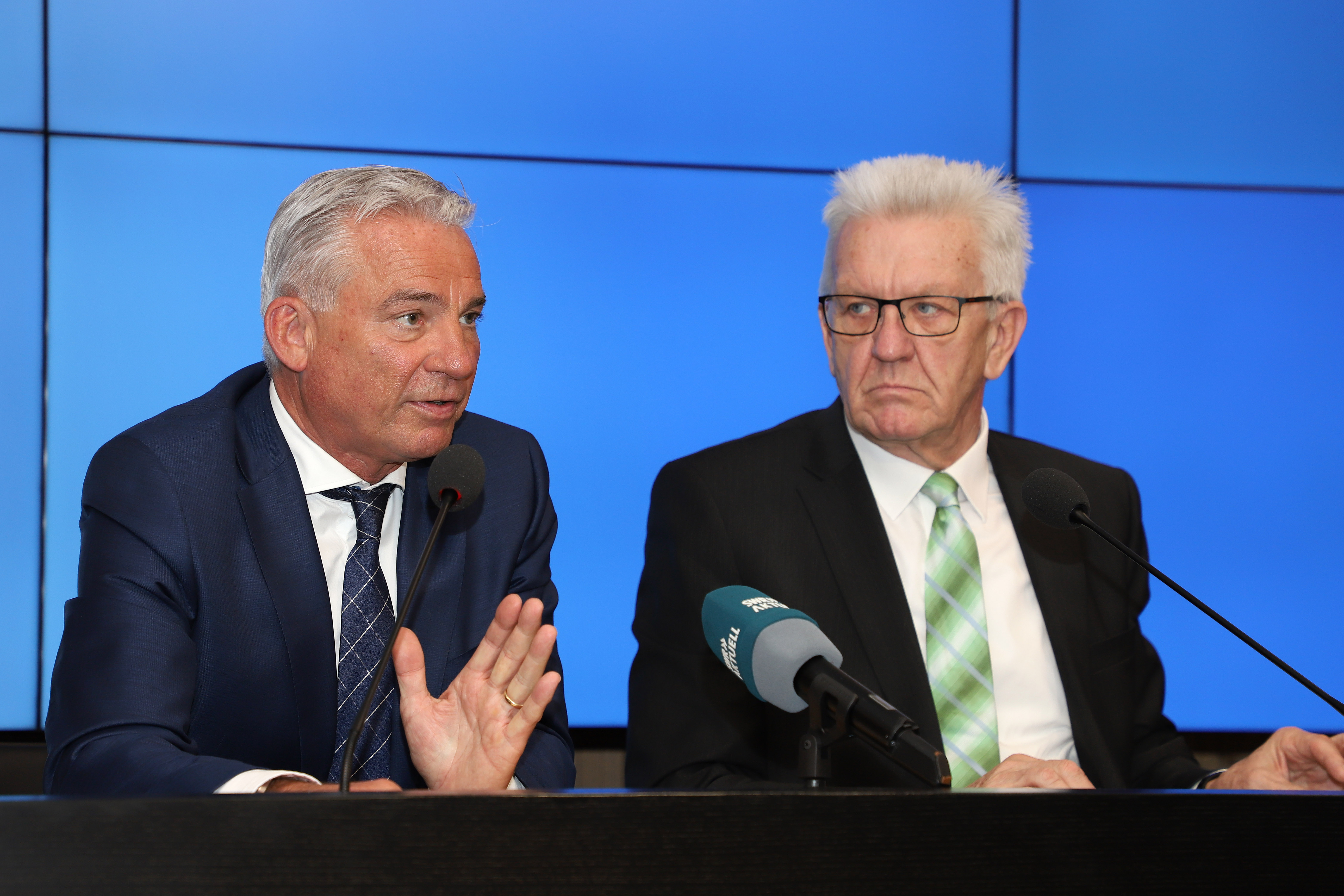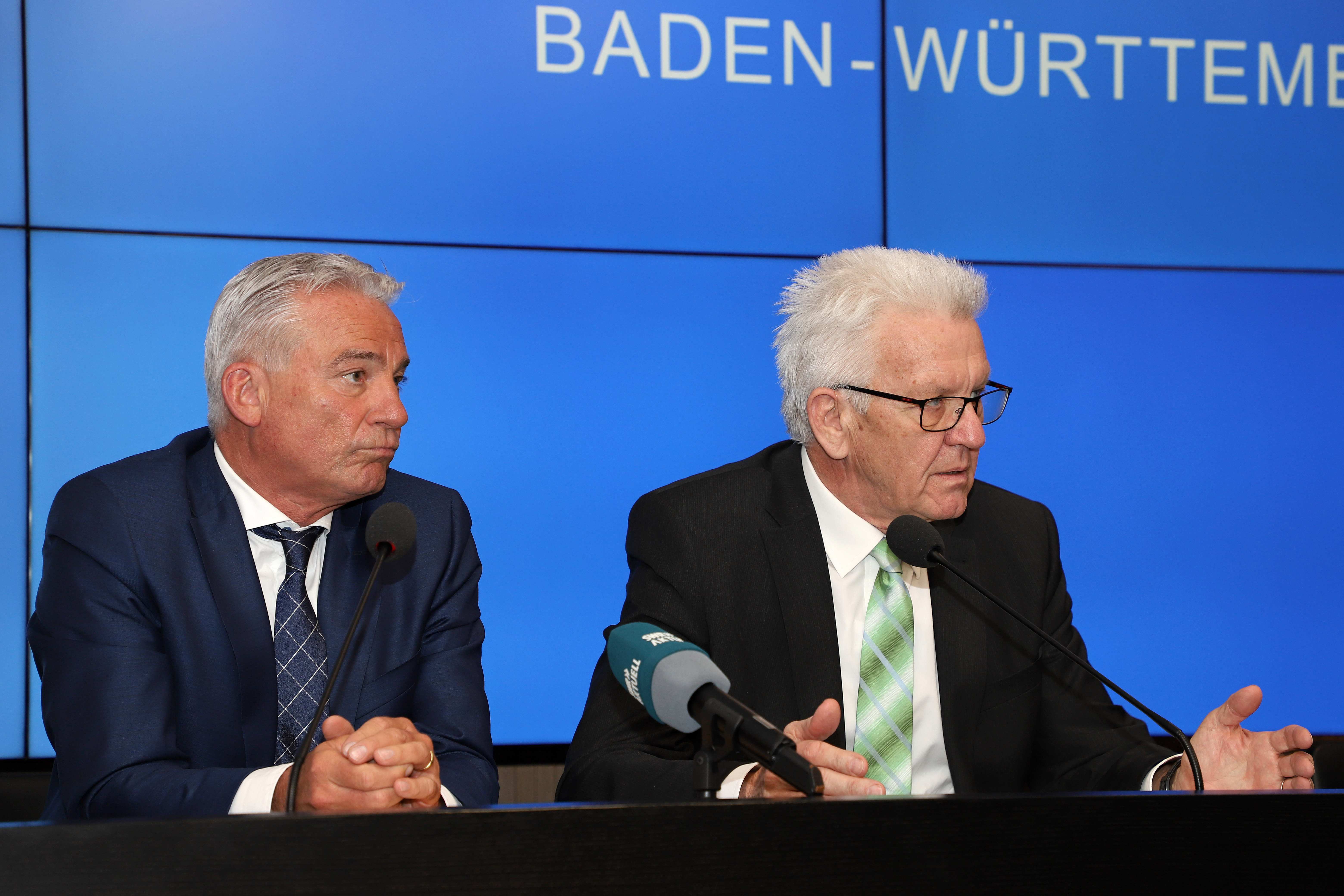 Ministerpräsident Winfried Kretschmann und Innenminister Thomas Strobl haben in der Regierungspressekonferenz in Stuttgart über die Großübungen von Polizei und Katastrophenschutz des Landes berichtet und Fragen der Journalisten beantwortet.