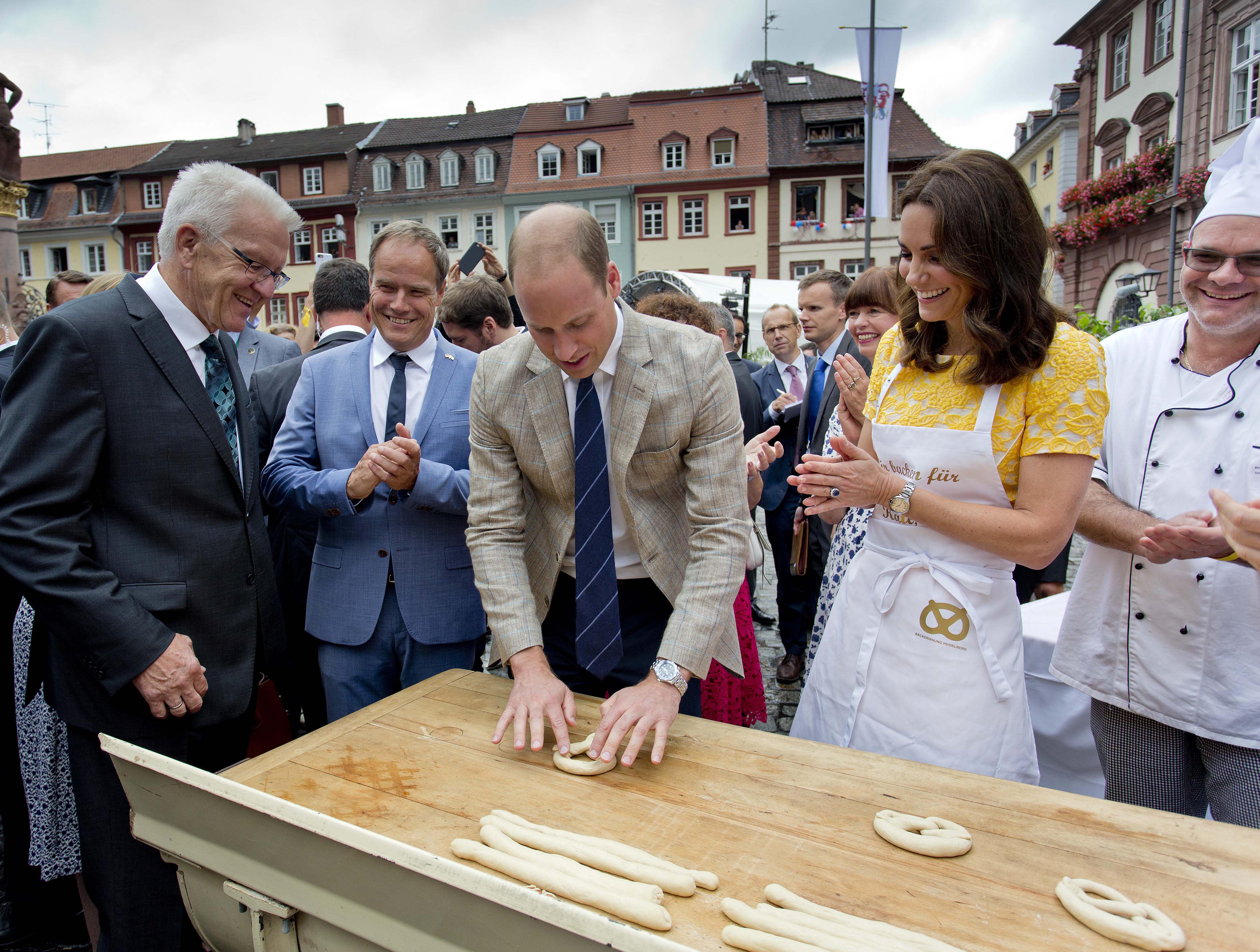 Marktplatz: Prinz William (3.v.r.) und Herzogin Catherine (2.v.r.) formen Brezeln, daneben Ministerpräsident Winfried Kretschmann (l.) und Heidelbergs Oberbürgermeister Prof. Dr. Eckart Würzner (2.v.l.)