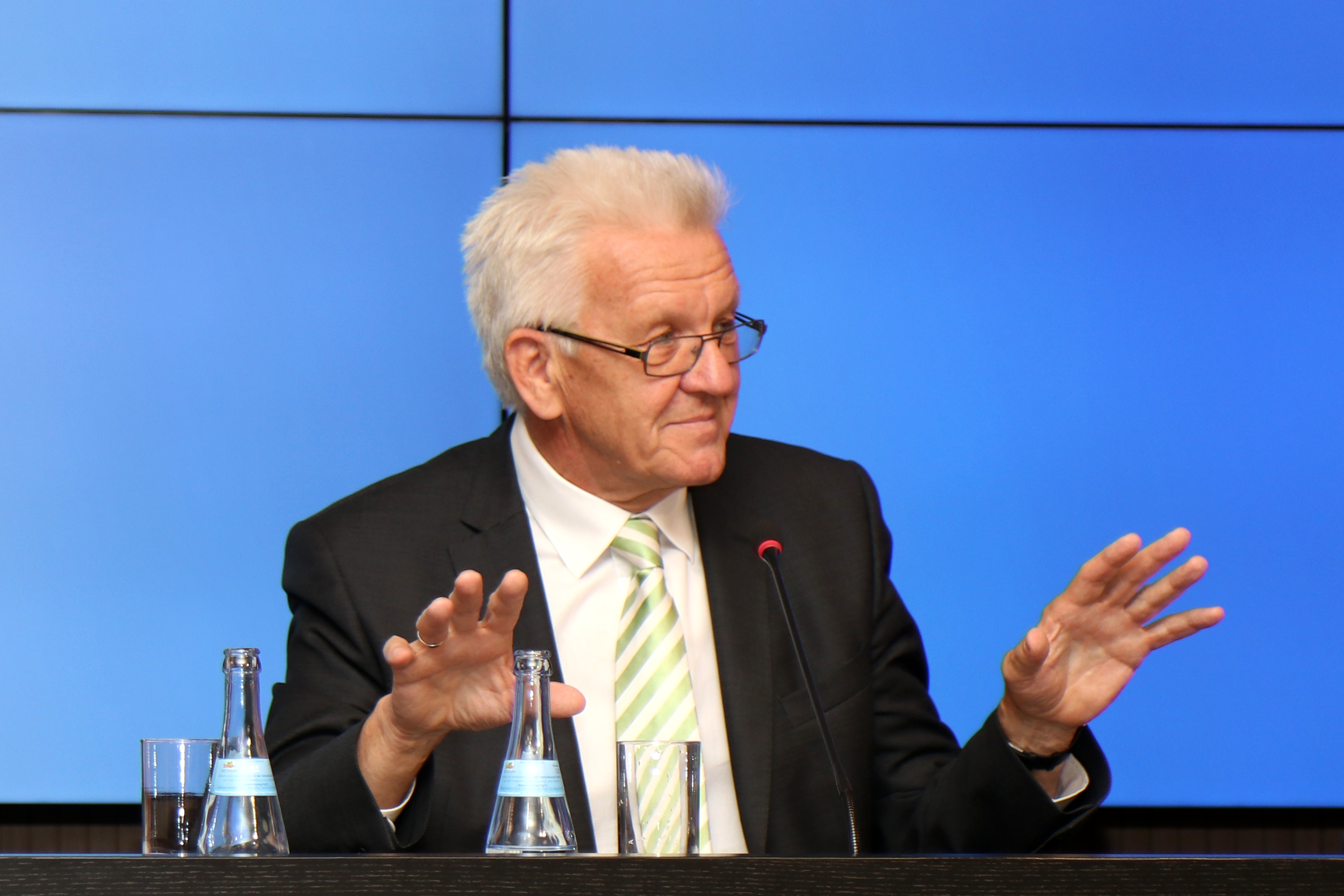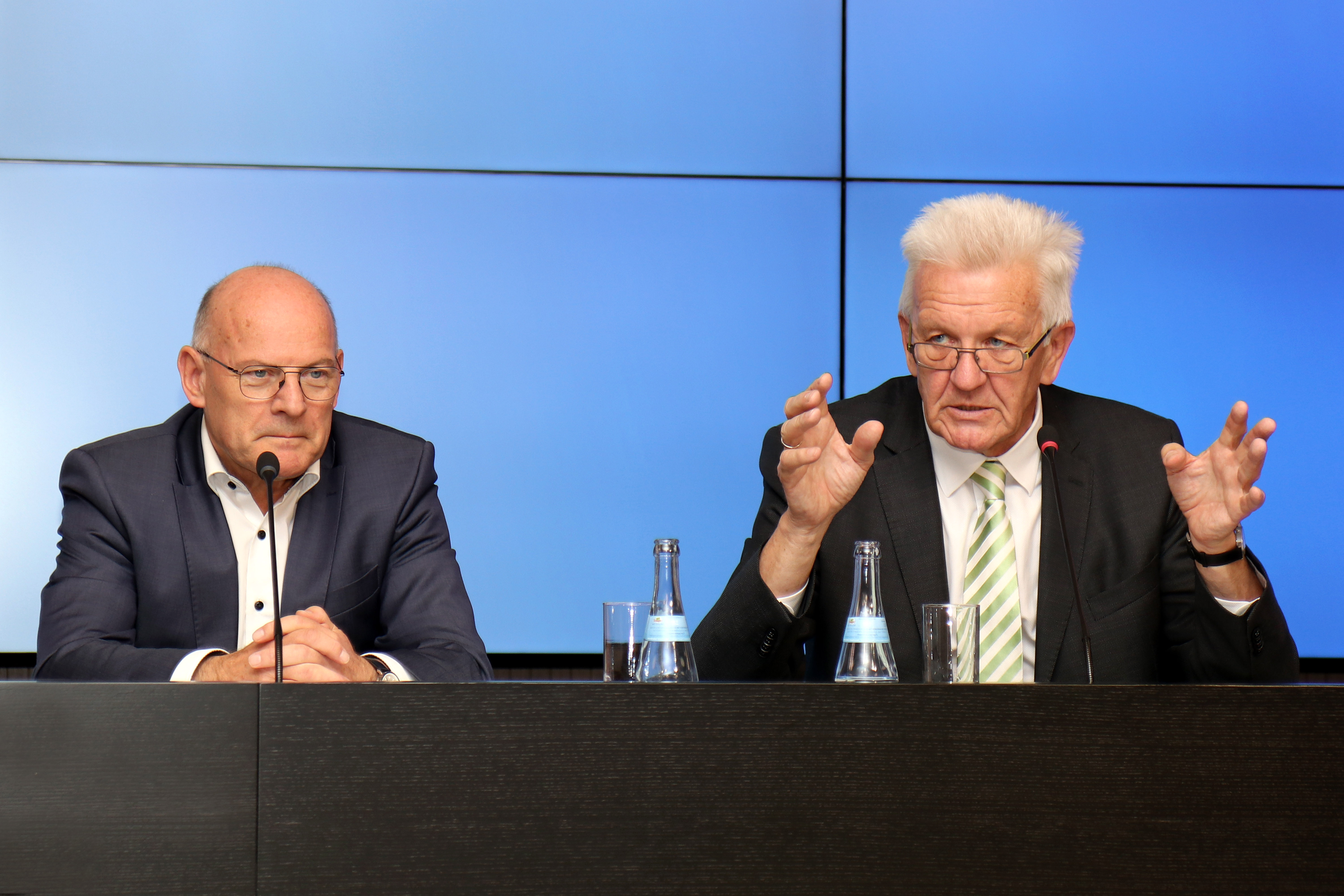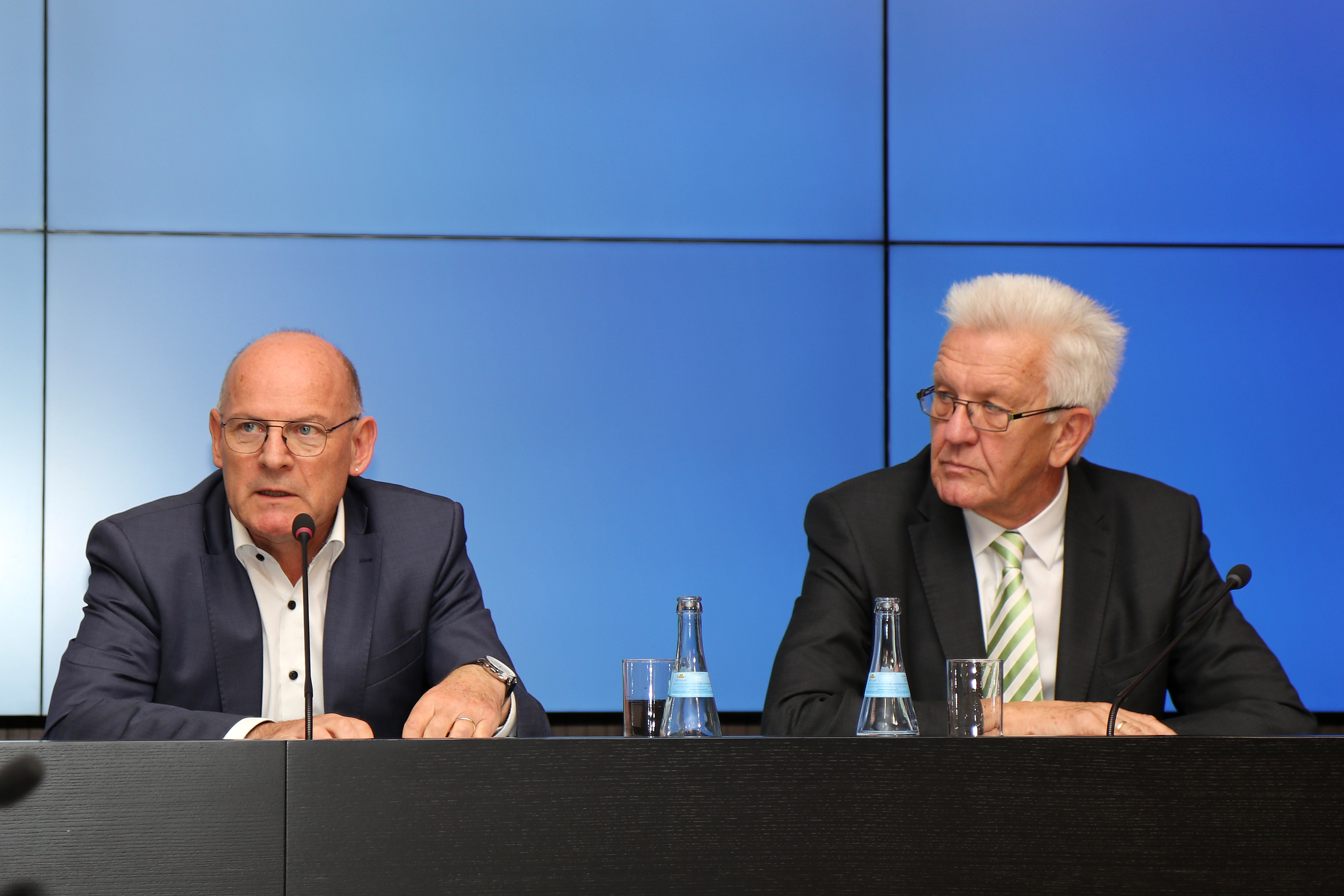 Ministerpräsident Winfried Kretschmann und Verkehrsminister Winfried Hermann haben in der Regierungspressekonferenz in Stuttgart die verkehrlichen Konsequenzen aus der Sperrung des Abschnitts der Rheintalbahn bei Rastatt vorgestellt und Fragen der Journalisten beantwortet.