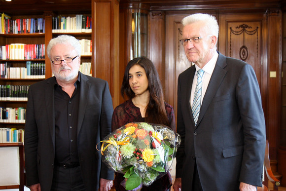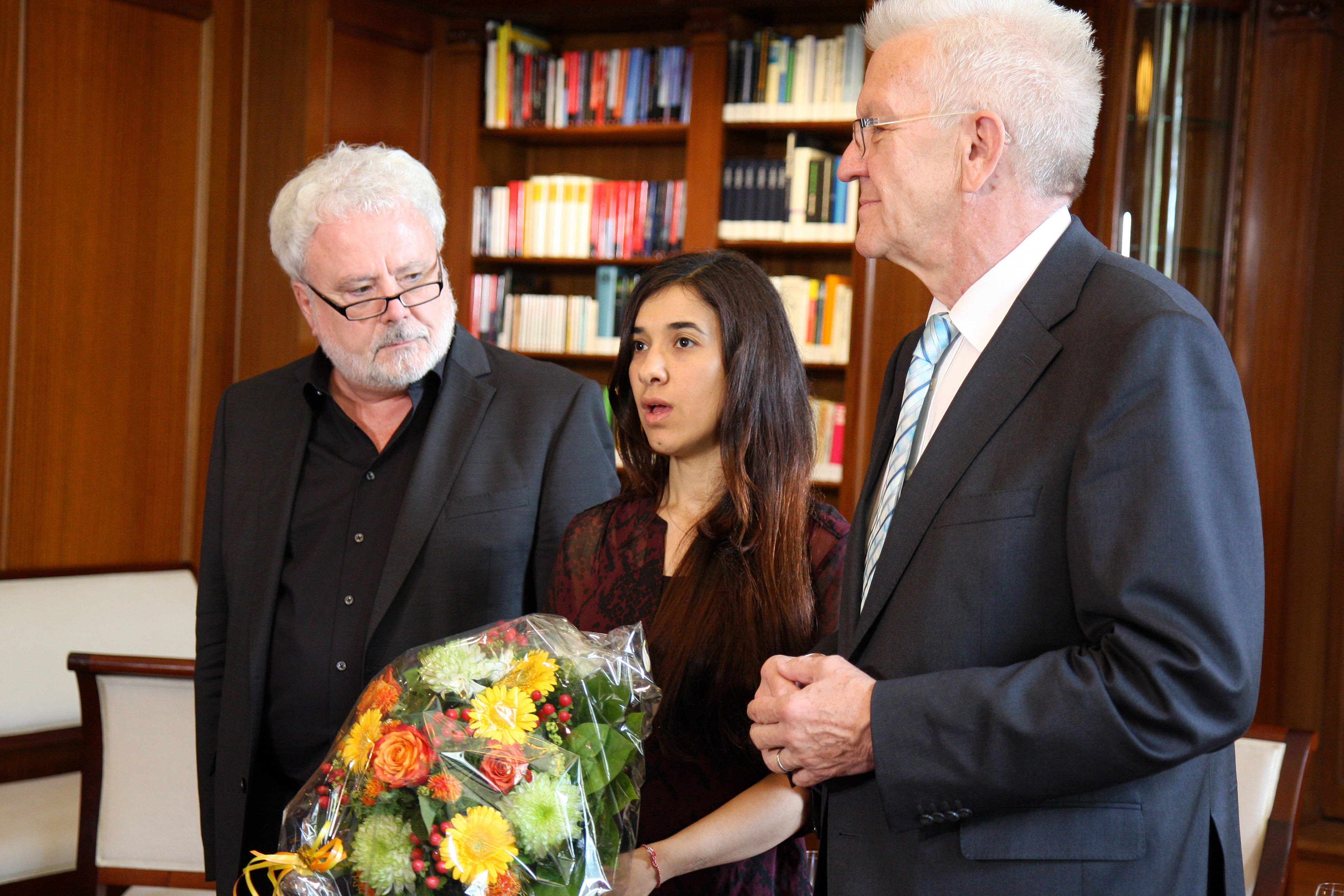 Ministerpräsident Winfried Kretschmann und Staatsminister Klaus-Peter Murawski haben die jesidische Menschenrechtsaktivistin Nadia Murad zu einem Gespräch in der Villa Reitzenstein in Stuttgart empfangen.