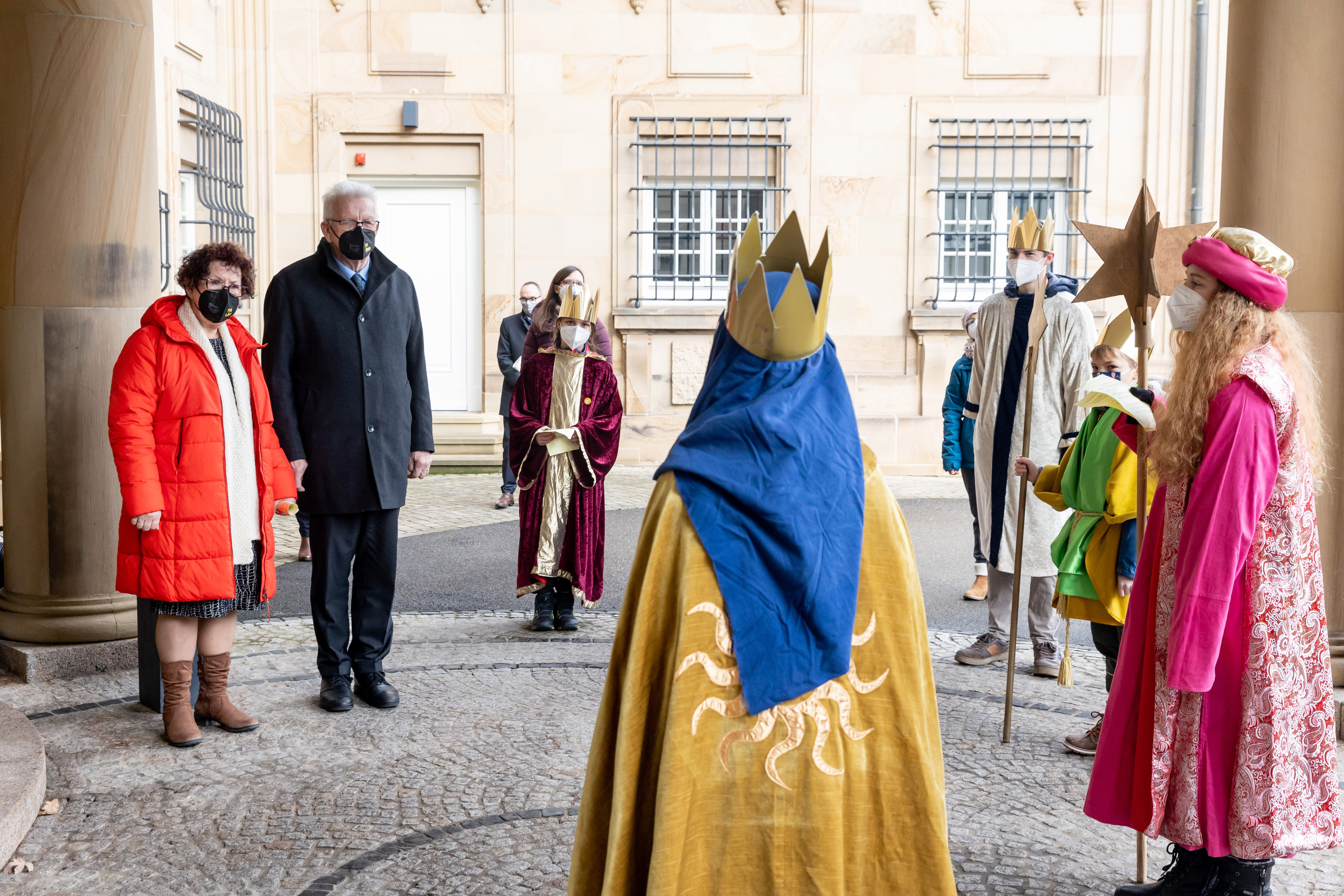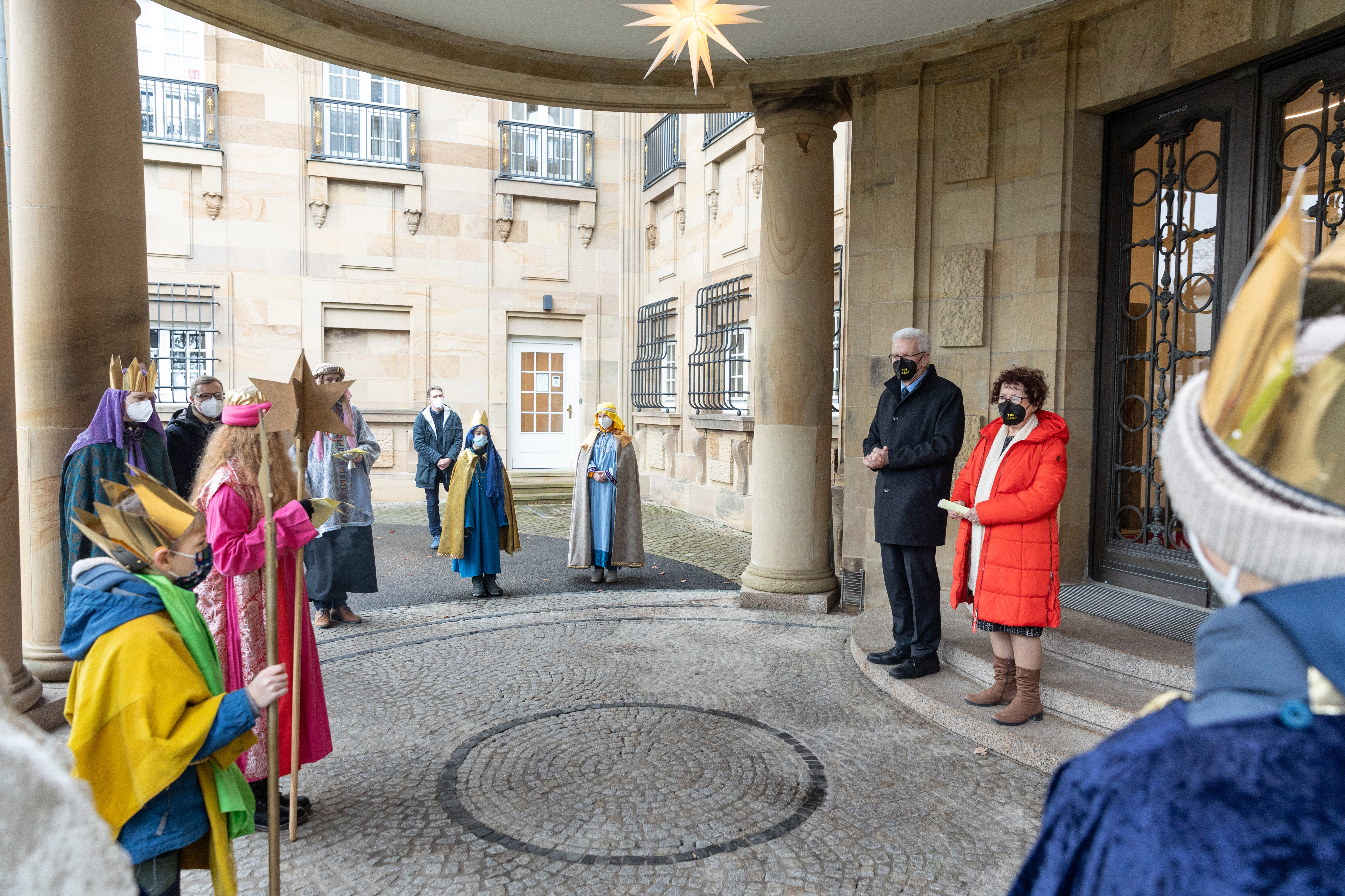Ministerpräsident Winfried Kretschmann hat gemeinsam mit seiner Ehefrau Gerlinde zwei Sternsingergruppen aus Baden-Württemberg vor der Villa Reitzenstein in Stuttgart empfangen. Im Mittelpunkt der Sternsingeraktion 2022 steht die Gesundheitsförderung von Kindern in Afrika.