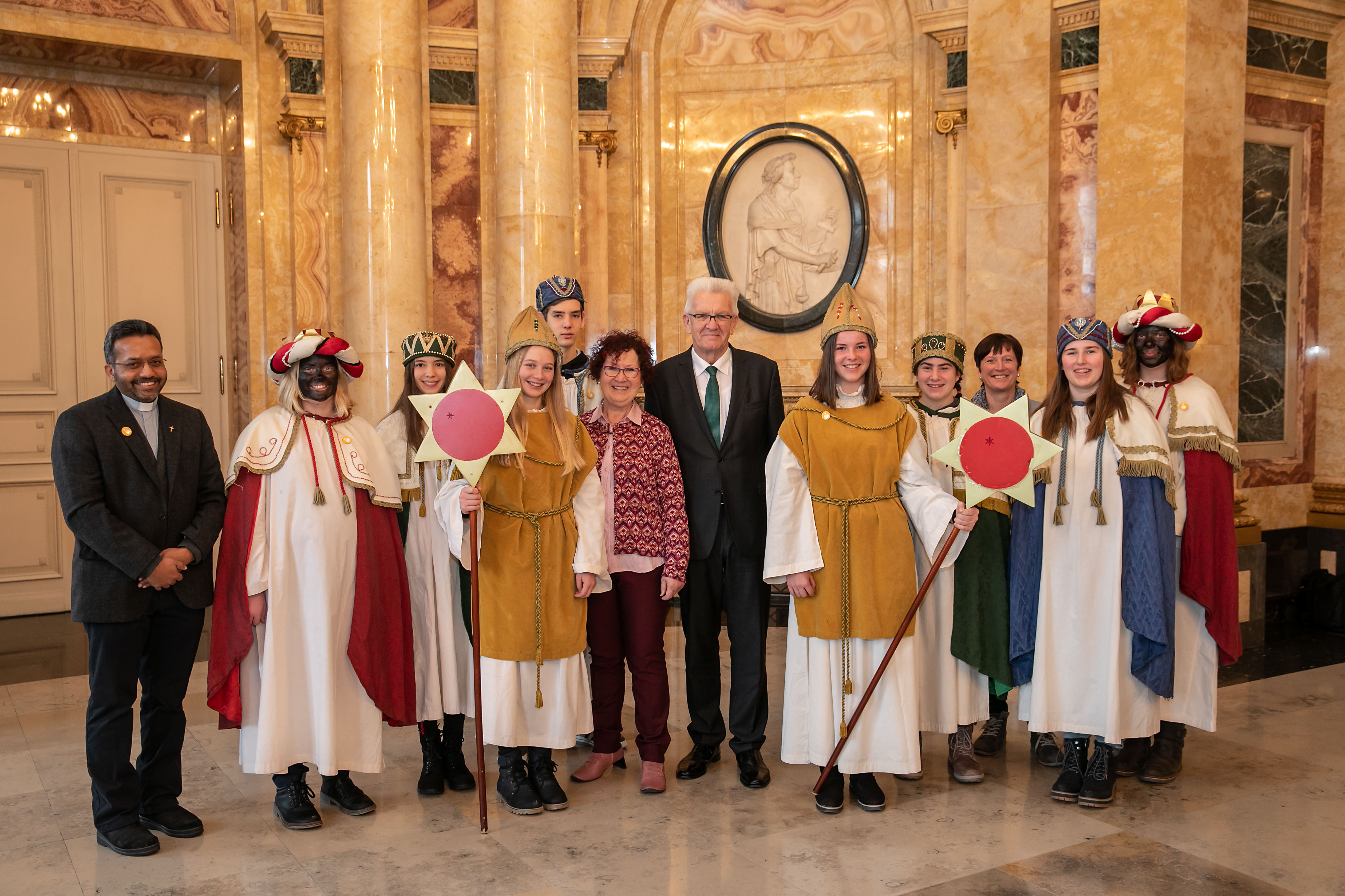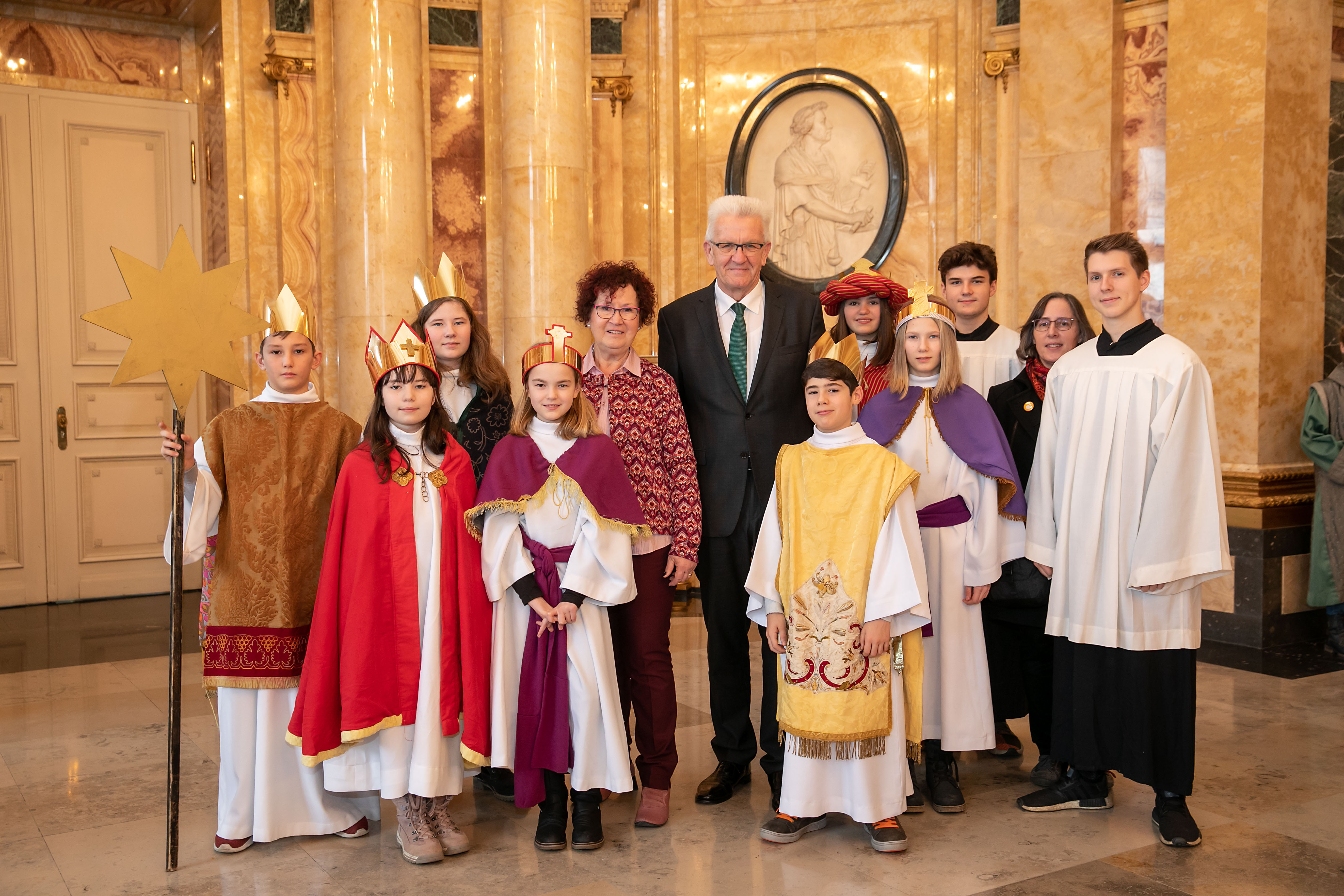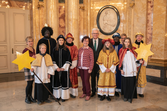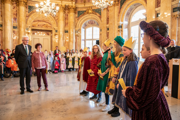 Ministerpräsident Winfried Kretschmann und seine Frau Gerlinde Kretschmann haben im Neuen Schloss in Stuttgart Sternsingerinnen und Sternsinger aus ganz Baden-Württemberg empfangen.