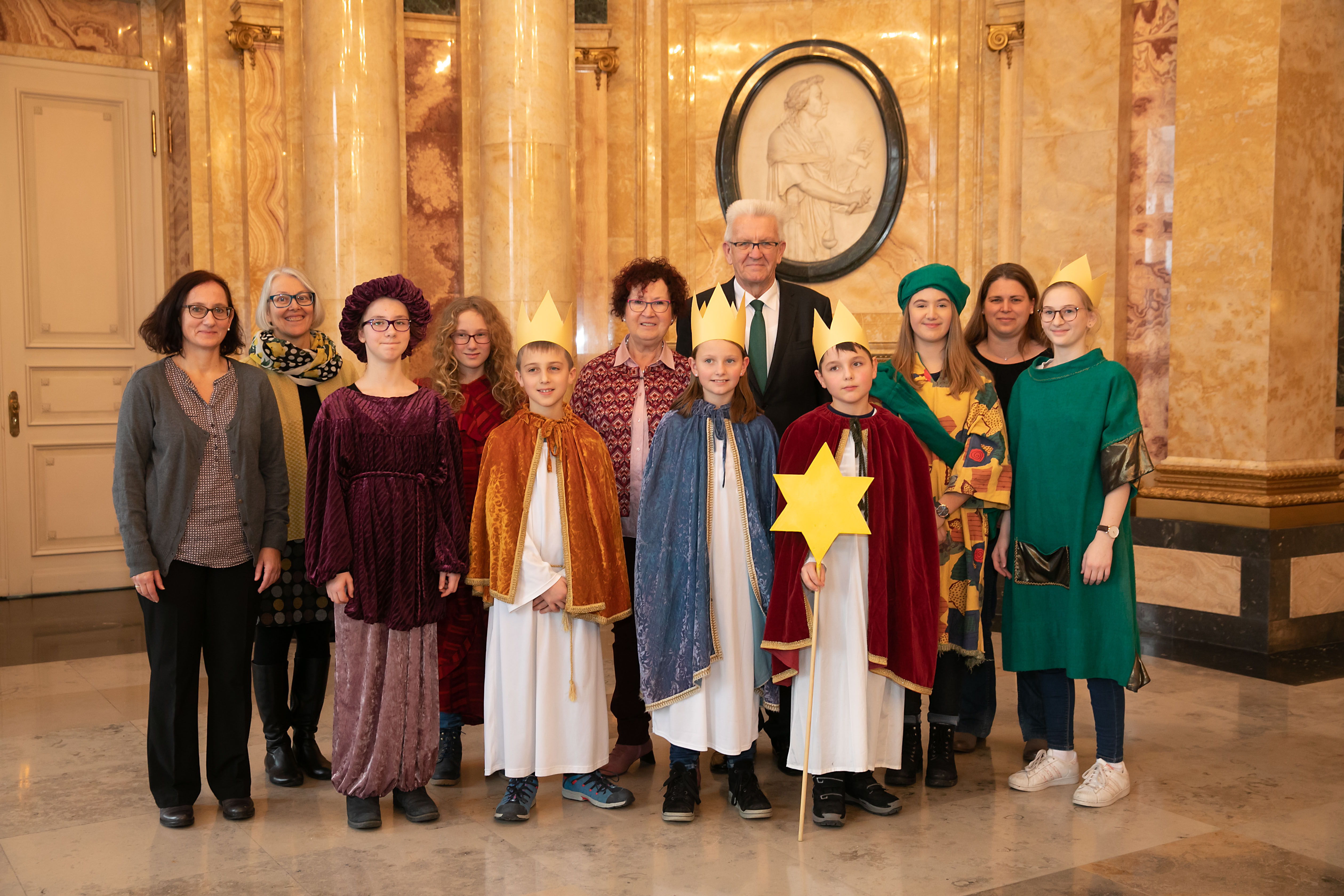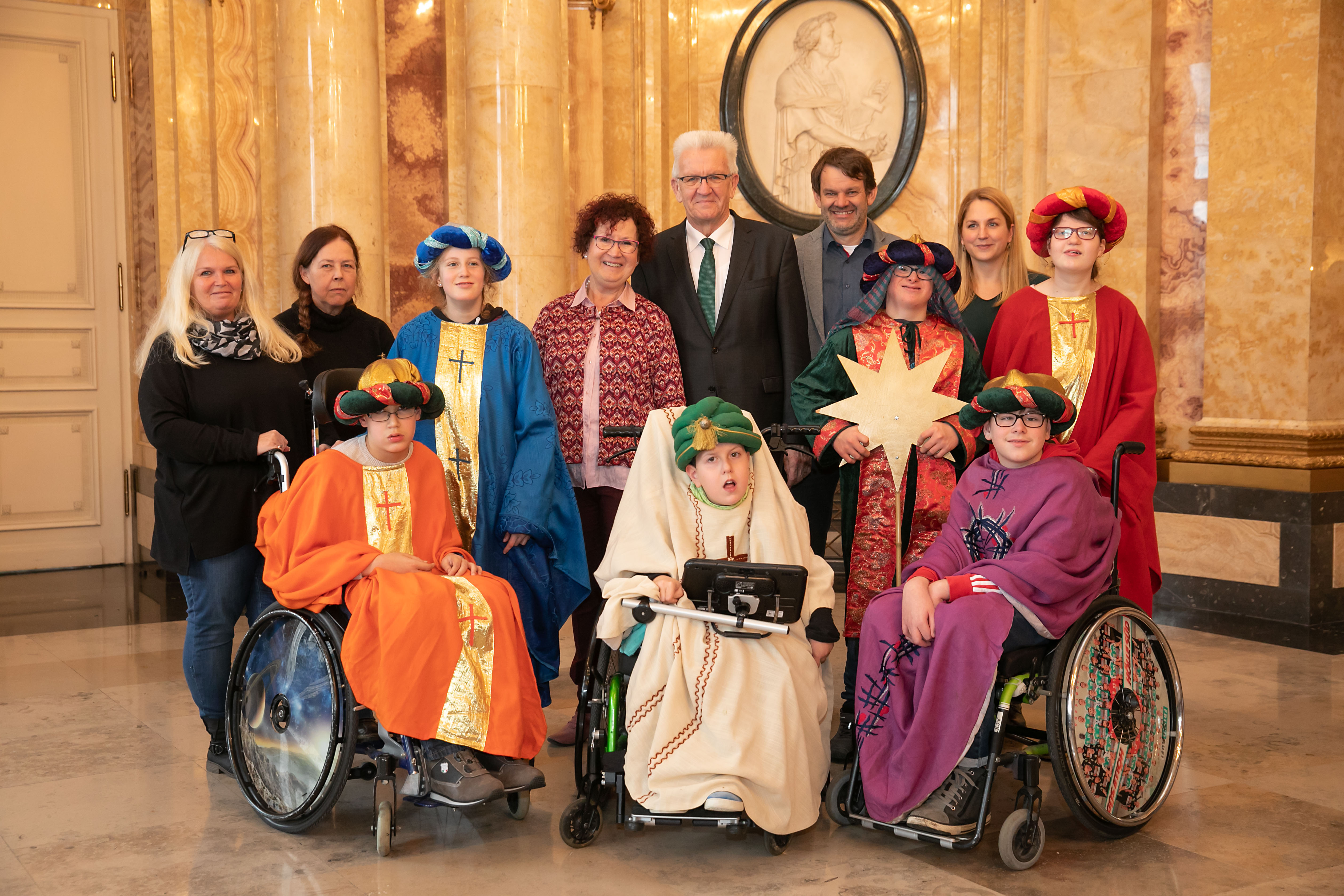Ministerpräsident Winfried Kretschmann und seine Frau Gerlinde (M.) mit den Sternsingern des Sonderschulzentrums Rohräckerschule (Esslingen)