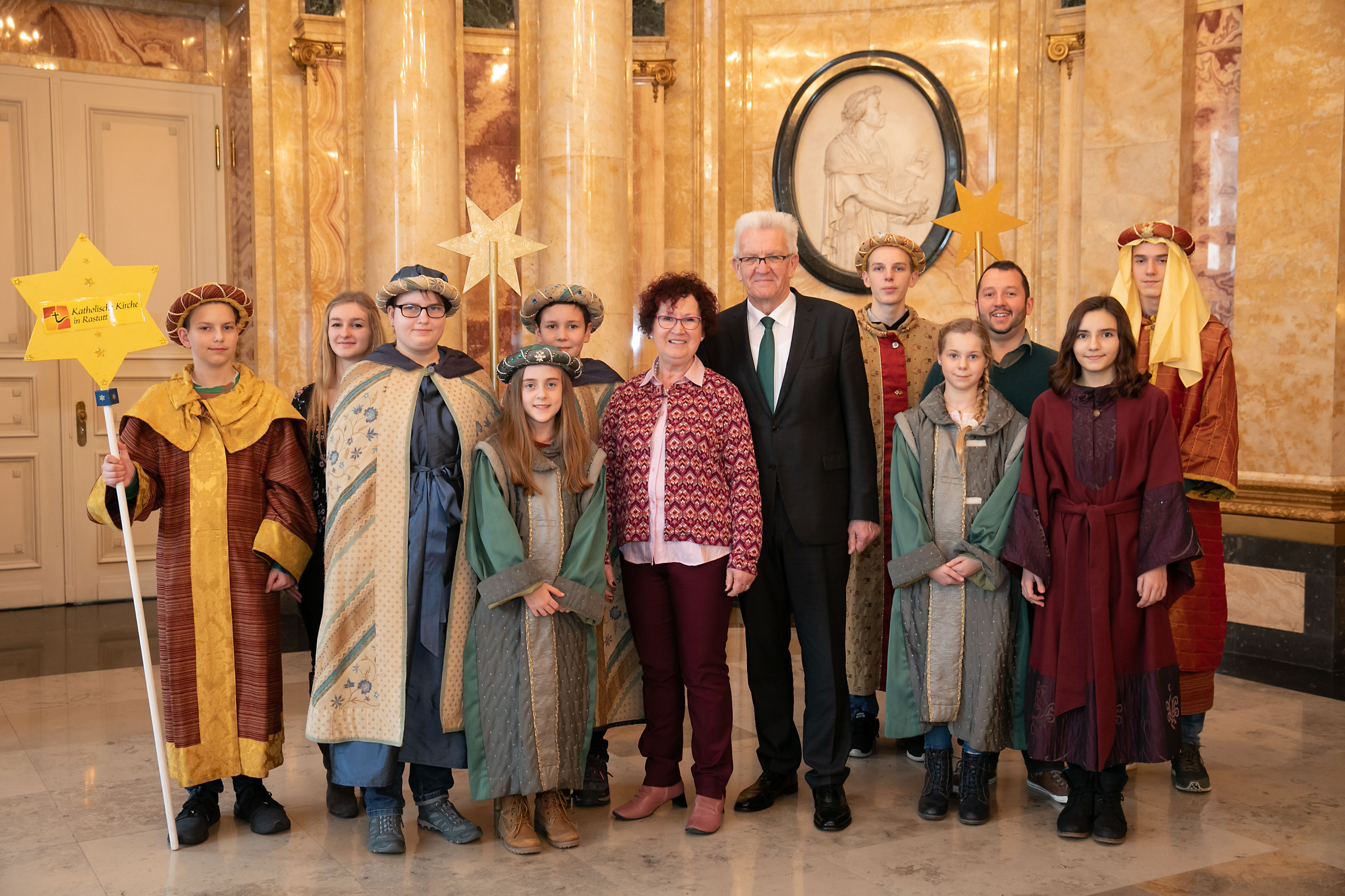 Ministerpräsident Winfried Kretschmann und seine Frau Gerlinde (M.) mit den Sternsingern der Seelsorgeeinheit Rastatt