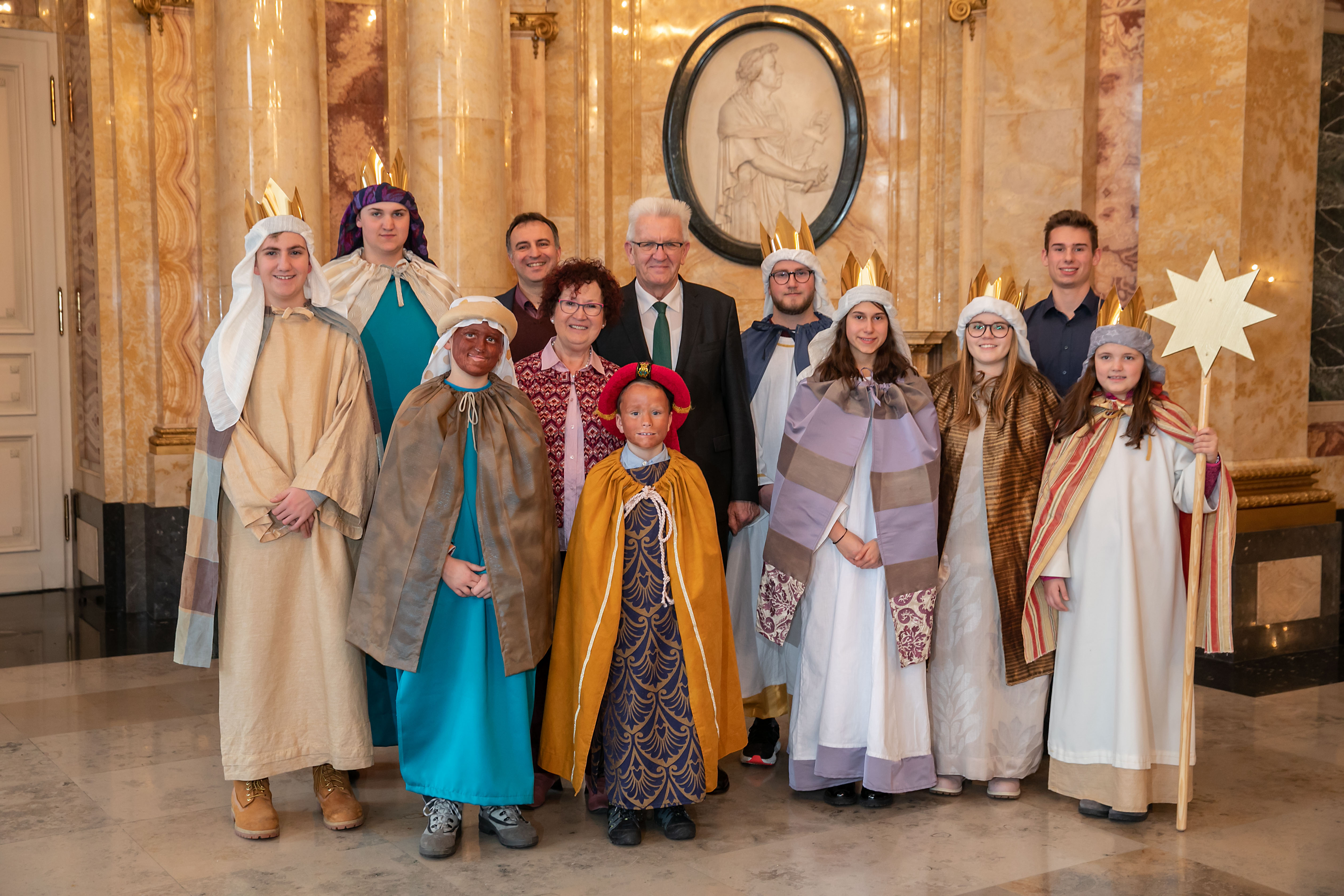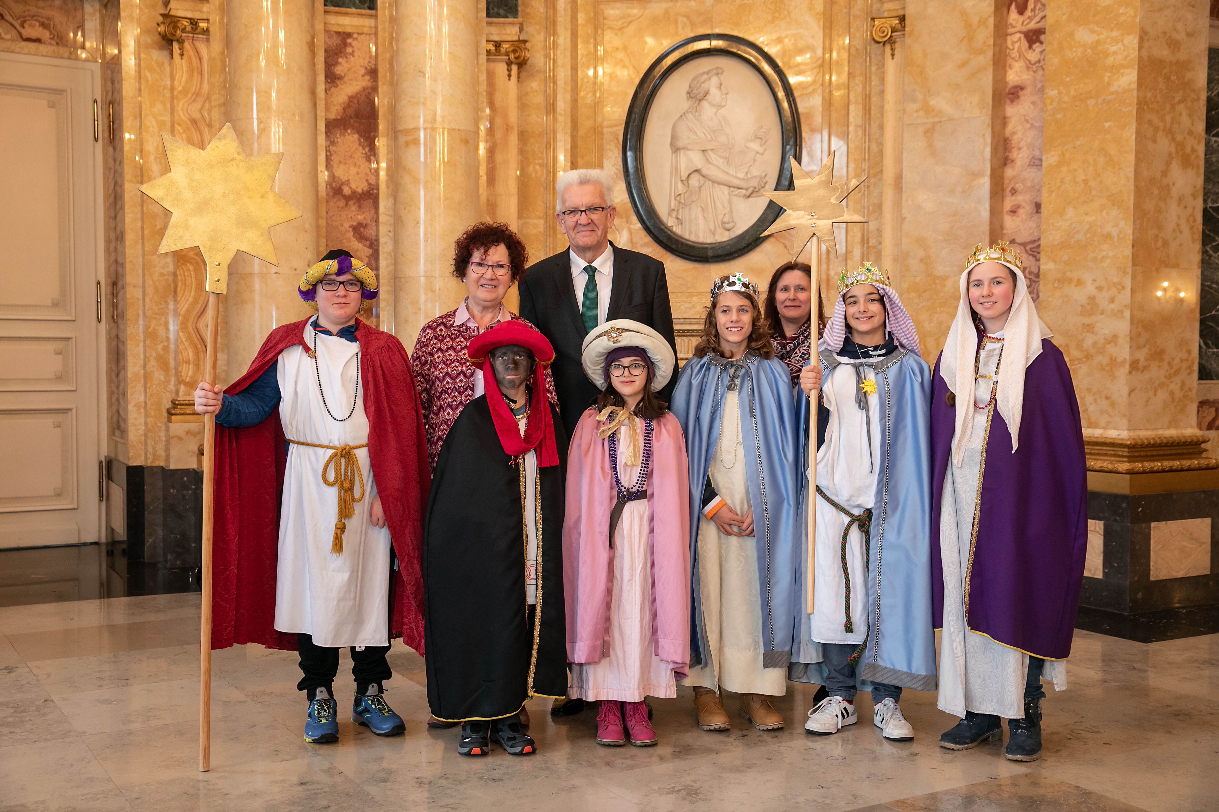 Ministerpräsident Winfried Kretschmann (l.) zusammen mit seiner Frau Gerlinde (2.v.l.) beim Sternsingerempfang im Neuen Schloss (Bild: Staatsministerium Baden-Württemberg)