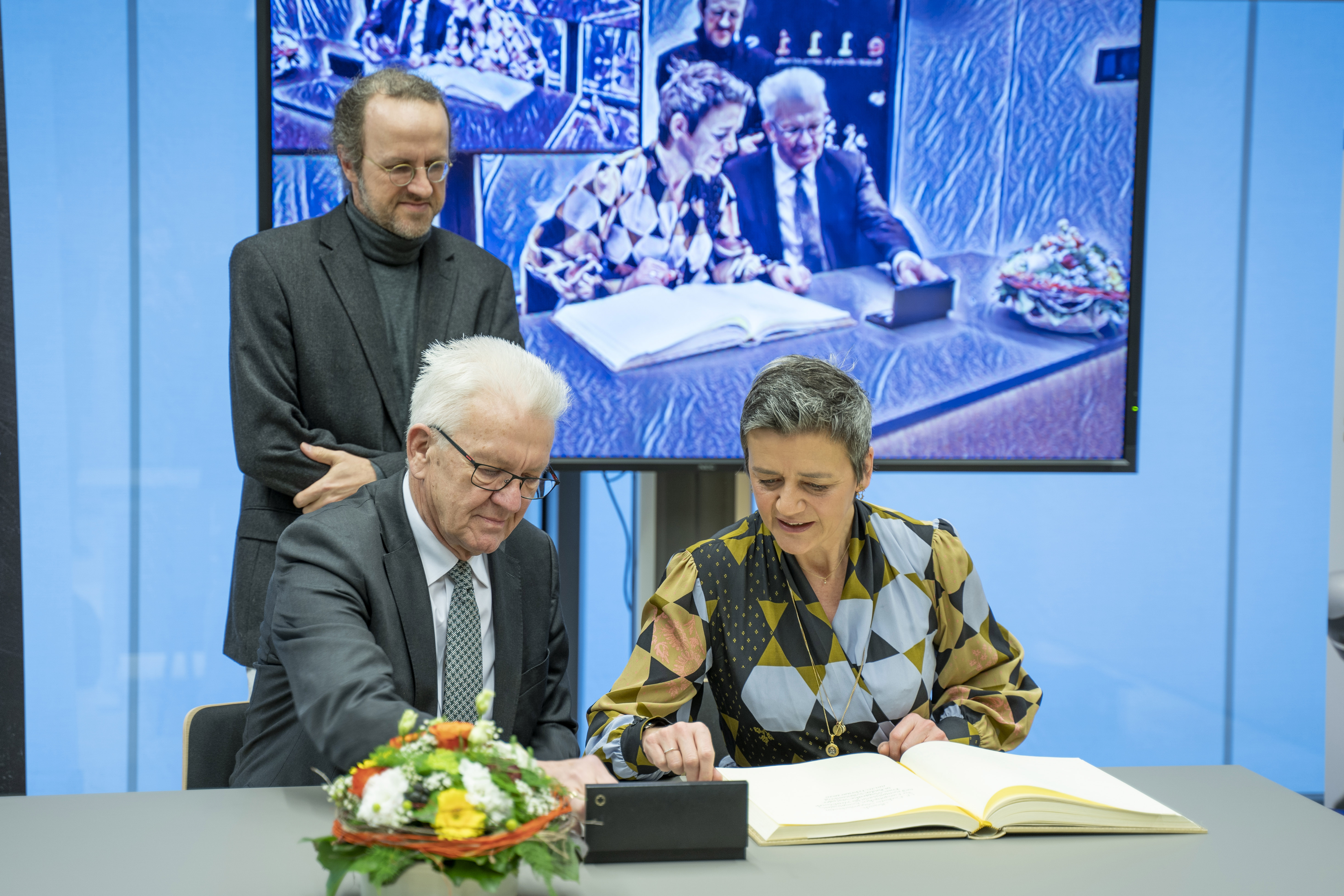 Ministerpräsident Winfried Kretschmann hat die Exekutiv-Vizepräsidentin der EU-Kommission, Margrethe Vestager, in Tübingen getroffen. Gemeinsam besuchten sie das Cyber Valley am Max-Planck-Institut für Intelligente Systeme sowie das Zentrum für Personalisierte Medizin am Universitätsklinikum Tübingen.