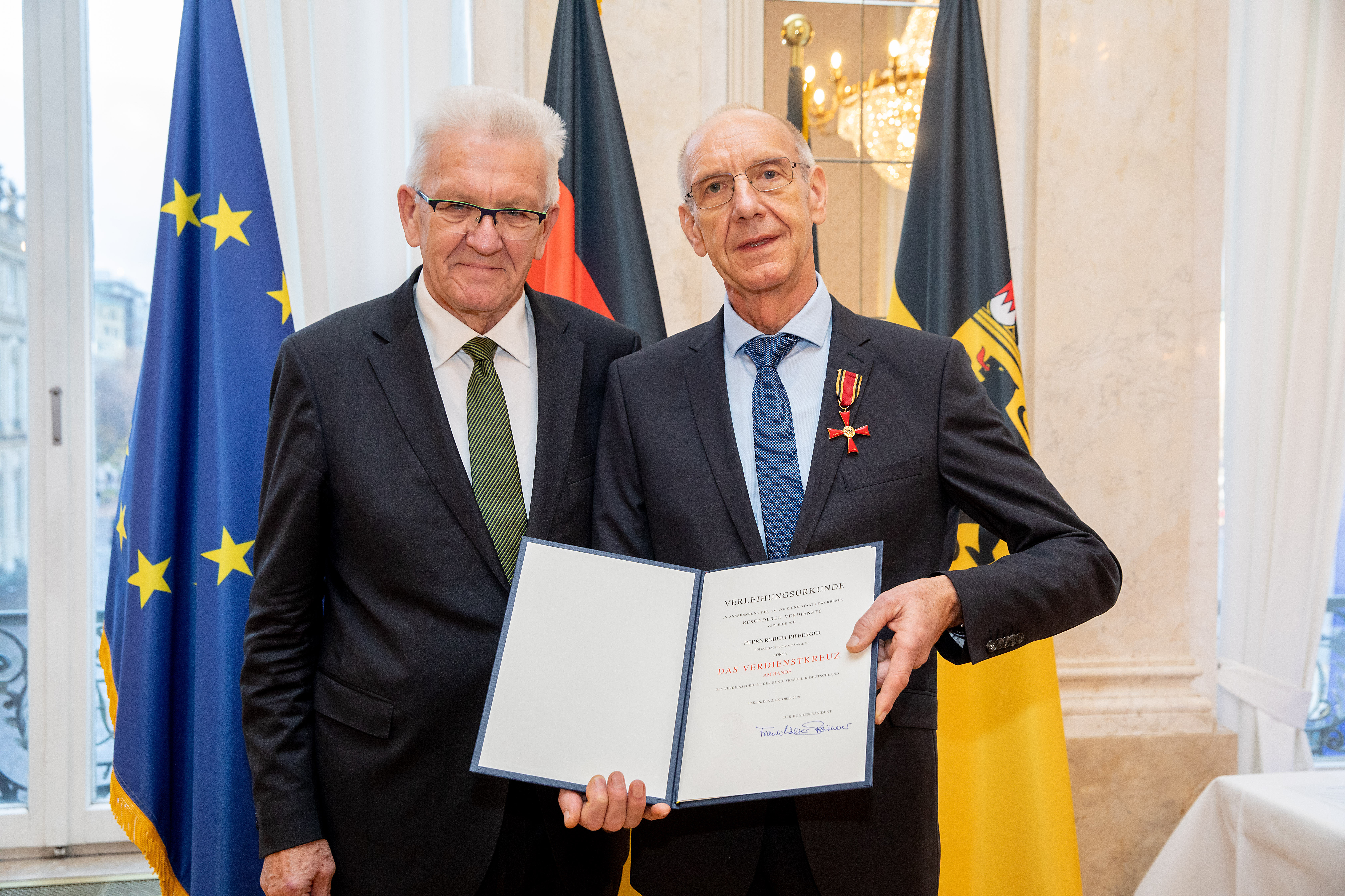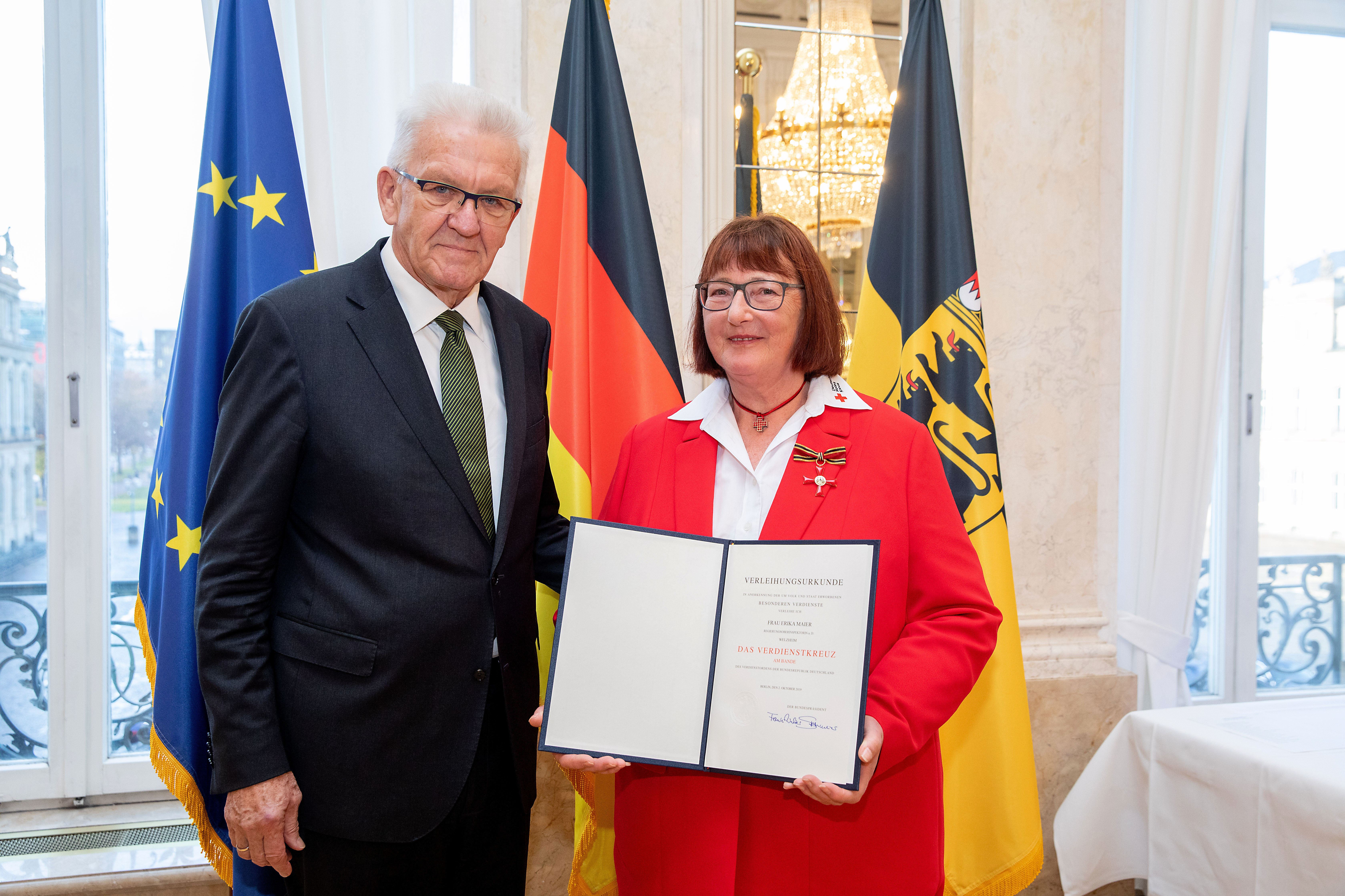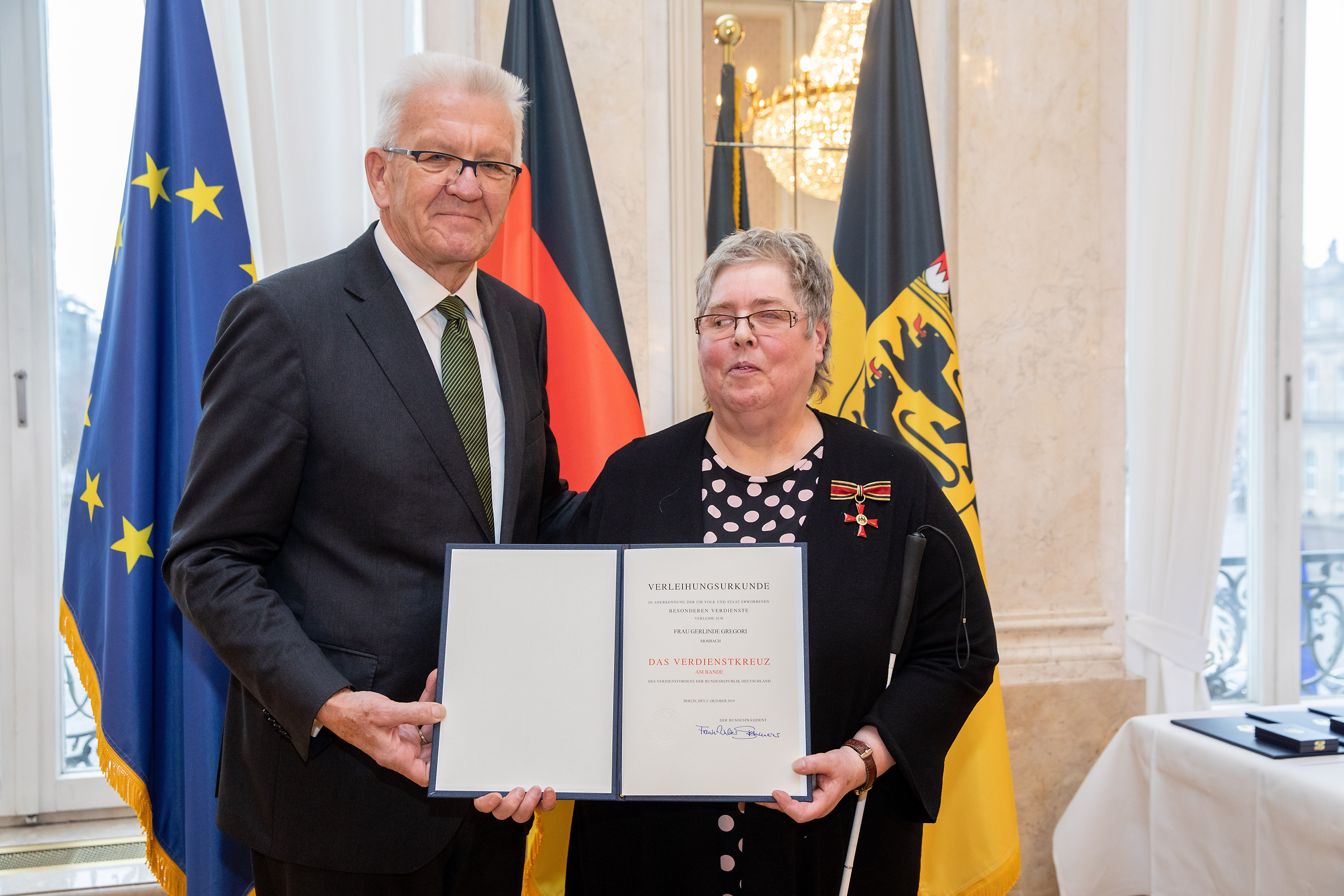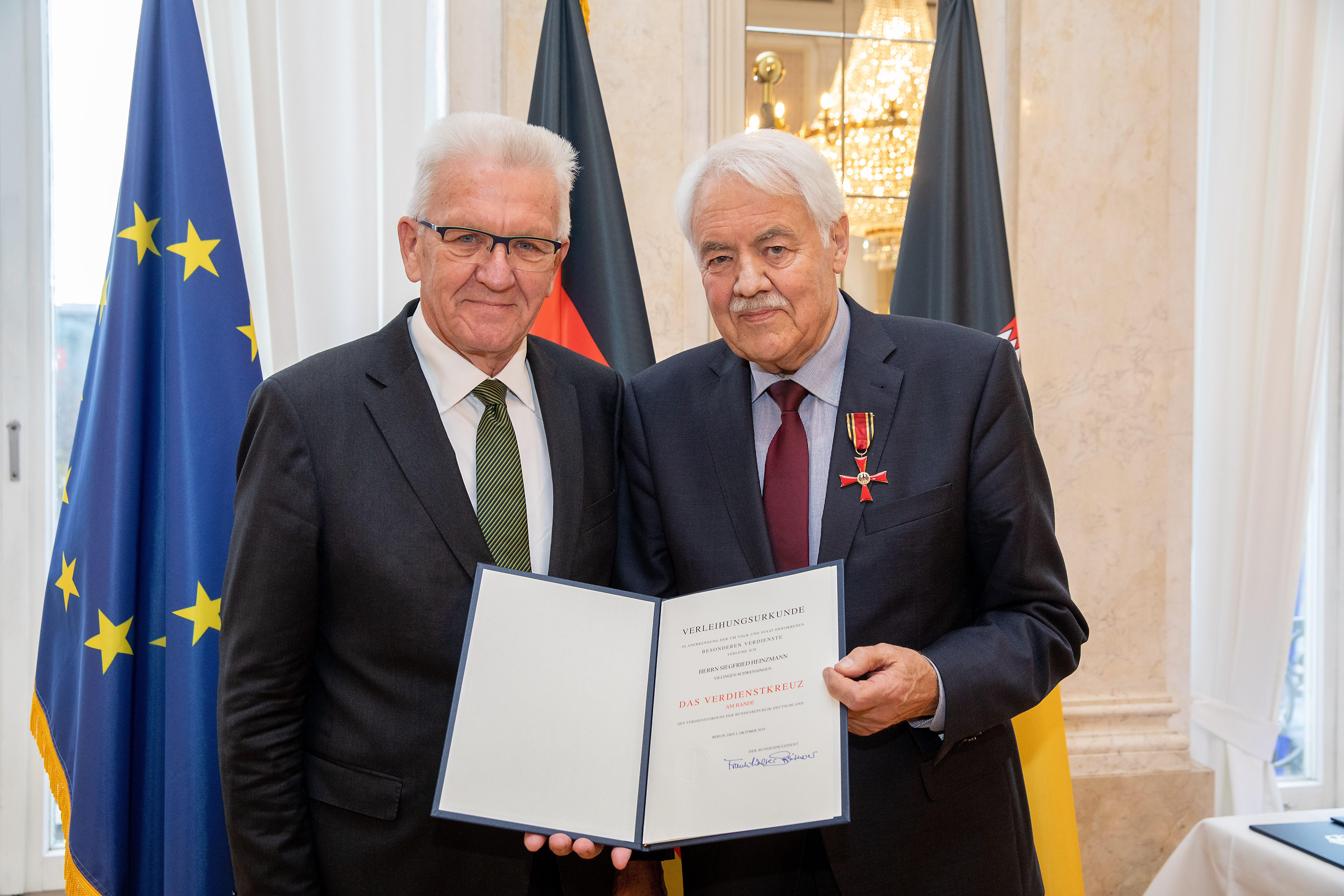 Anlässlich des Tages des Ehrenamtes hat Ministerpräsident Winfried Kretschmann 18 Bürgerinnen und Bürger für besonderes ehrenamtliches Engagement das Bundesverdienstkreuz überreicht und ihren Einsatz gewürdigt.