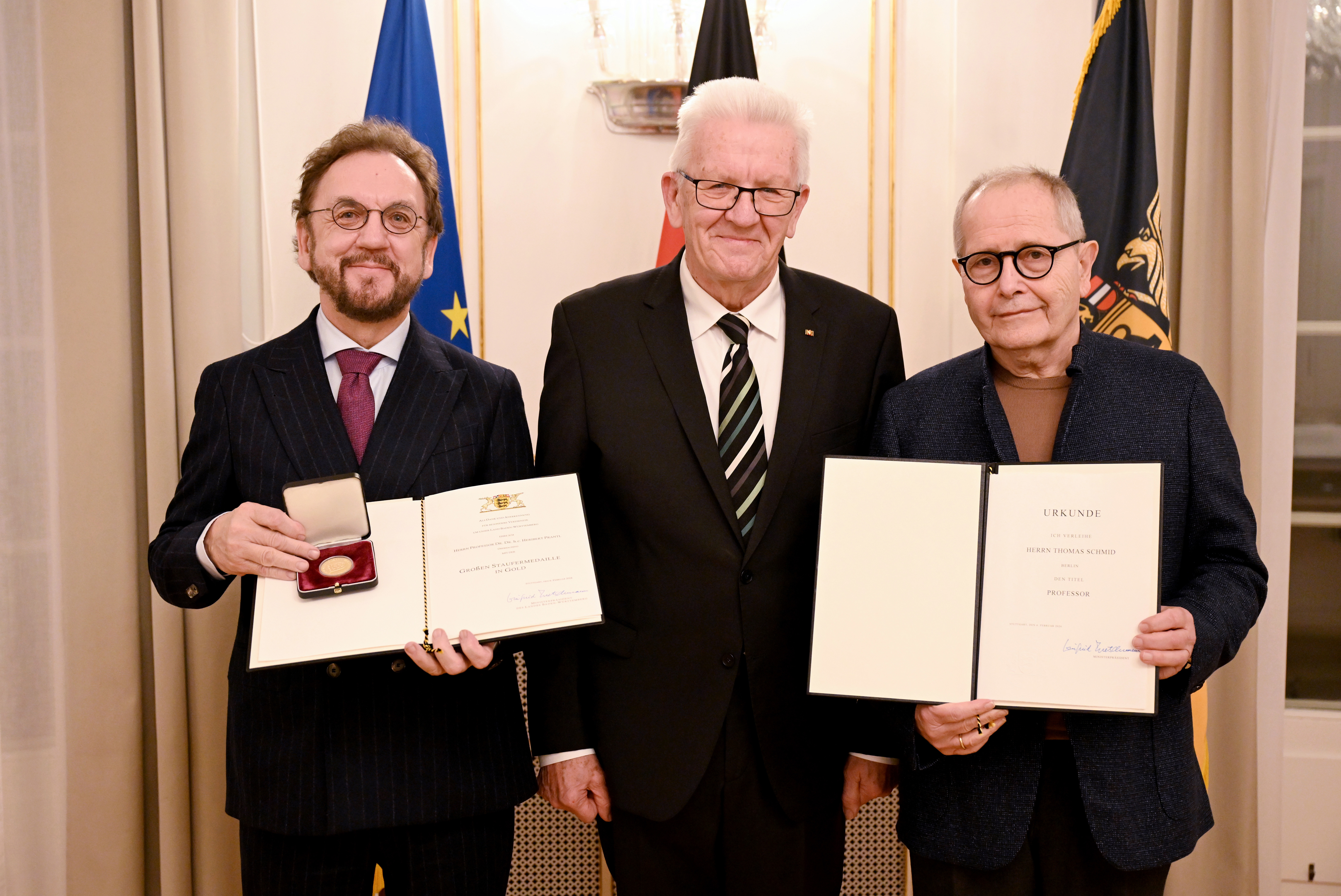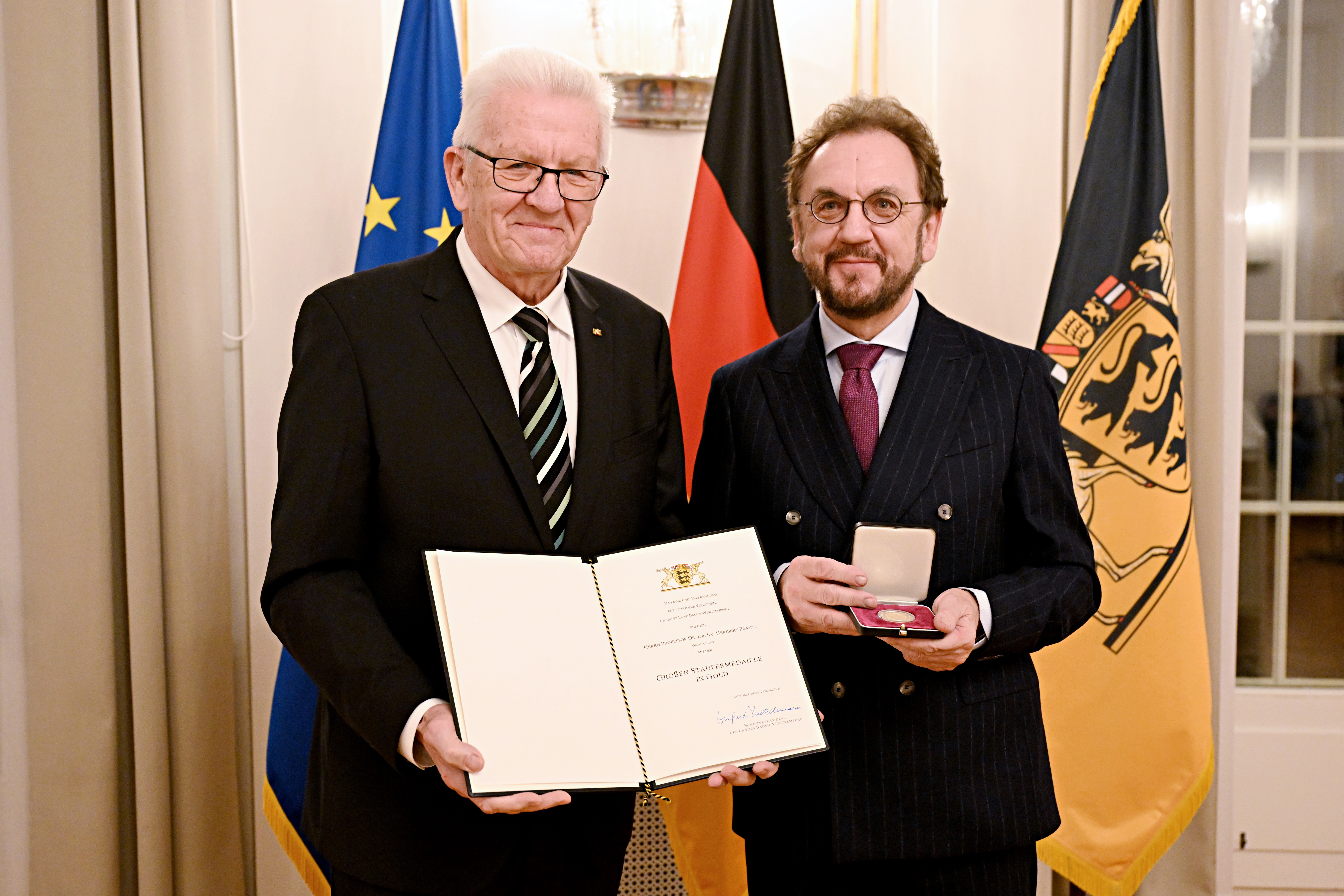 Ministerpräsident Winfried Kretschmann hat Heribert Prantl mit der Großen Staufermedaille in Gold ausgezeichnet und Thomas Schmid den Ehrentitel Professor verliehen. Verlässlicher Journalismus sei das Fundament jeder Demokratie, betonte der Regierungschef.