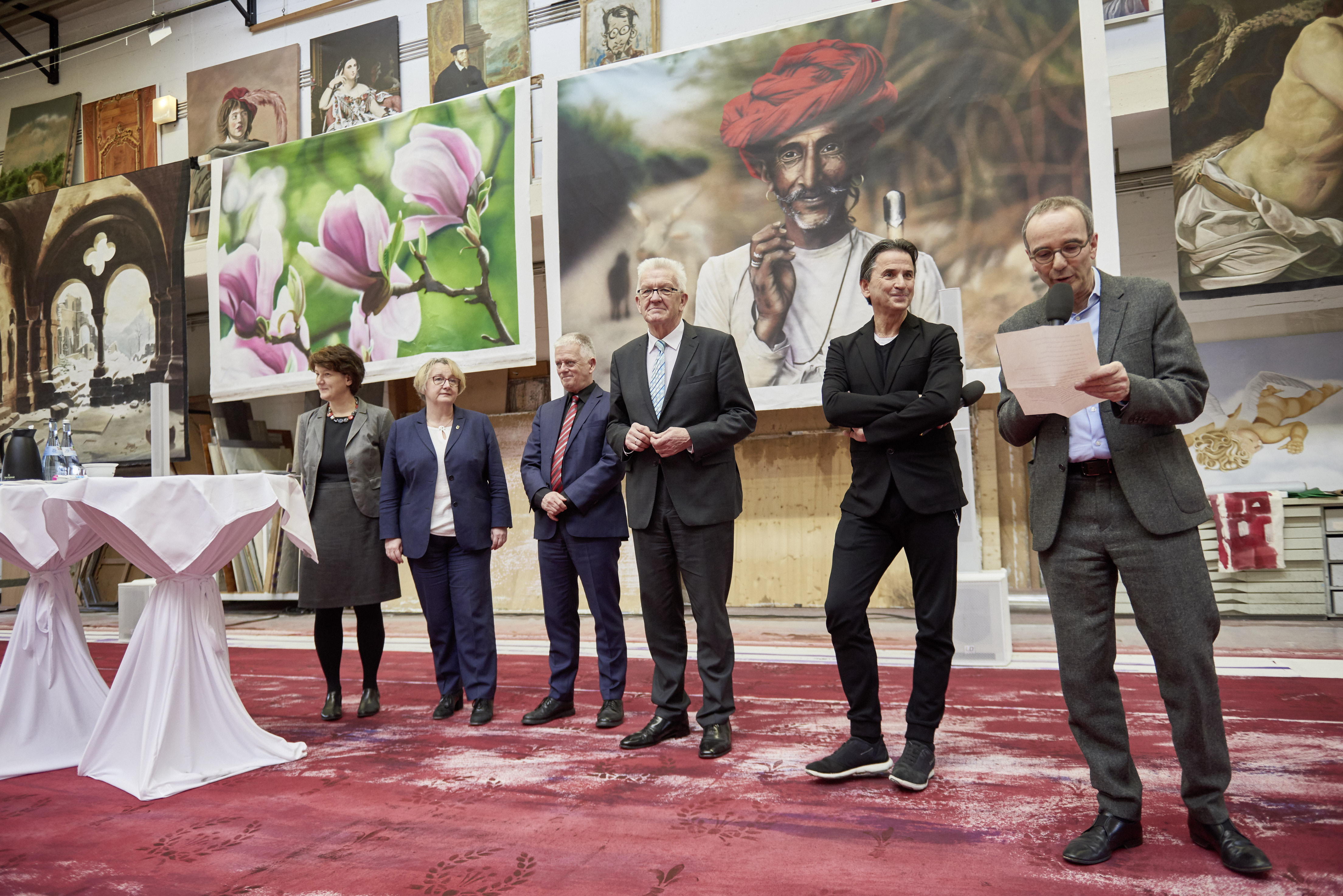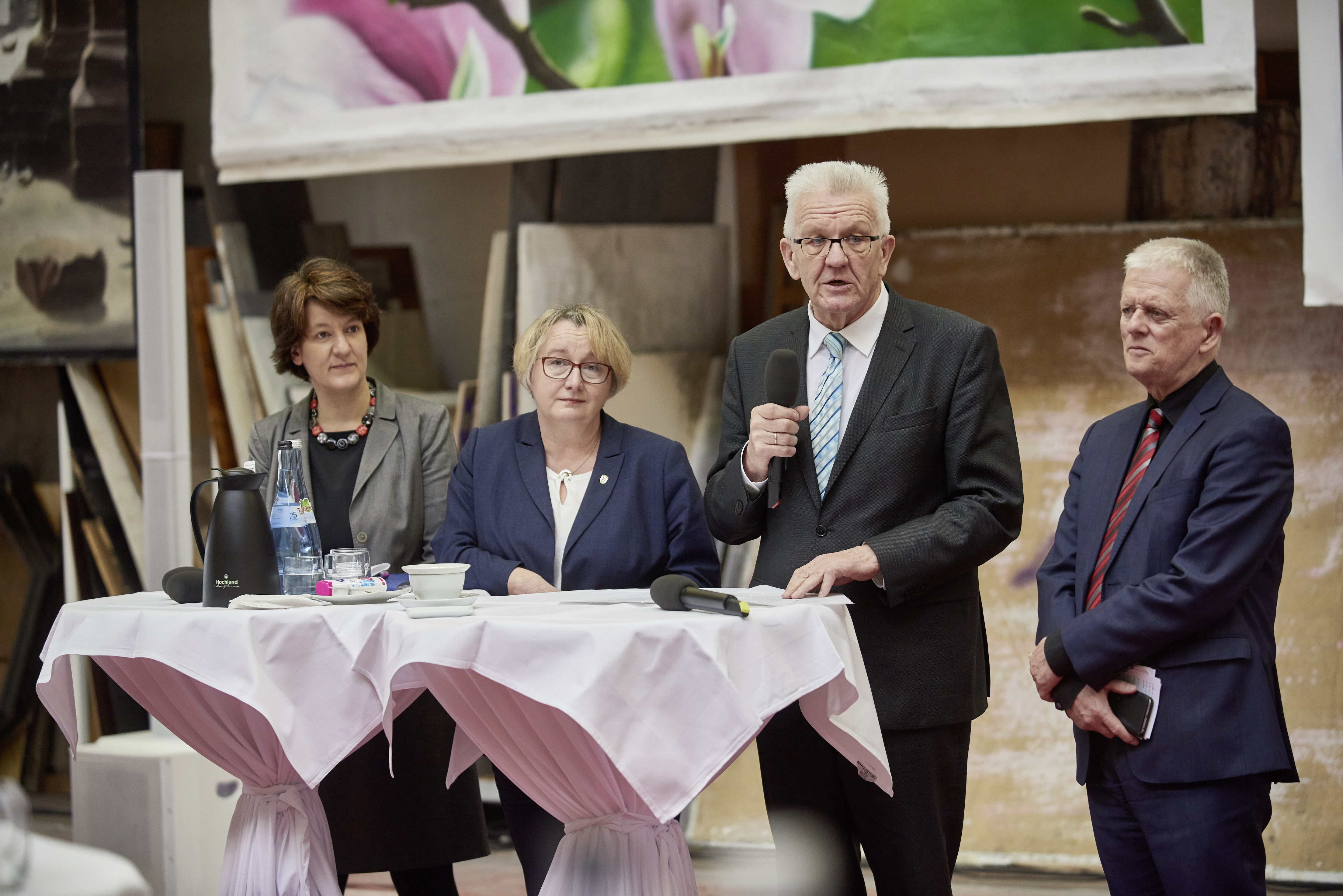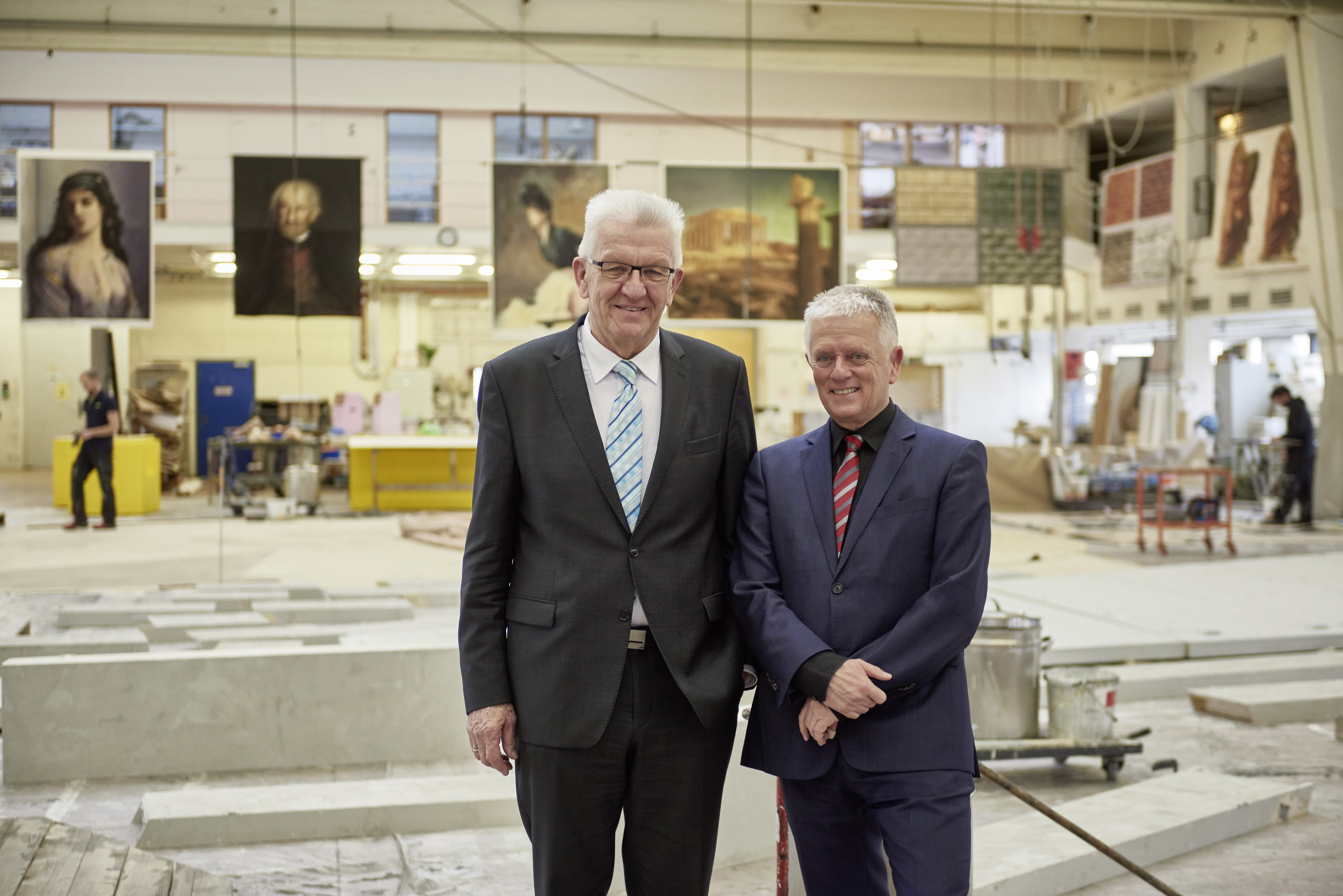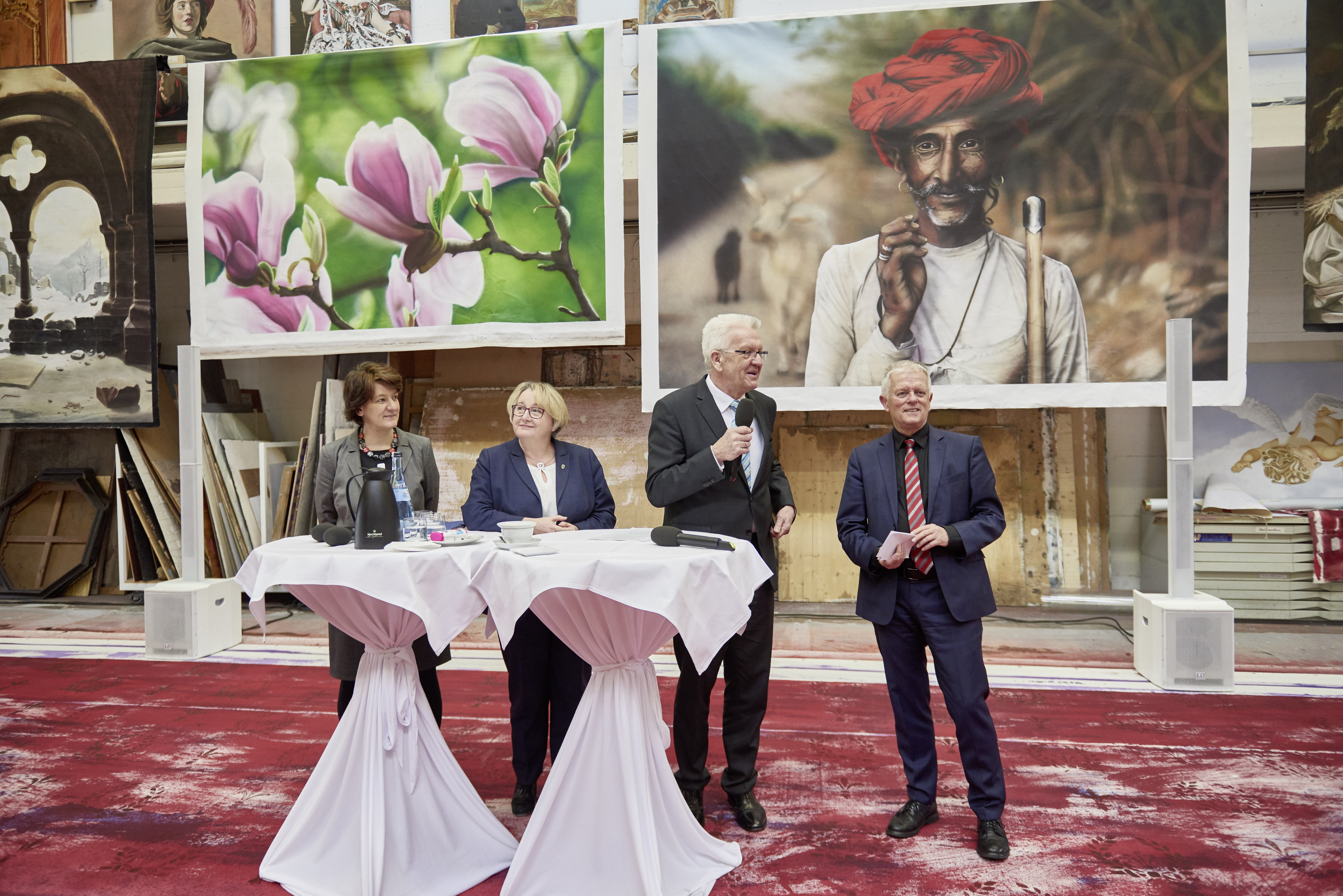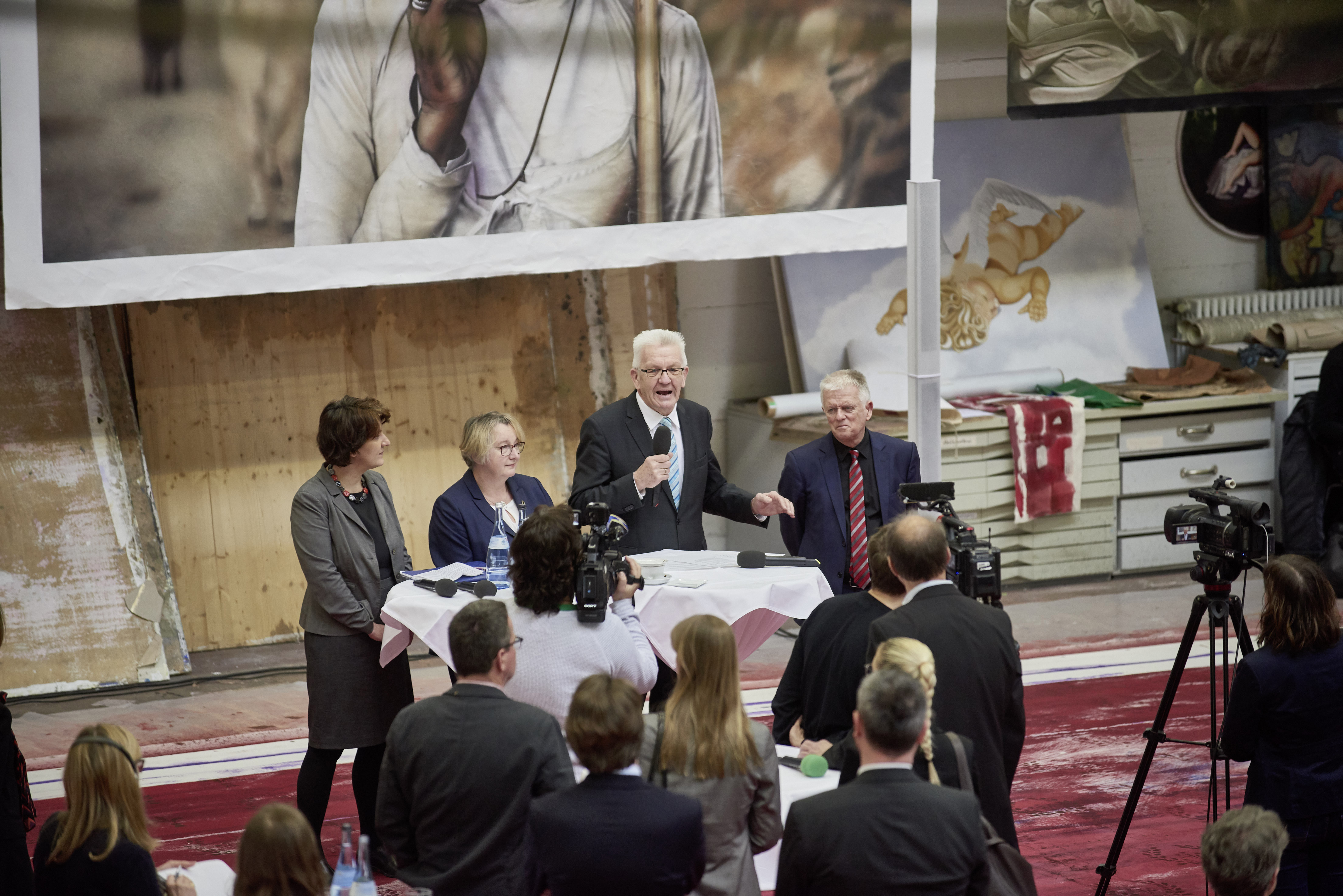 Die anstehende Sanierung der Stuttgarter Oper ist eine Jahrhundertaufgabe. Hinter den Kulissen des Hauses haben Ministerpräsident Winfried Kretschmann, die Ministerin für Wissenschaft, Forschung und Kunst, Theresia Bauer, die Staatssekretärin im Ministerium für Finanzen, Gisela Splett, und Stuttgarts Oberbürgermeister Fritz Kuhn für Vertreterinnen und Vertreter der Presse den „Maschinenraum“ des denkmalgeschützten Opernbaus von Max Littmann, den Malsaal, geöffnet. Sie haben dort über die Stuttgarter Oper und das Ballett als einzigartige Heimat für Hochkultur und für Kreative, Querdenkerinnen und Querdenker und alle Bürgerinnen und Bürger gesprochen.