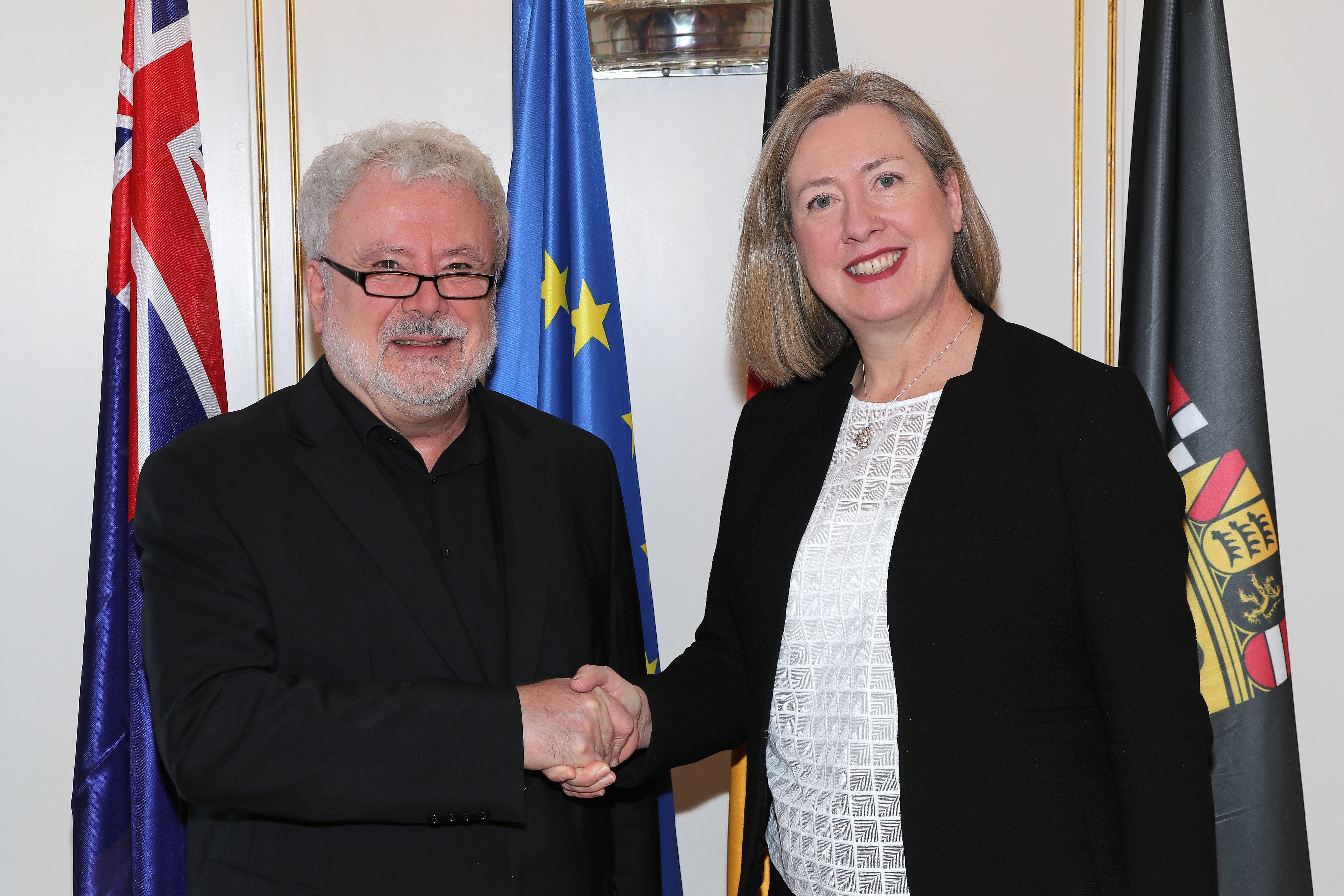 Staatsminister Klaus-Peter Murawski hat die australische Botschafterin Lynette Wood zu einem Antrittsbesuch in der Villa Reitzenstein in Stuttgart.