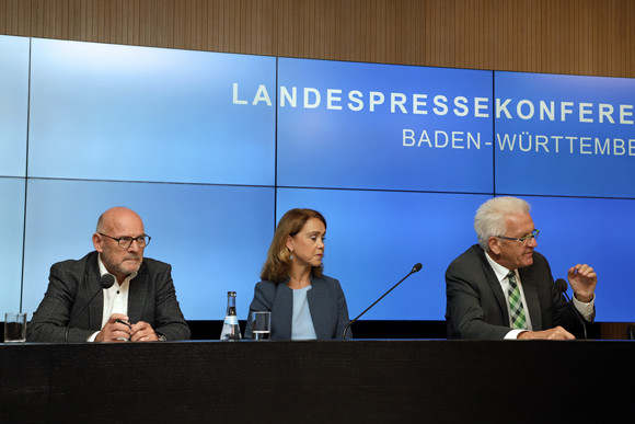 Ministerpräsident Winfried Kretschmann, Verkehrsminister Winfried Hermann und Kunststaatssekretärin Petra Olschowski haben in der Regierungspressekonferenz in Stuttgart über die Planung und den Bau von Radschnellwegen sowie die Kulturförderung berichtet und Fragen der Journalisten beantwortet.