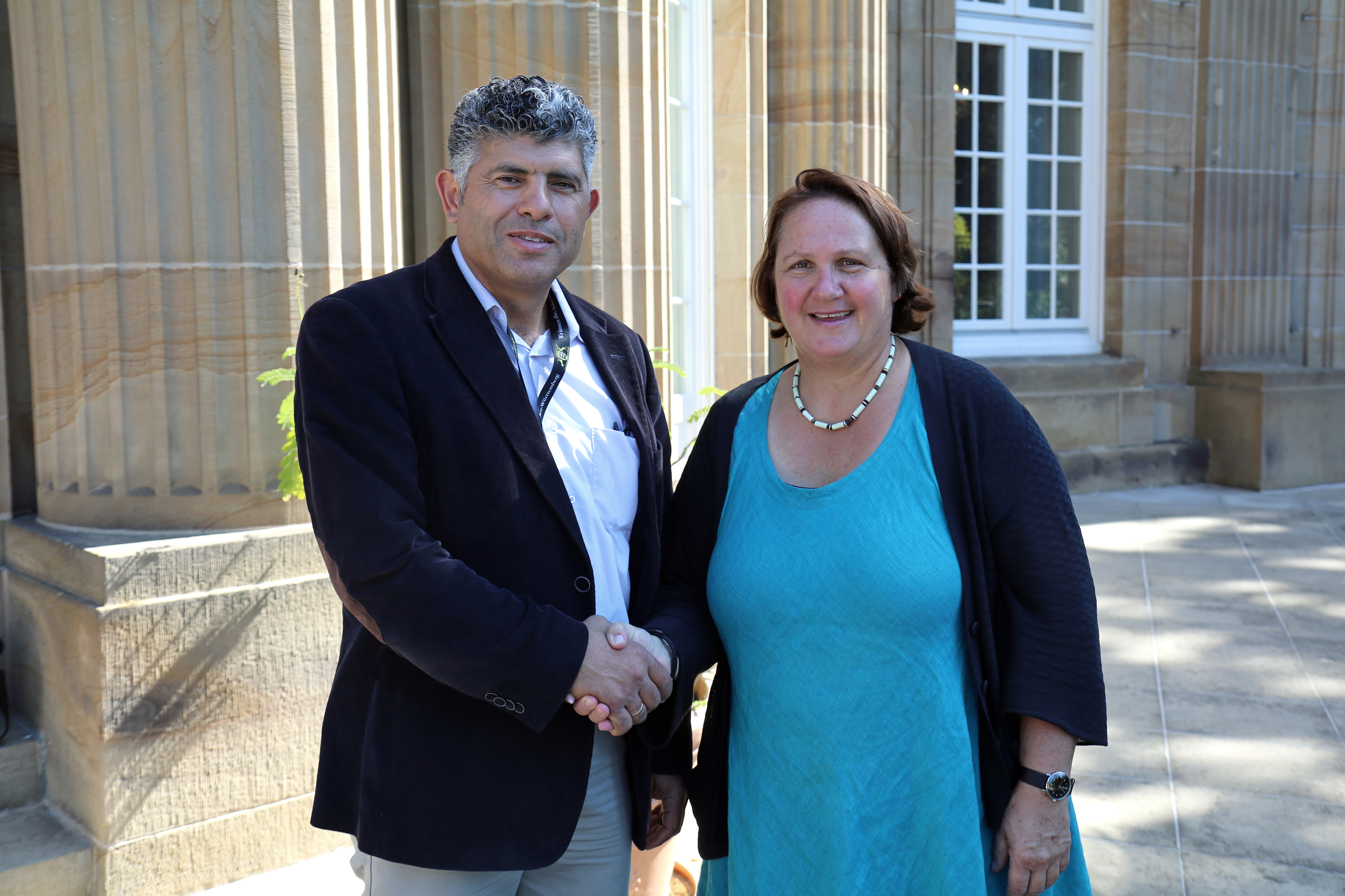 Staatssekretärin Theresa Schopper hat Daoud Nassar, Gründer des Projekts „Tent of Nations – Zelt der Völker“ im Westjordanland, und die Vorstandsmitglieder des Vereins „Bildung und Begegnung Palästina e. V.“ in der Villa Reitzenstein in Stuttgart zu einem Gespräch empfangen.
