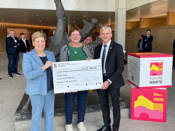 Die Ministerin für Landesentwicklung und Wohnen, Nicole Razavi MdL, überreichte am 9. April 2025 im Stuttgarter Landtag symbolische Schecks an fünf Denkmaleigentümerinnen und -eigentümer aus Baden-Württemberg. Das Land unterstützt sie bei der Sanierung ihrer Kulturdenkmale jeweils mit einer Förderung im Rahmen der ersten Tranche des Denkmalförderprogramms 2025.