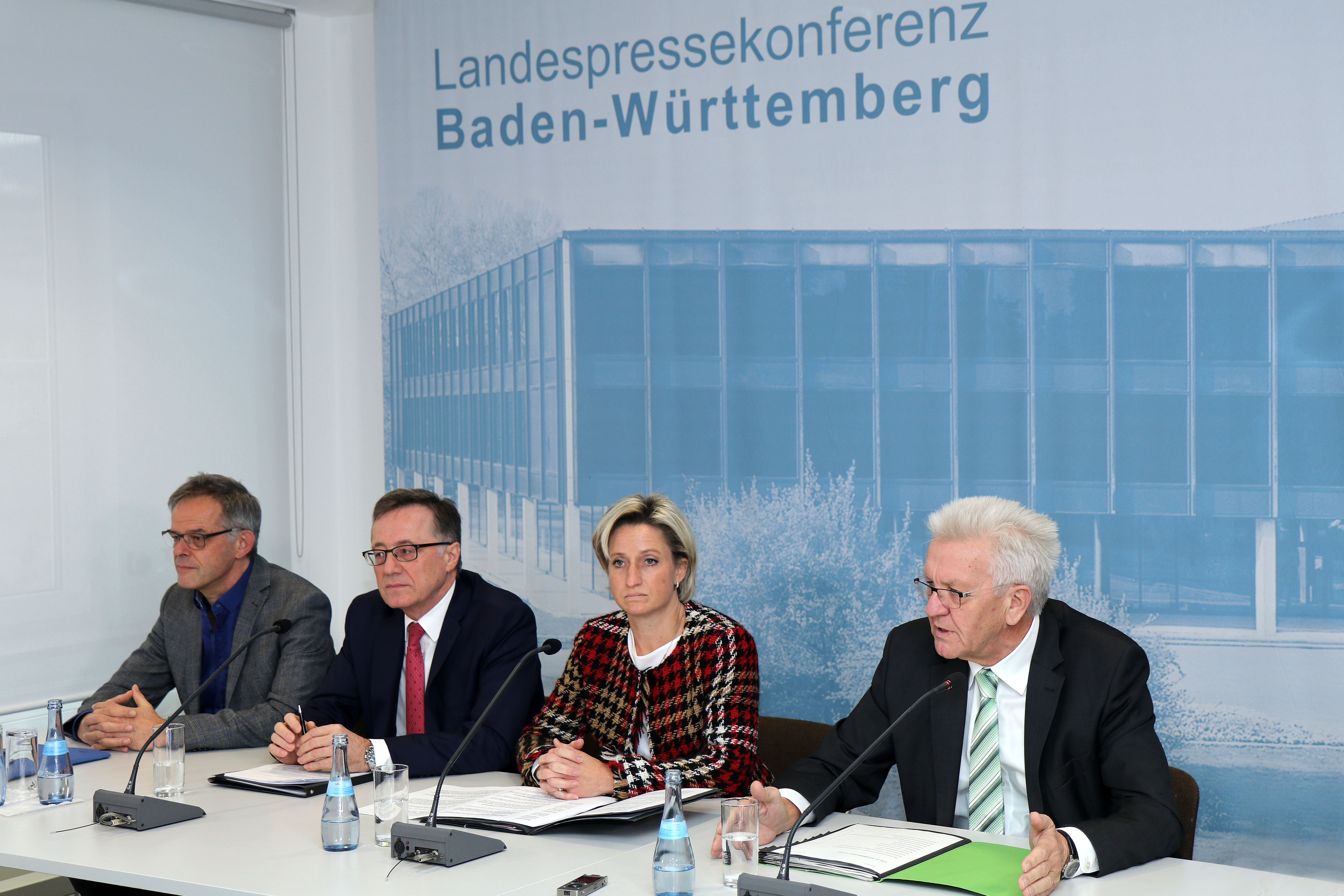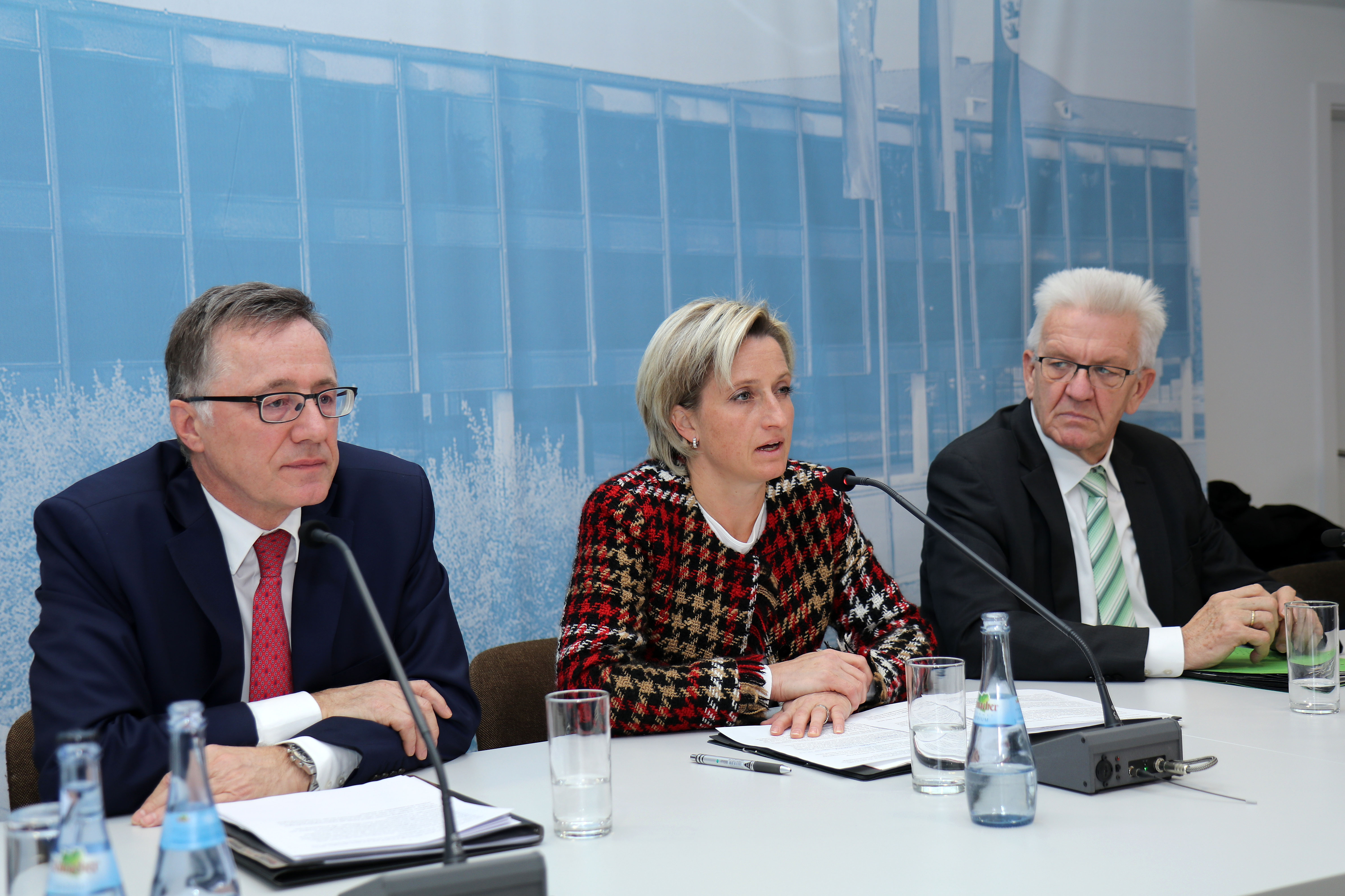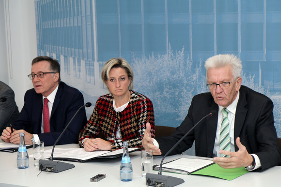 Ministerpräsident Winfried Kretschmann und Wirtschaftsministerin Dr. Nicole Hoffmeister-Kraut haben in der Regierungspressekonferenz in Stuttgart den Leiter des Fraunhofer Instituts für Arbeitswirtschaft und Organisation (IAO) in Stuttgart, Professor Dr. Wilhelm Bauer, als neuen Technologiebeauftragten des Landes vorgestellt und Fragen der Journalisten beantwortet.