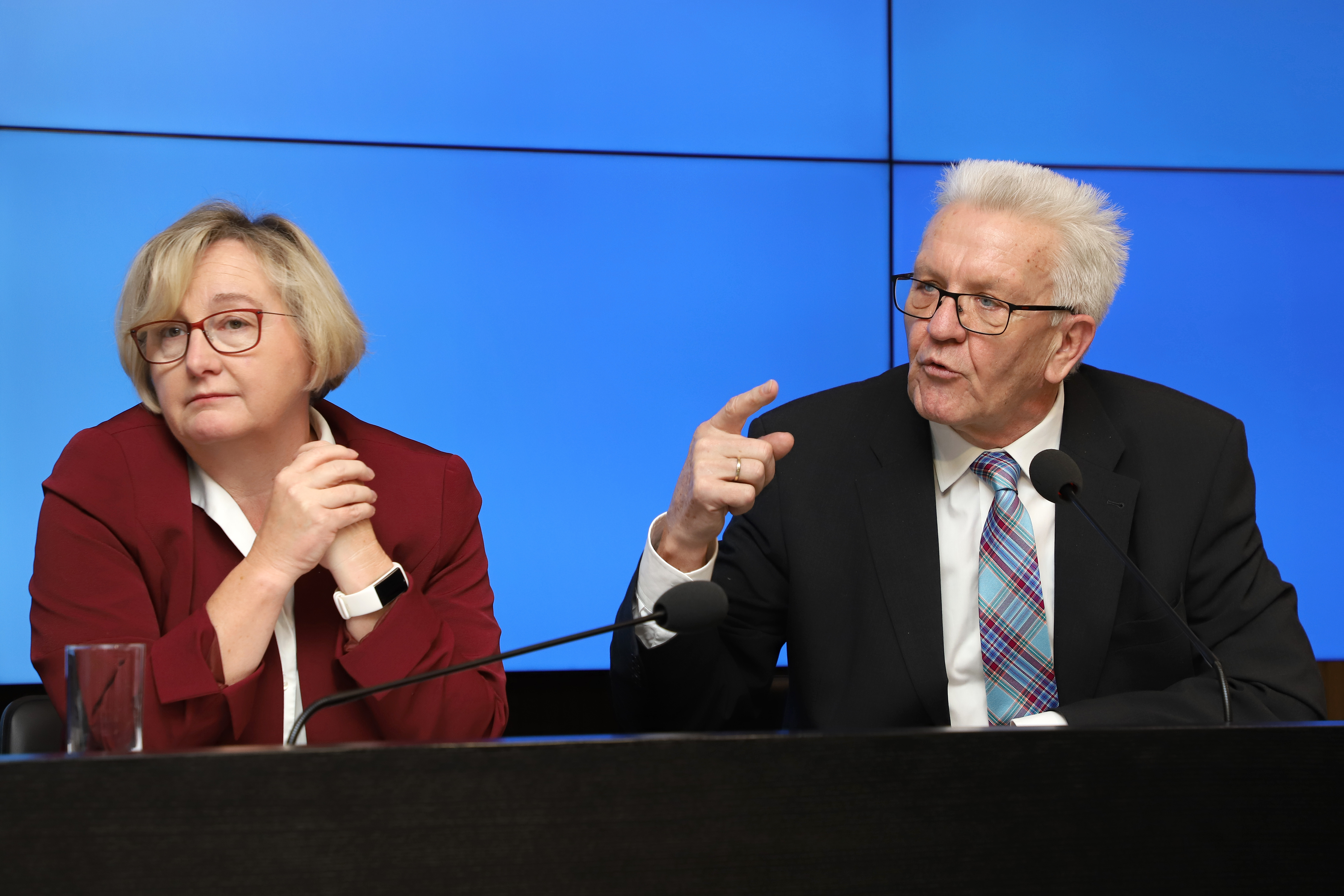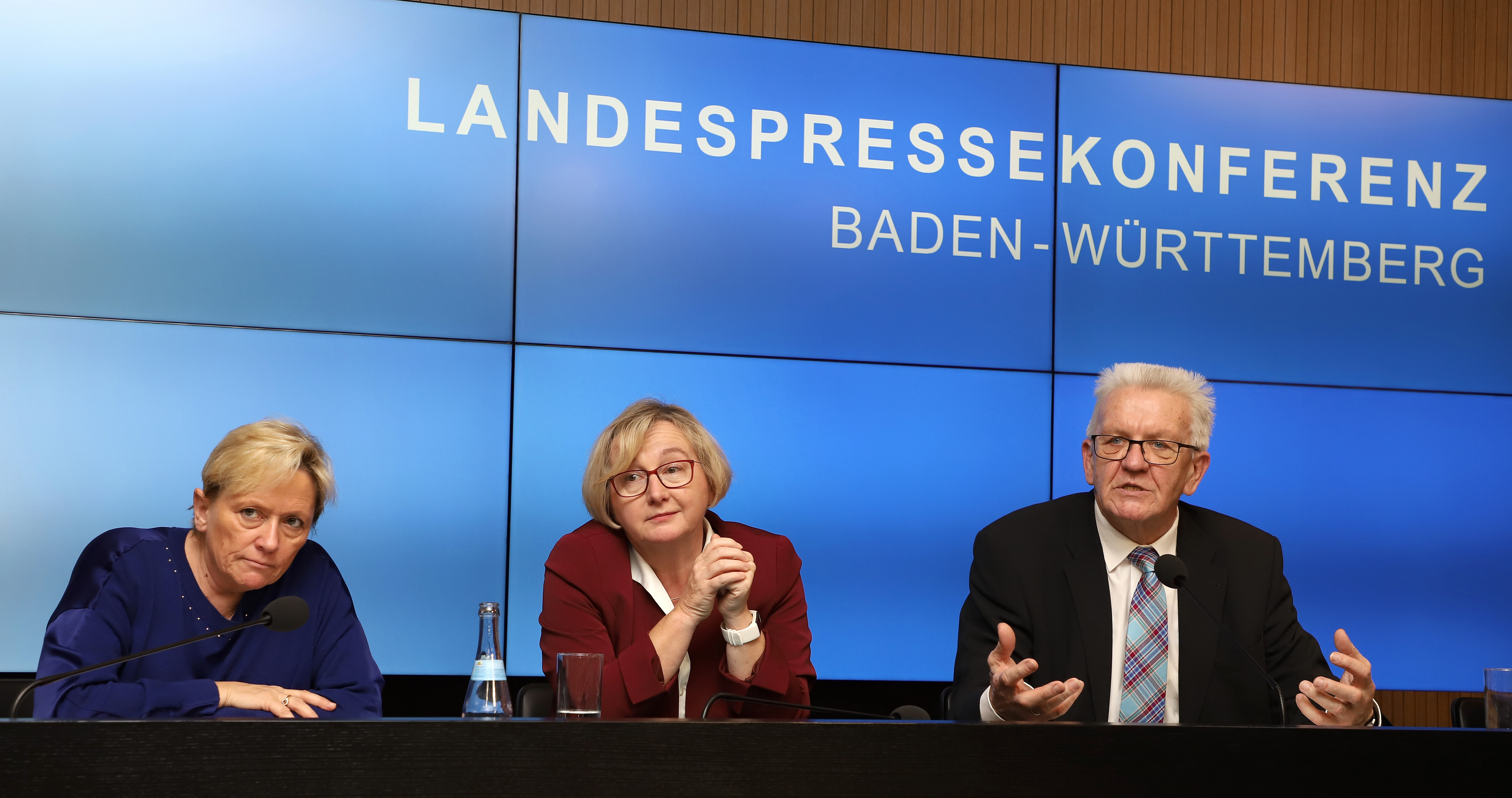 Ministerpräsident Winfried Kretschmann, Wissenschaftsministerin Theresia Bauer und Kultusministerin Susanne Eisenmann haben in der Regierungspressekonferenz in Stuttgart über die zweite Förderlinie der Exzellenzstrategie und den Islamischen Religionsunterricht im Land berichtet und Fragen der Journalisten beantwortet.