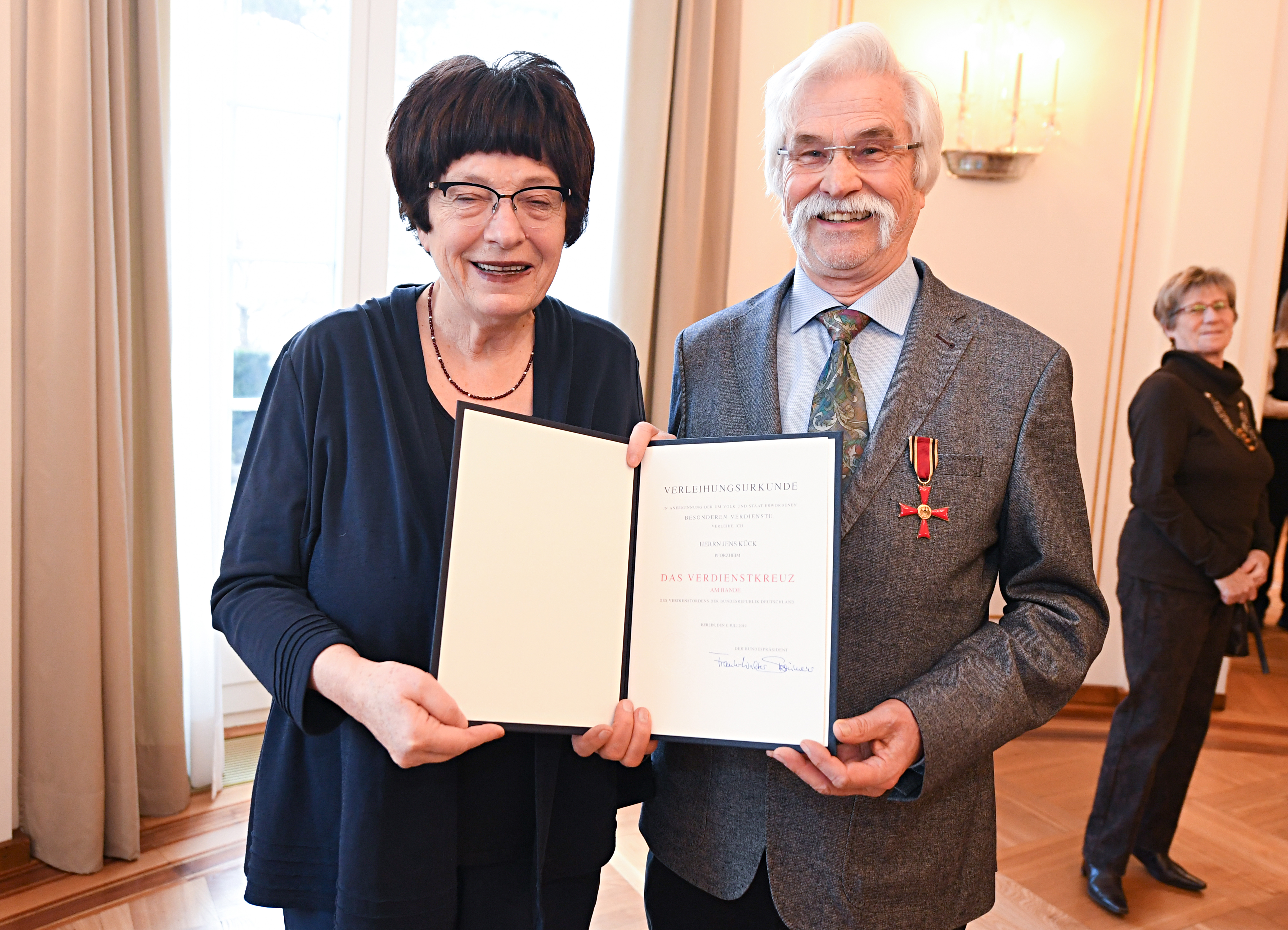 Staatsrätin Gisela Erler hat Jens Kück aus Pforzheim das Bundesverdienstkreuz überreicht und sein Engagement in den Bereichen Natur und Nachhaltigkeit gewürdigt.